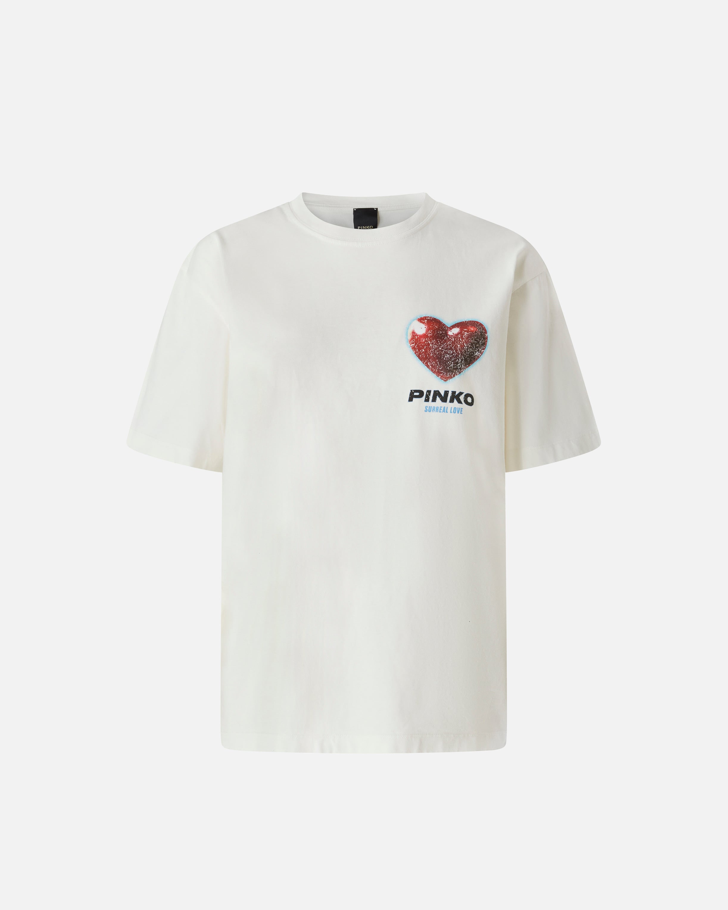 Camiseta de cuello redondo y media manga en punto de algodón. El modelo está personalizado con un estampado con efecto rayado, que se presenta en versión mini en el pecho en forma de pequeño corazón y logotipo de letras PINKO, y en versión maxi en la parte posterior, en forma de corazón rodeado por una serpiente. Esta camiseta combina fácilmente con tus pantalones favoritos y eleva tu look de forma sencilla, elegante y original.