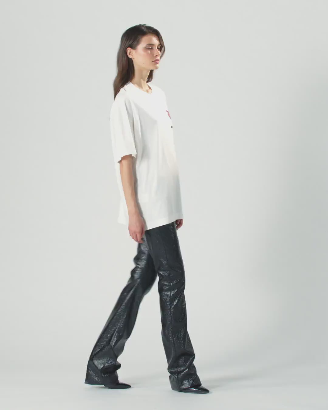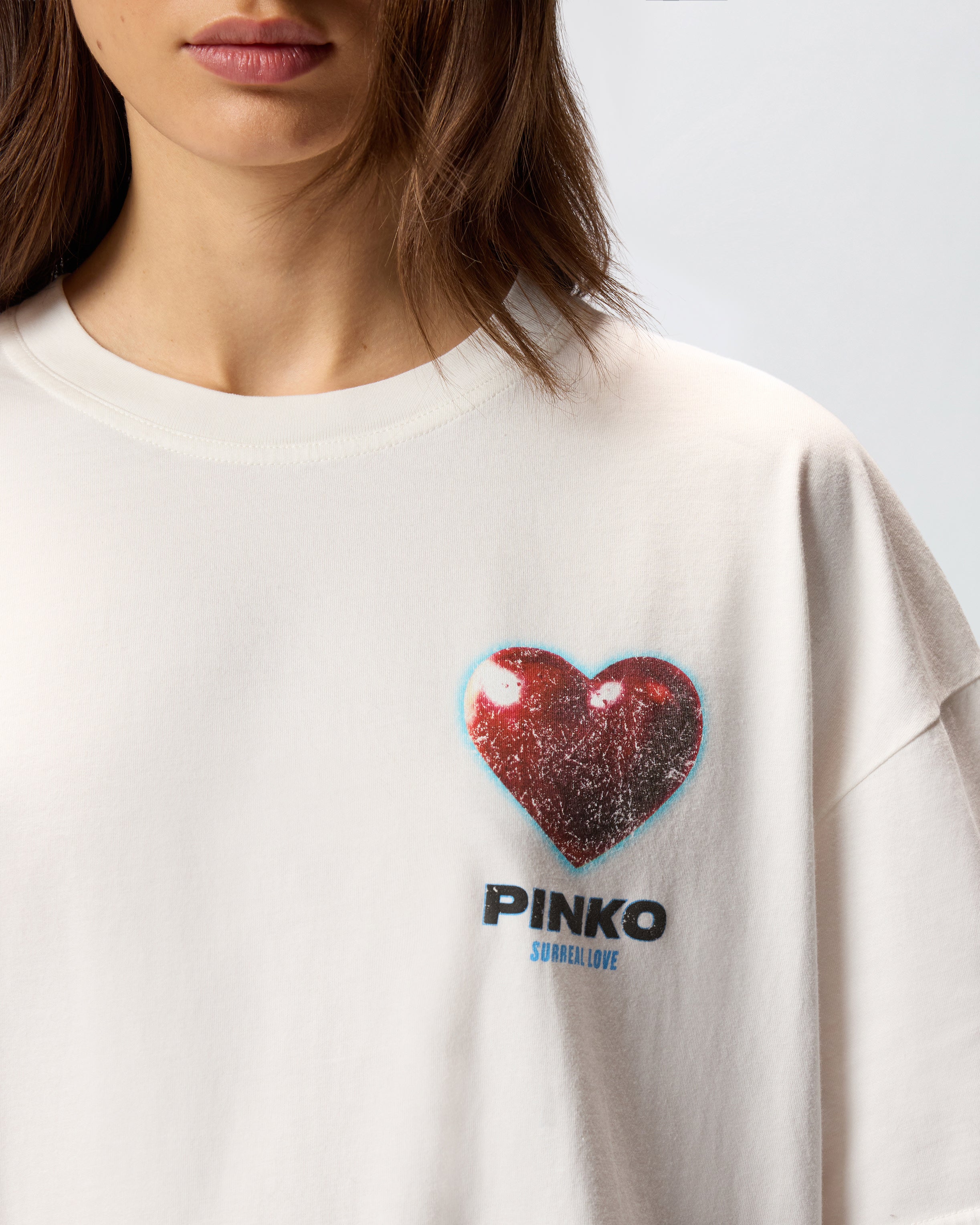 Camiseta de cuello redondo y media manga en punto de algodón. El modelo está personalizado con un estampado con efecto rayado, que se presenta en versión mini en el pecho en forma de pequeño corazón y logotipo de letras PINKO, y en versión maxi en la parte posterior, en forma de corazón rodeado por una serpiente. Esta camiseta combina fácilmente con tus pantalones favoritos y eleva tu look de forma sencilla, elegante y original.