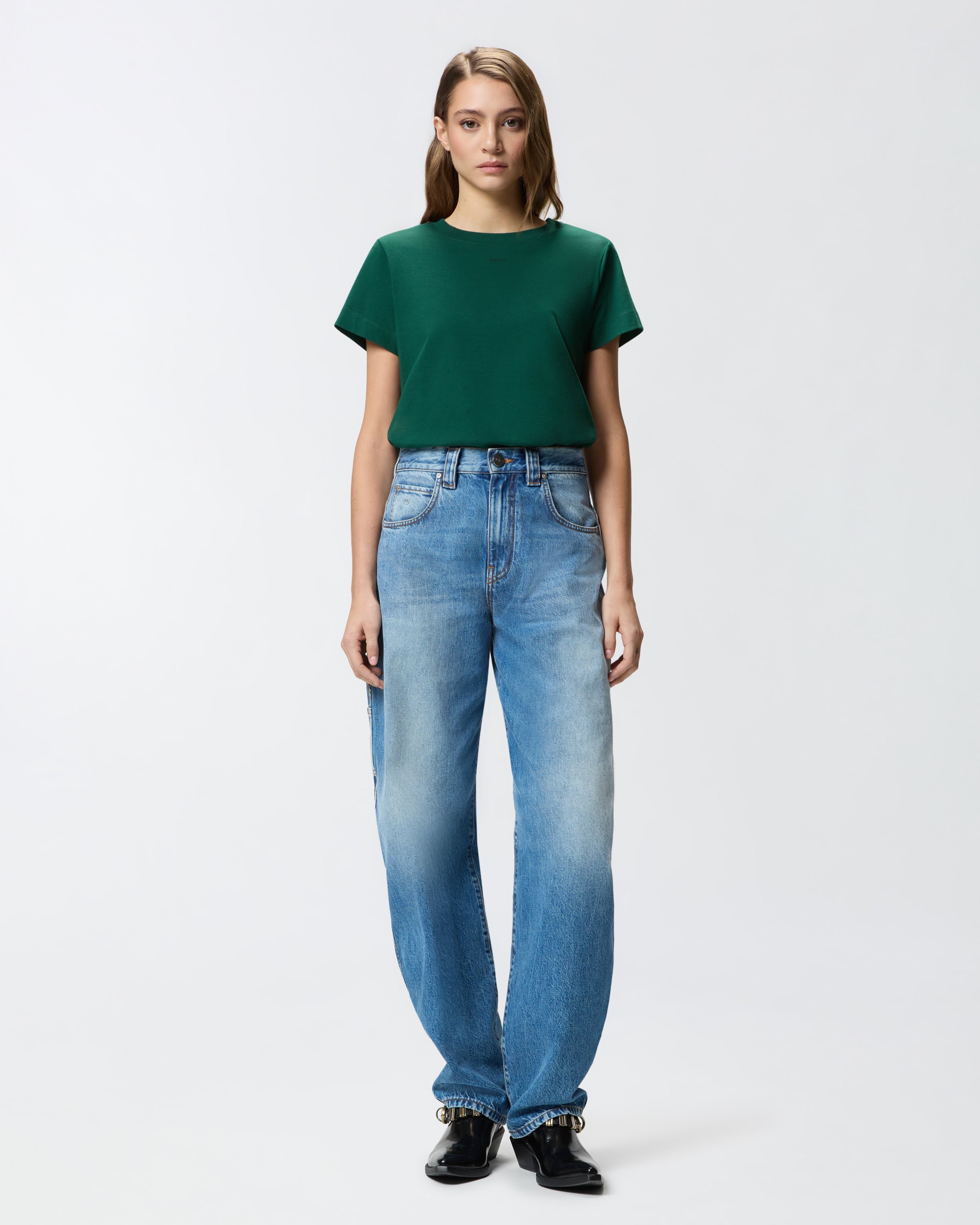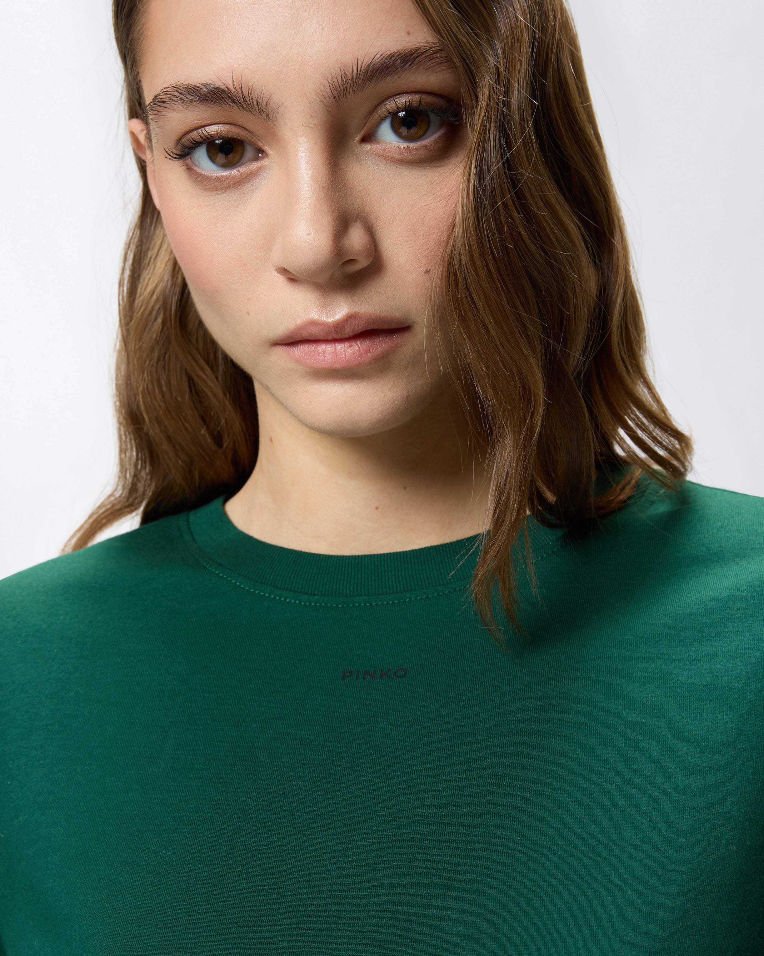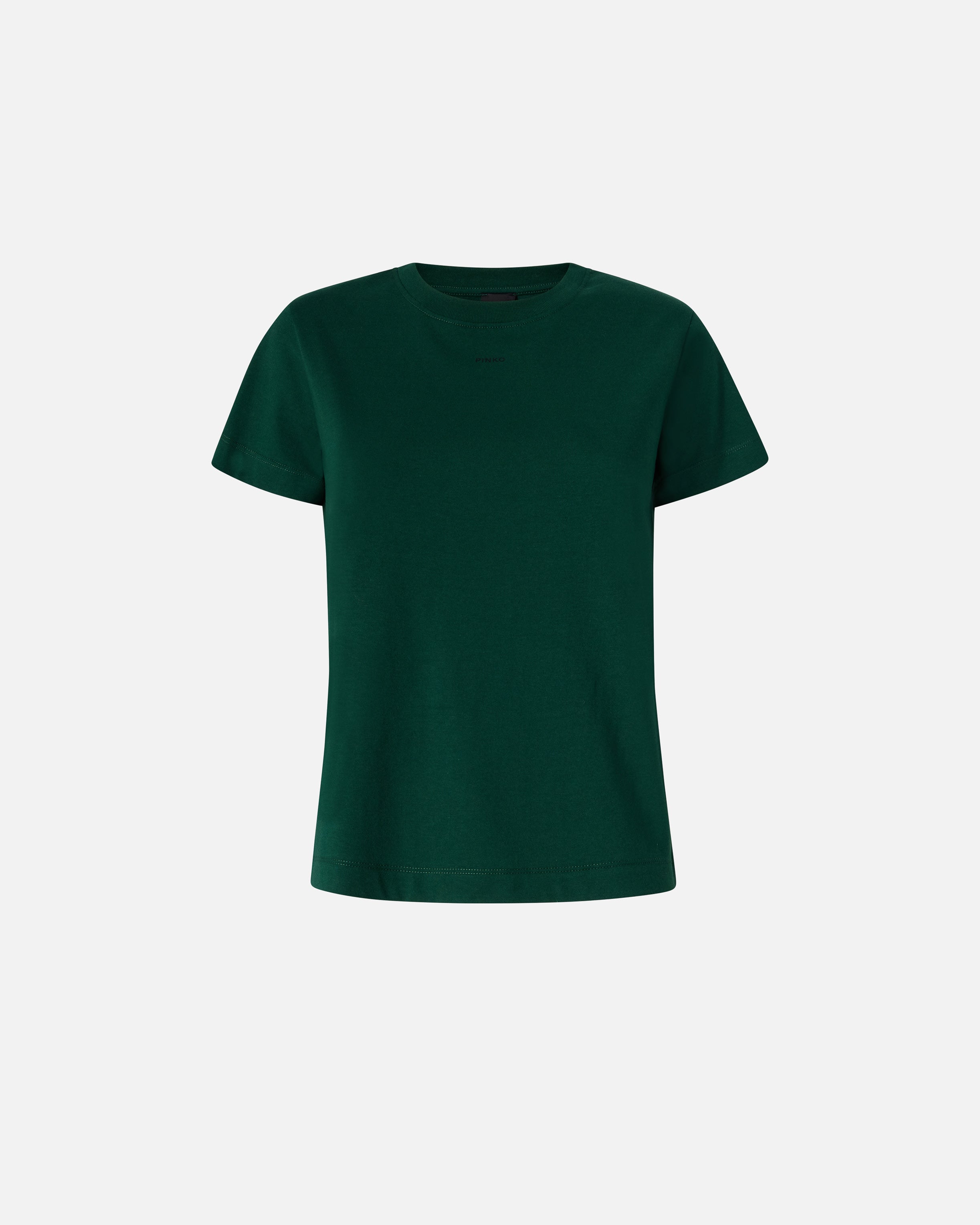 Camiseta de manga corta y ligeramente ceñida de punto de algodón con pequeño logotipo de letras PINKO estampado por delante. Esta camiseta combina fácilmente con tus pantalones favoritos y eleva tu look de forma sencilla, elegante y original.