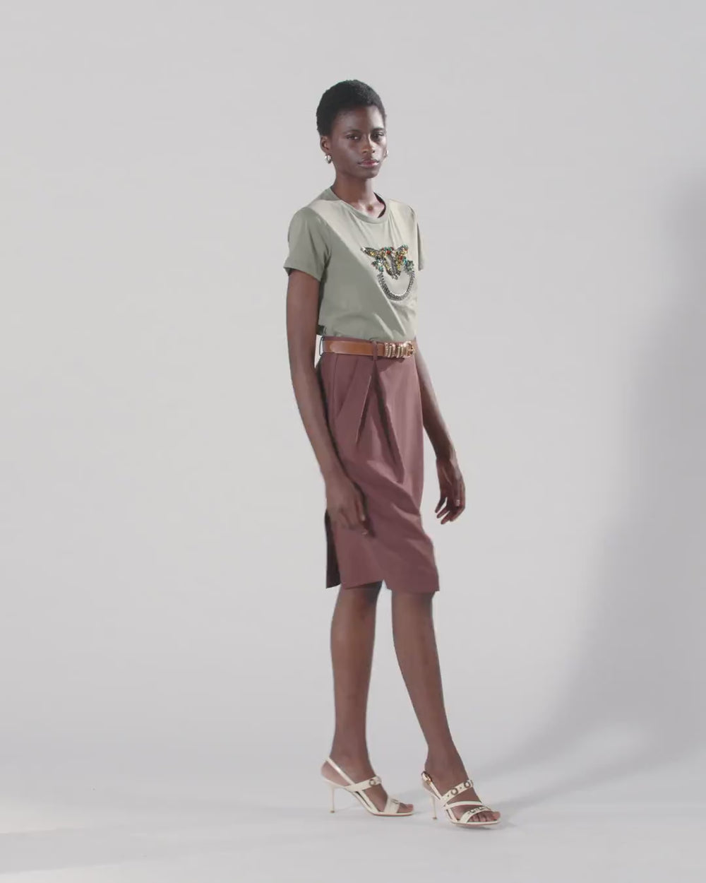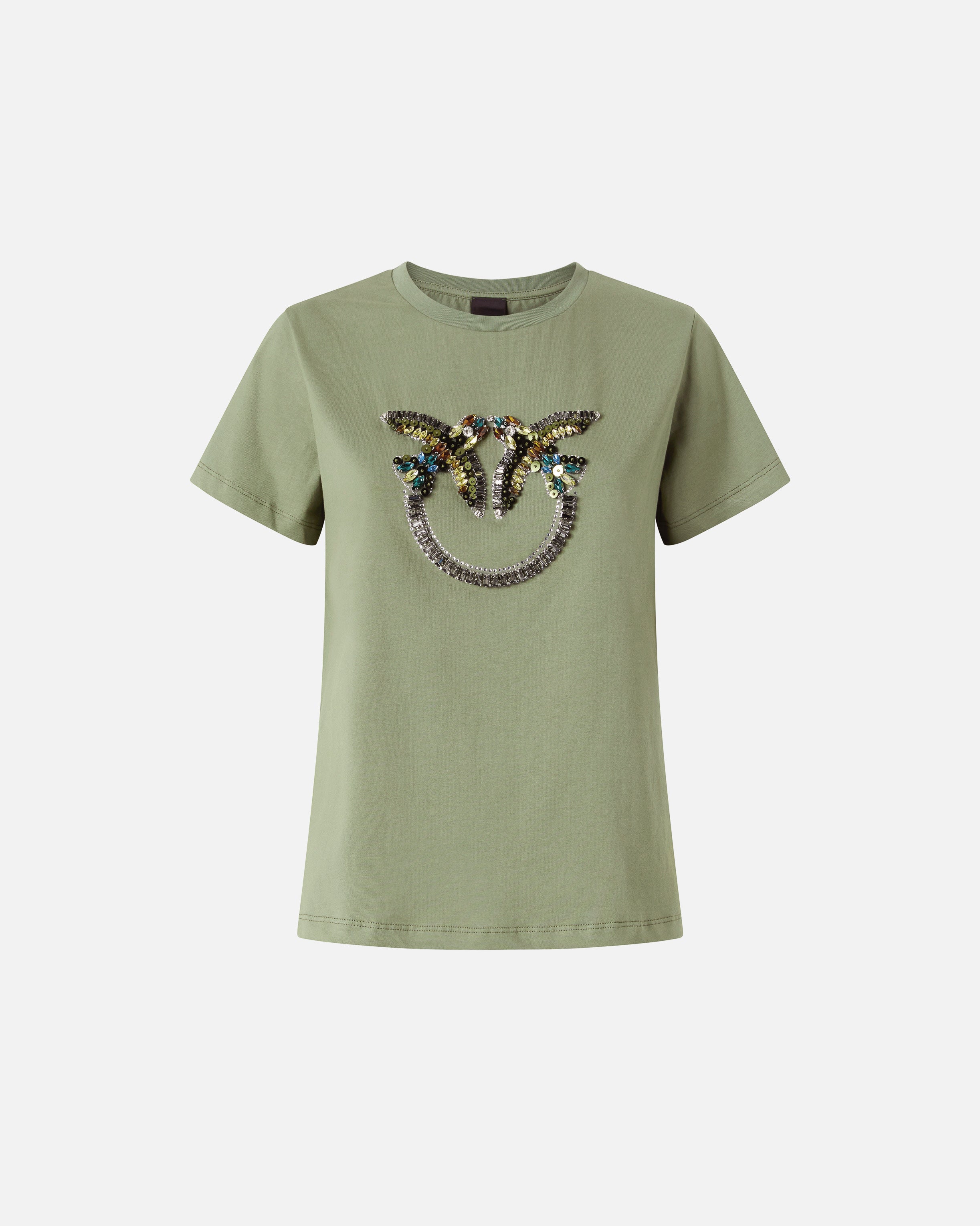 Camiseta de manga corta con cuello redondo confeccionada en suave punto de algodón. Las líneas esenciales del modelo se realzan con el maxibordado joya en el pecho formado por brillantes cristales y lentejuelas multicolores que dan vida al inconfundible logotipo Love Birds. Ponte la camiseta con tus vaqueros favoritos para dar a tus conjuntos informales un toque brillante al más puro estilo PINKO.