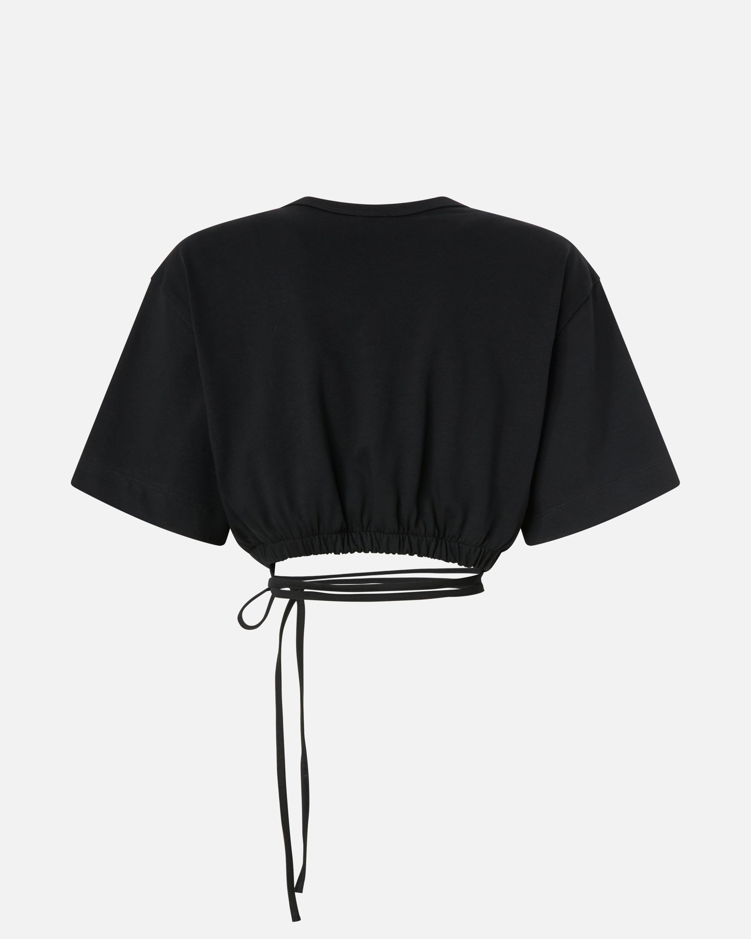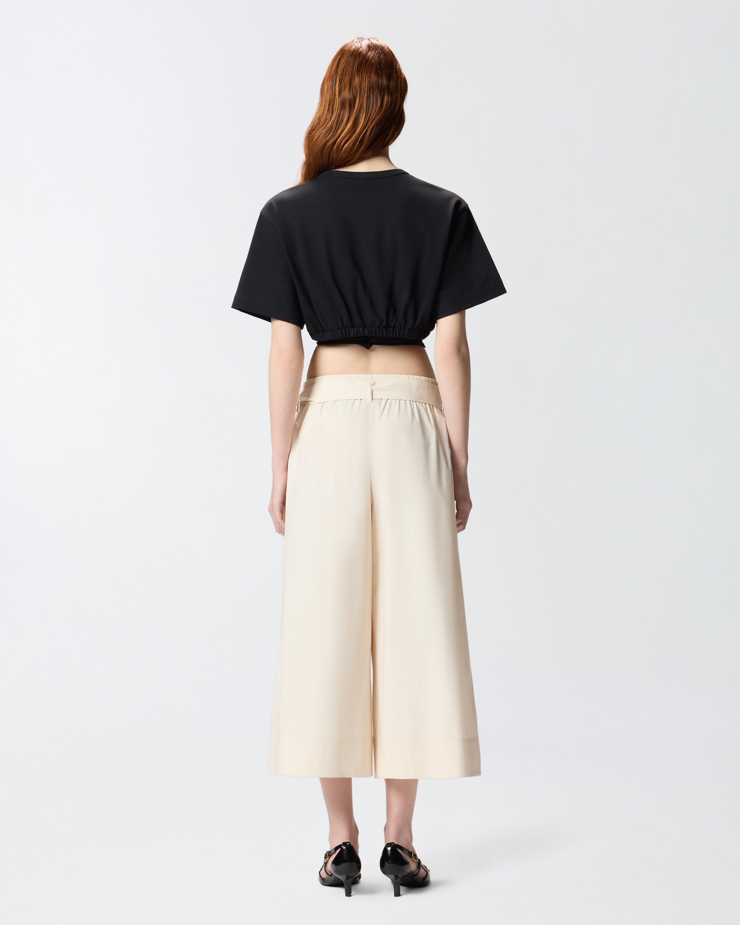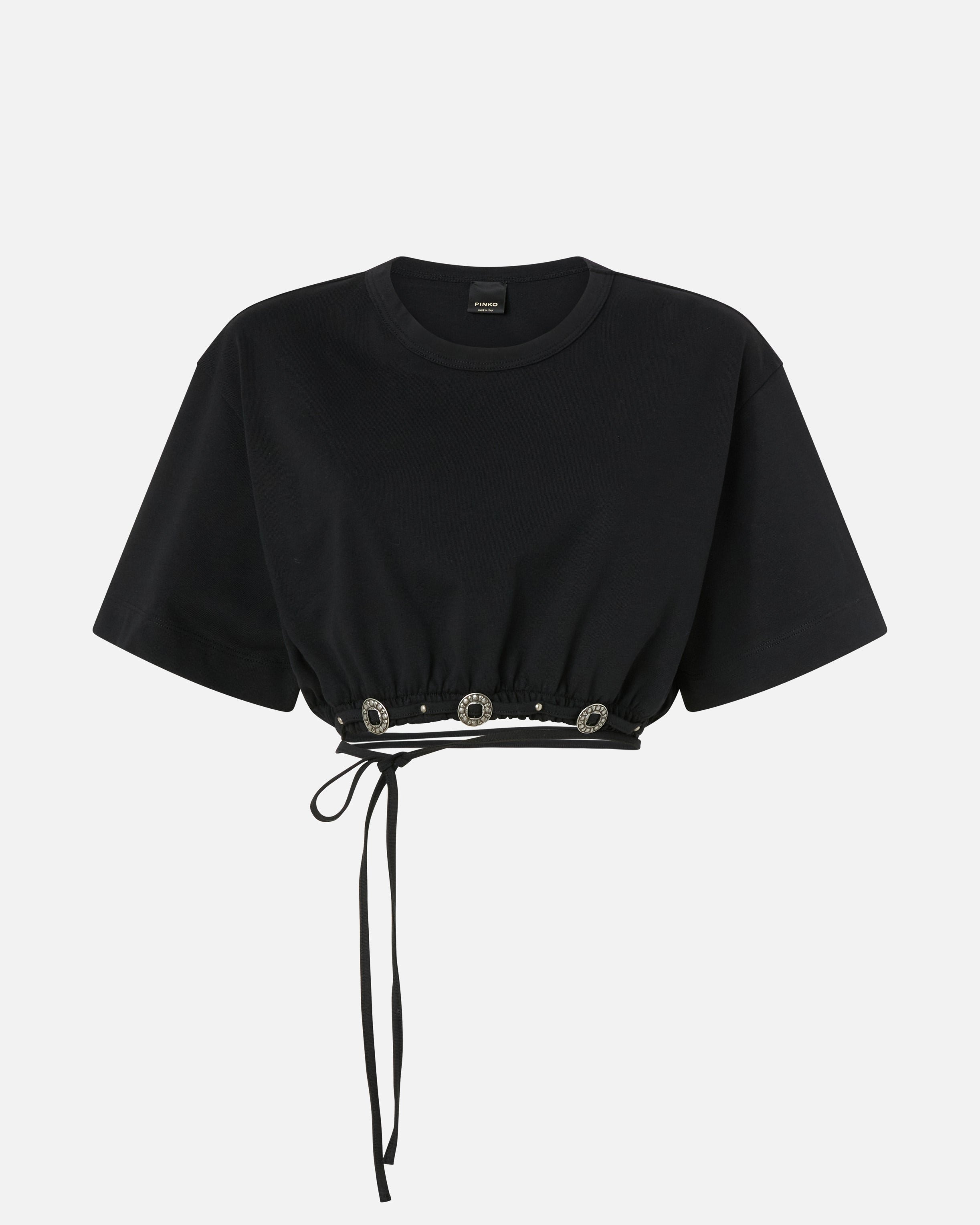 Camiseta corta de media manga confeccionada en punto doble de puro algodón de tacto suave y compacto. El modelo se caracteriza por un bajo elástico con un cordón que rodea la cintura y se anuda a voluntad, adornado con microtachuelas y hebillas en forma de trabilla de inspiración texana con un acabado plateado envejecido. Luce la camiseta con los pantalones a juego para un look veraniego que no deja nada al azar.