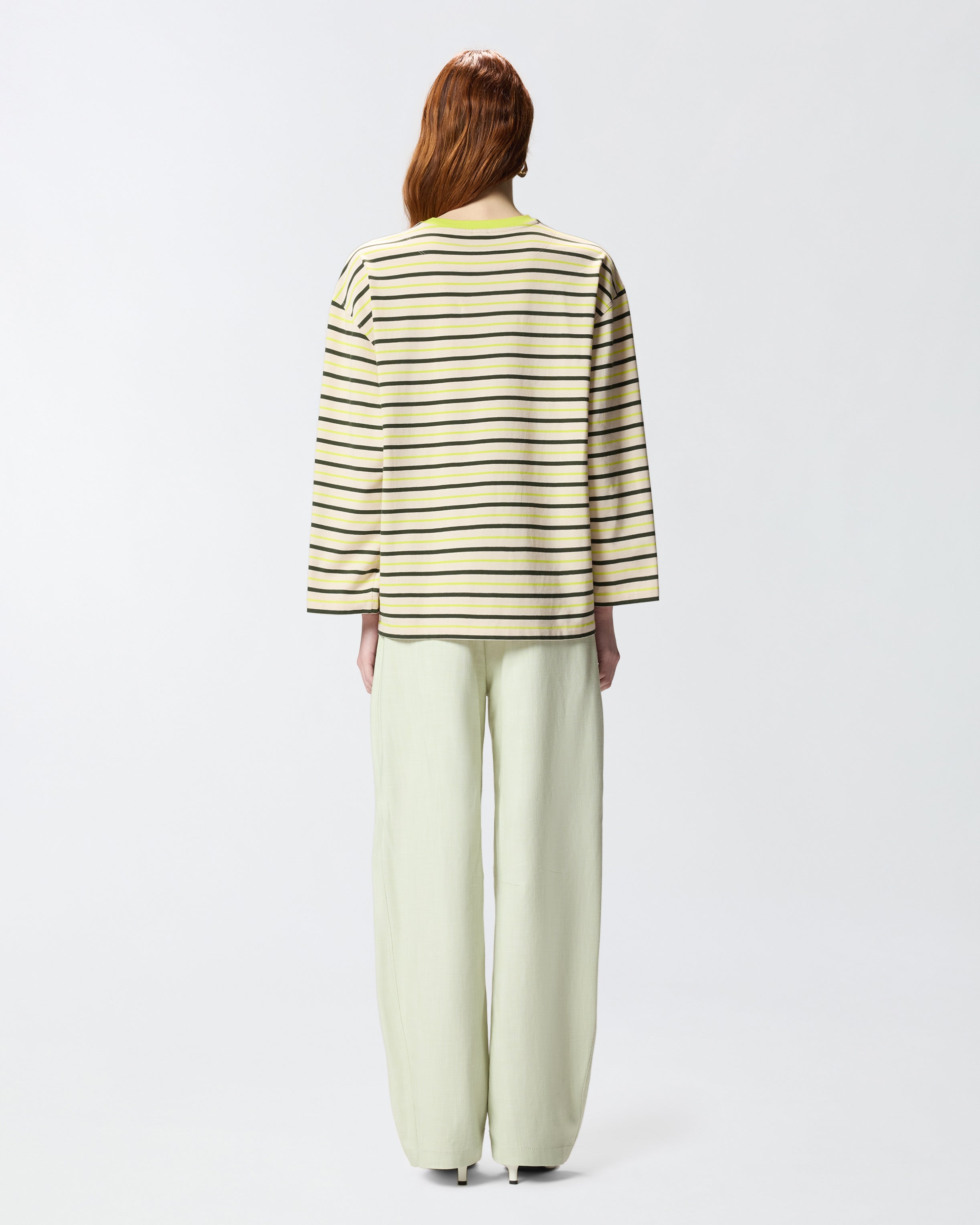 Camiseta de cuello redondo con manga larga amplia y hombros caídos, confeccionada en suave y cómodo punto de puro algodón. El modelo se caracteriza por un motivo integral de rayas, un cuello redondo a contraste y un pequeño bordado con la inscripción PINKO en cursiva en el lado izquierdo. Una prenda que combina estilo urbano y espíritu contemporáneo, para completar tus conjuntos de verano al más puro estilo PINKO. - TANNINO TOP