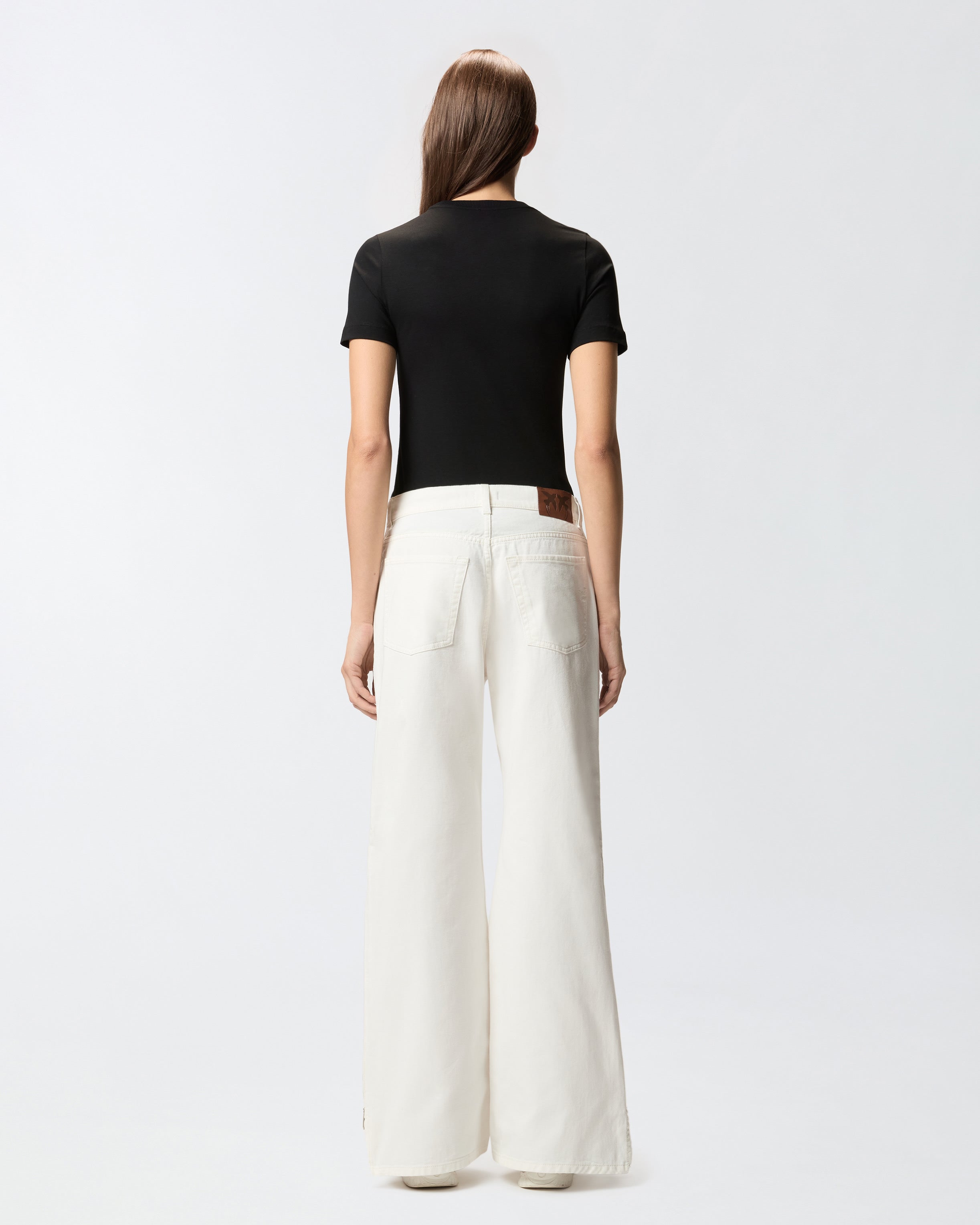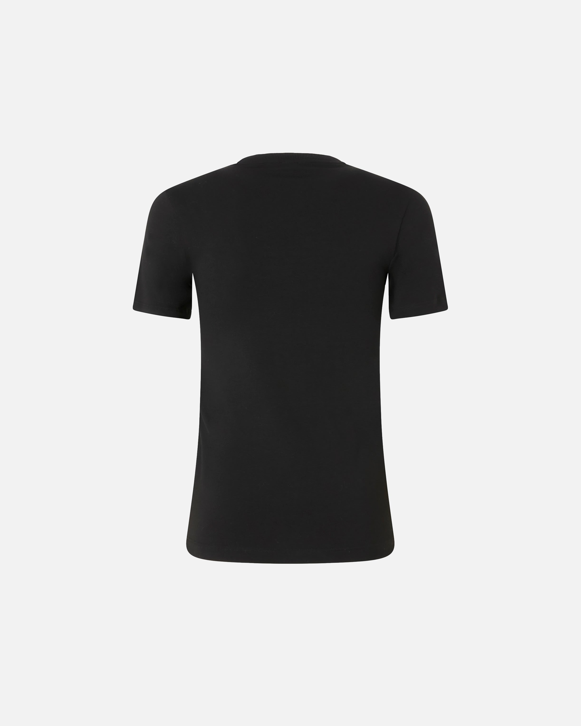Camiseta de manga corta con cuello redondo de canalé, confeccionada en punto de algodón elástico y propuesta en un corte ceñido. Un estampado floral adorna la parte delantera del modelo en la parte izquierda, con el logotipo de letras PINKO que destaca entre los pétalos de las flores. Una prenda versátil, fácil de llevar con unos vaqueros o bajo la chaqueta para un look informal.