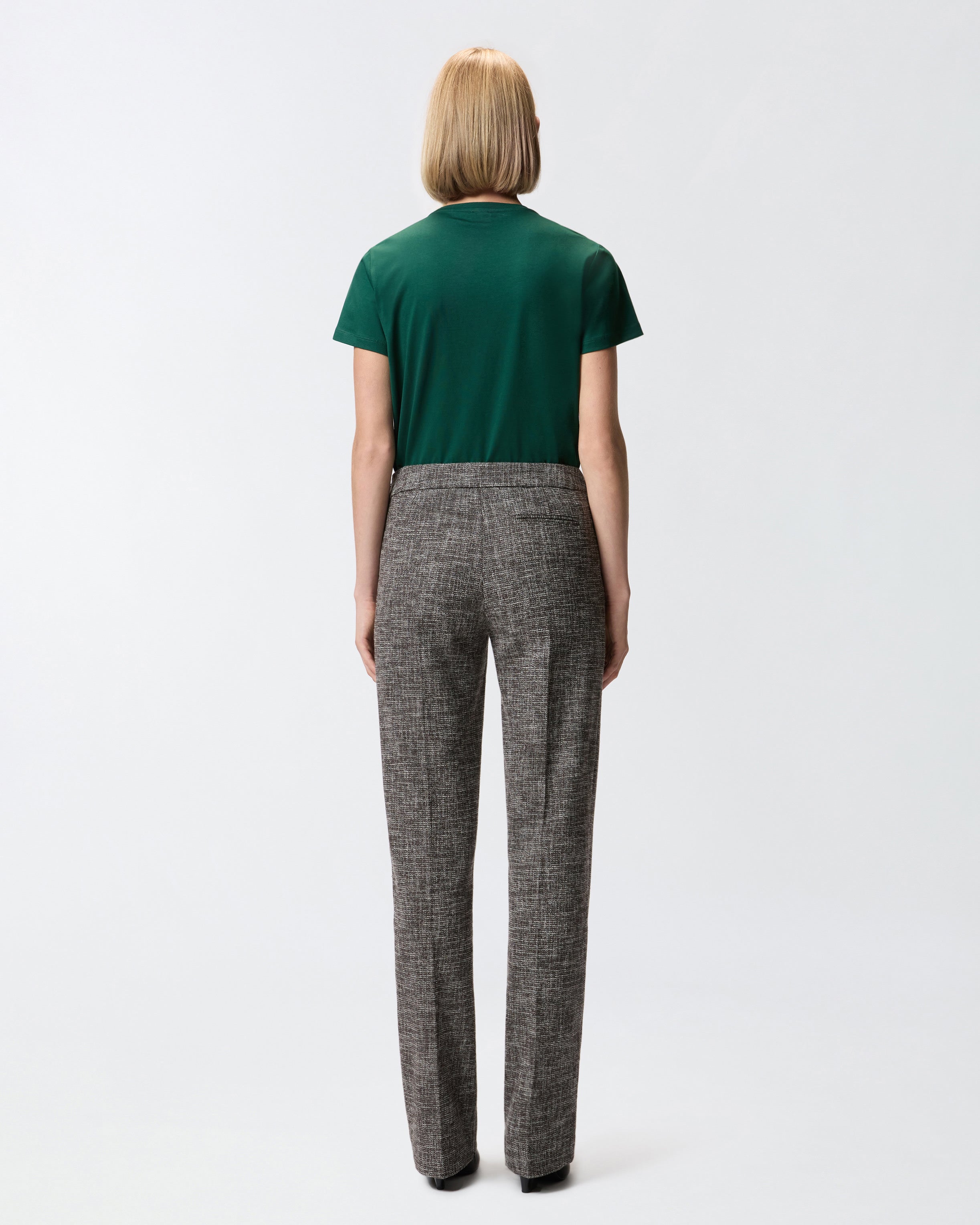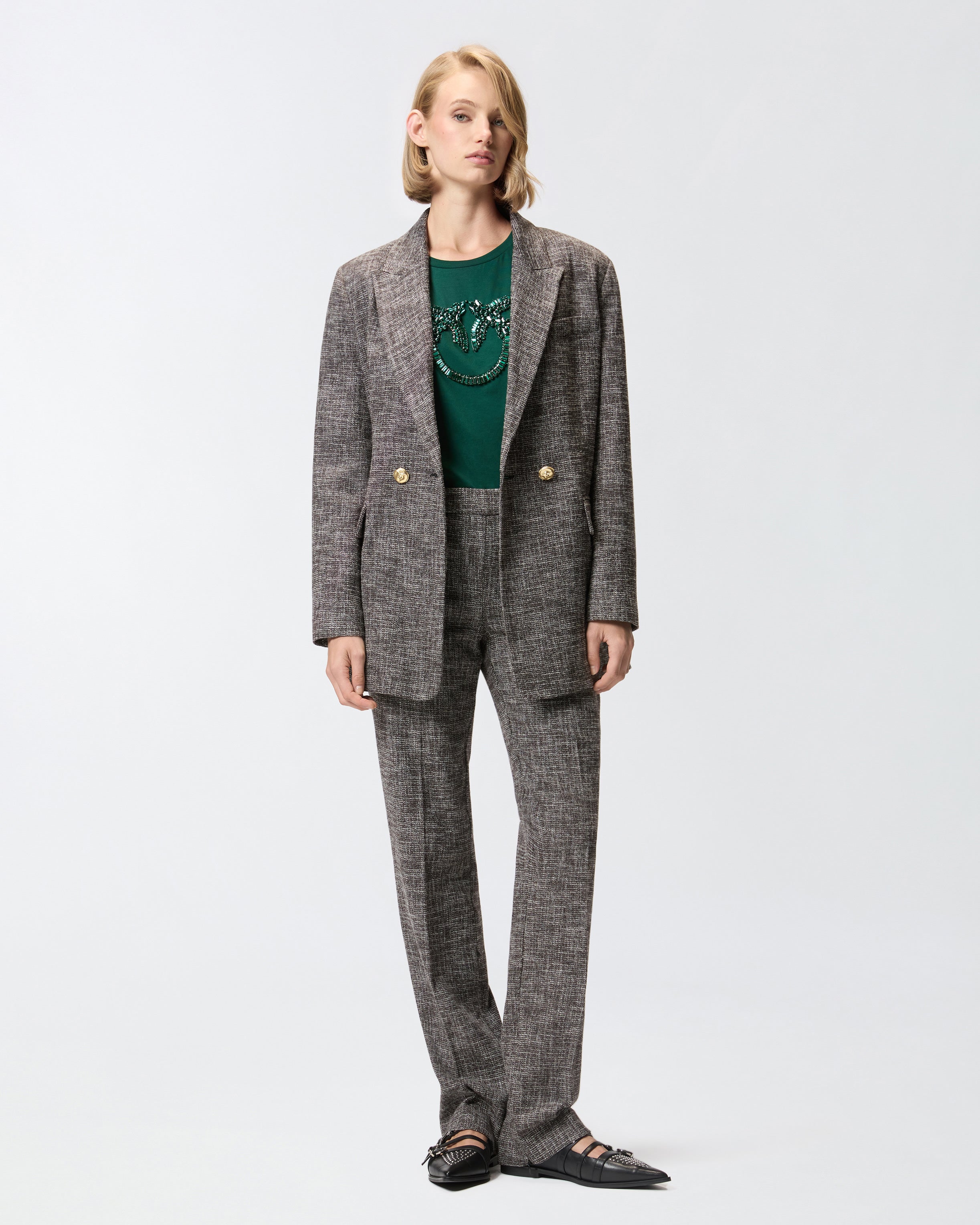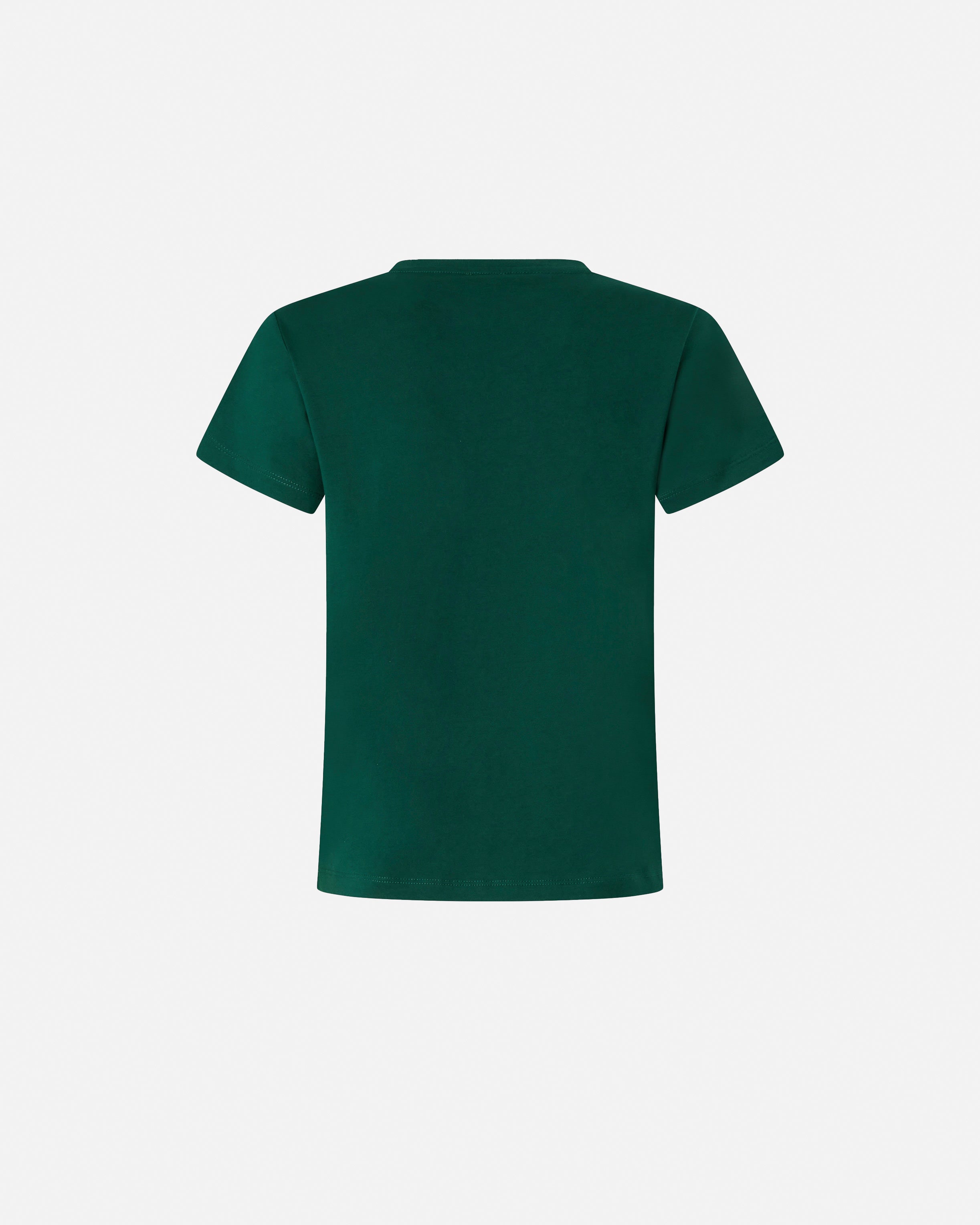 Camiseta de manga corta en punto de algodón. La prenda está adornada con el logotipo Love Birds decorado con un bordado realizado a mano compuesto por perlas, cadenita de cristales con corte baguette y strass de diferentes formas fijados con aletas laterales especiales para que queden más firmes. Esta camiseta es perfecta para llevar en cualquier ocasión, desde las más formales hasta las más deportivas, para aportar un toque femenino e icónico.