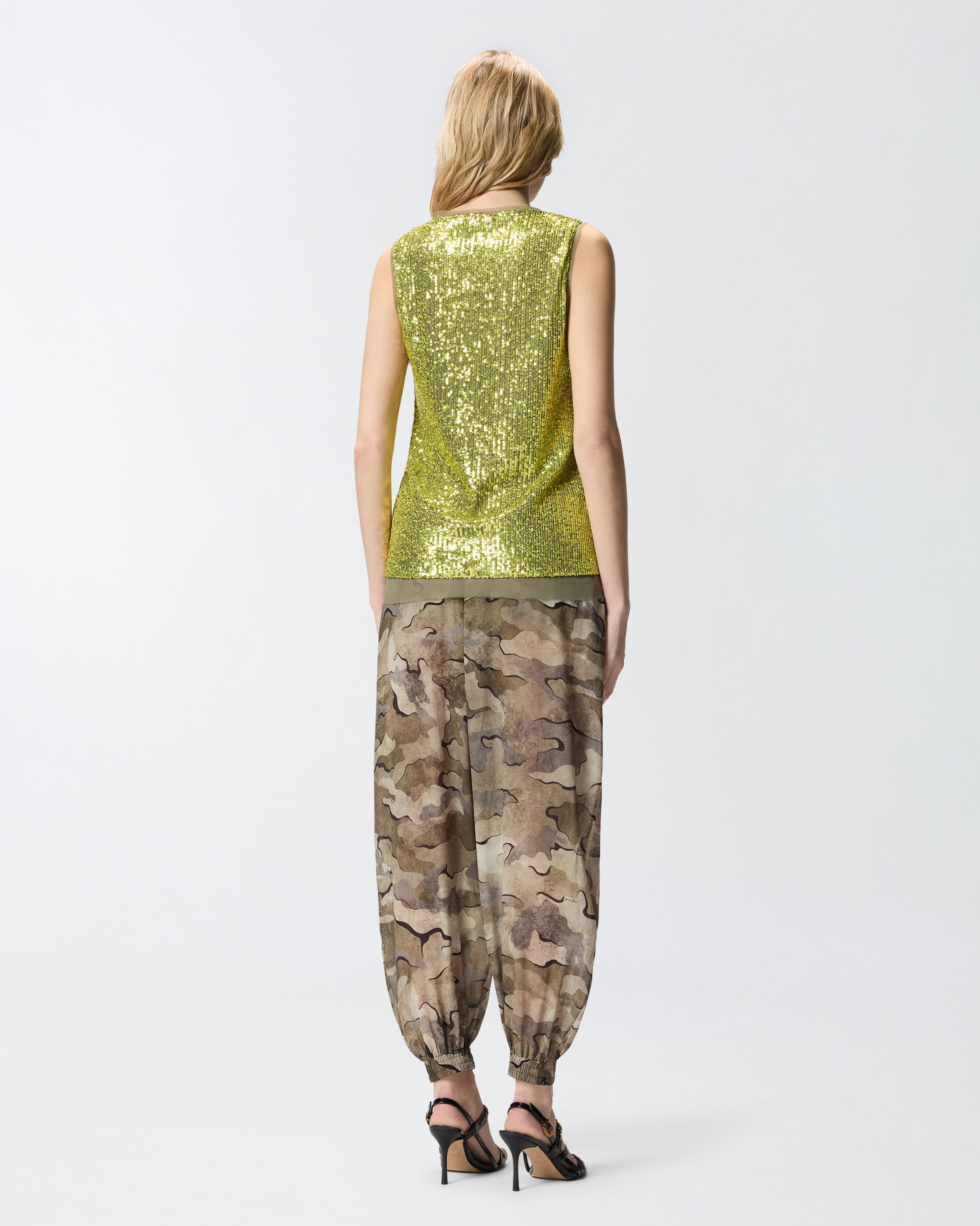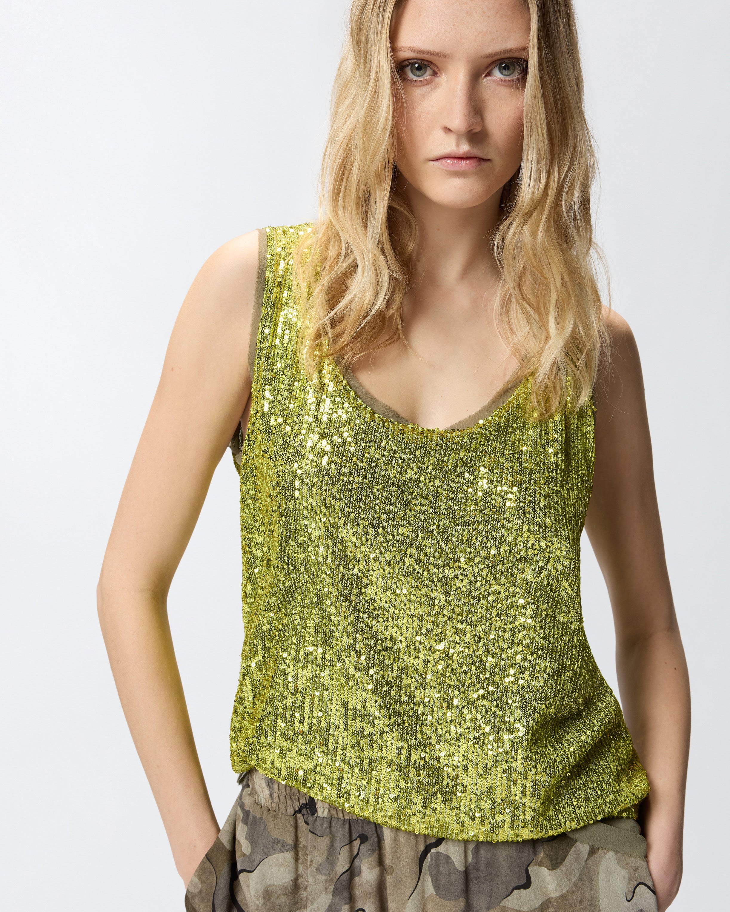 Camiseta sin mangas de georgette suave con pronunciado escote redondo en la parte delantera. El modelo rinde homenaje a la estética PINKO mediante la capa superior completamente revestida de lentejuelas brillantes que reflejan la luz con cada movimiento. ¡Ponte esta prenda para una fiesta de verano y prepárate para brillar bajo la luz de los focos! - BOLLICITE TANK TOP