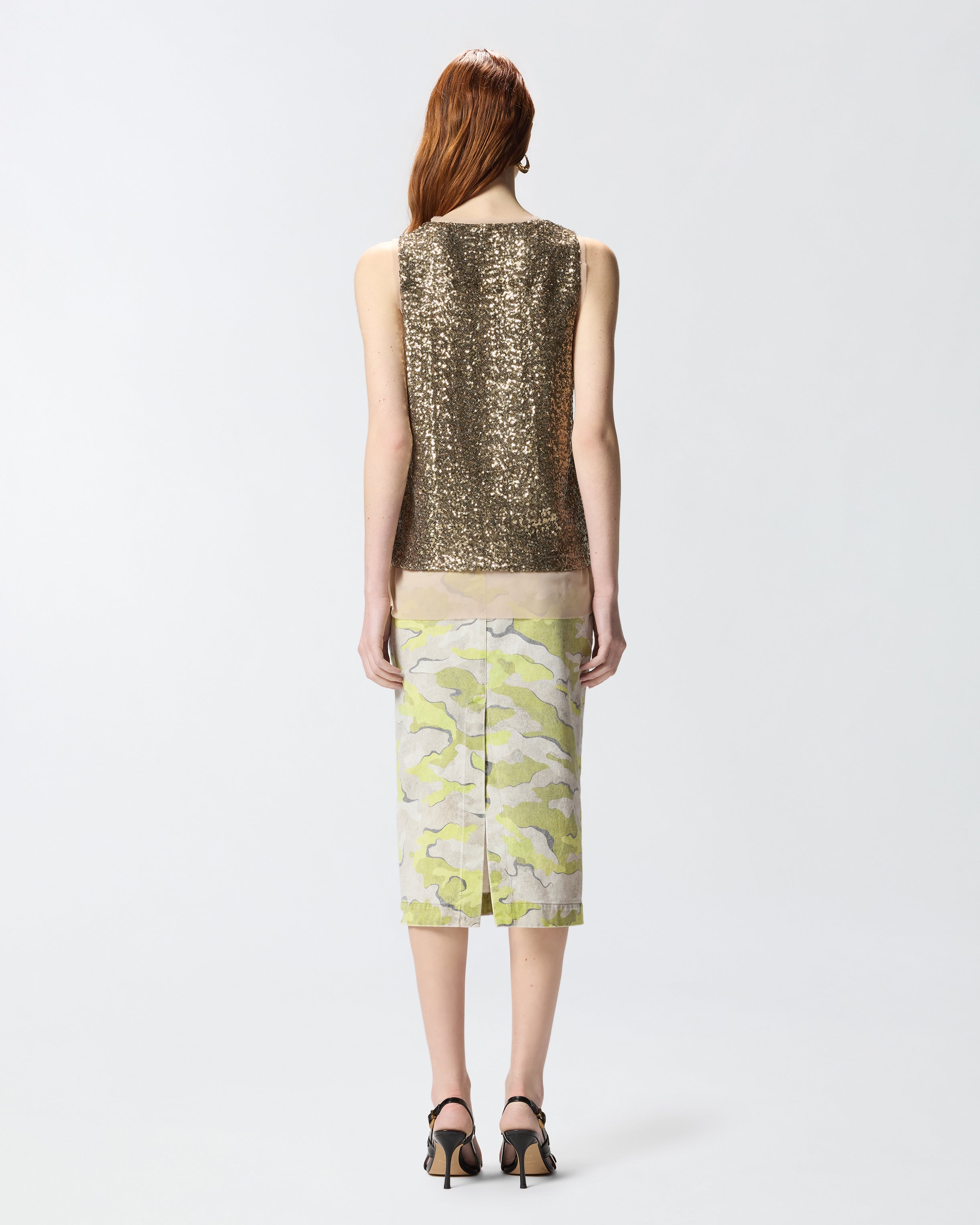 Camiseta sin mangas de georgette suave con pronunciado escote redondo en la parte delantera. El modelo rinde homenaje a la estética PINKO mediante la capa superior completamente revestida de lentejuelas brillantes que reflejan la luz con cada movimiento. ¡Ponte esta prenda para una fiesta de verano y prepárate para brillar bajo la luz de los focos! - BOLLICITE TANK TOP