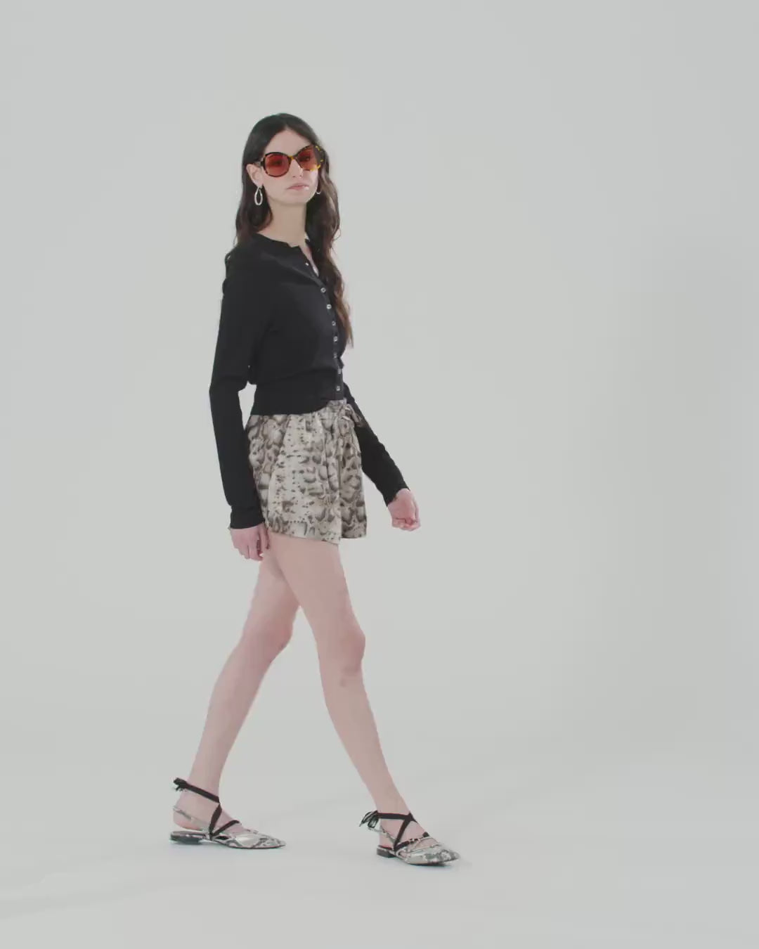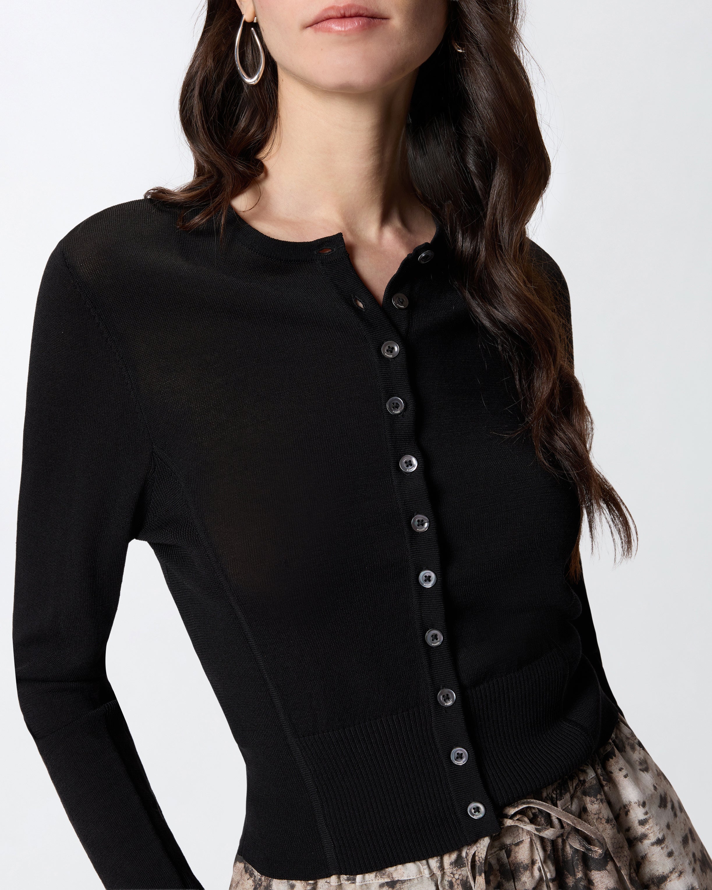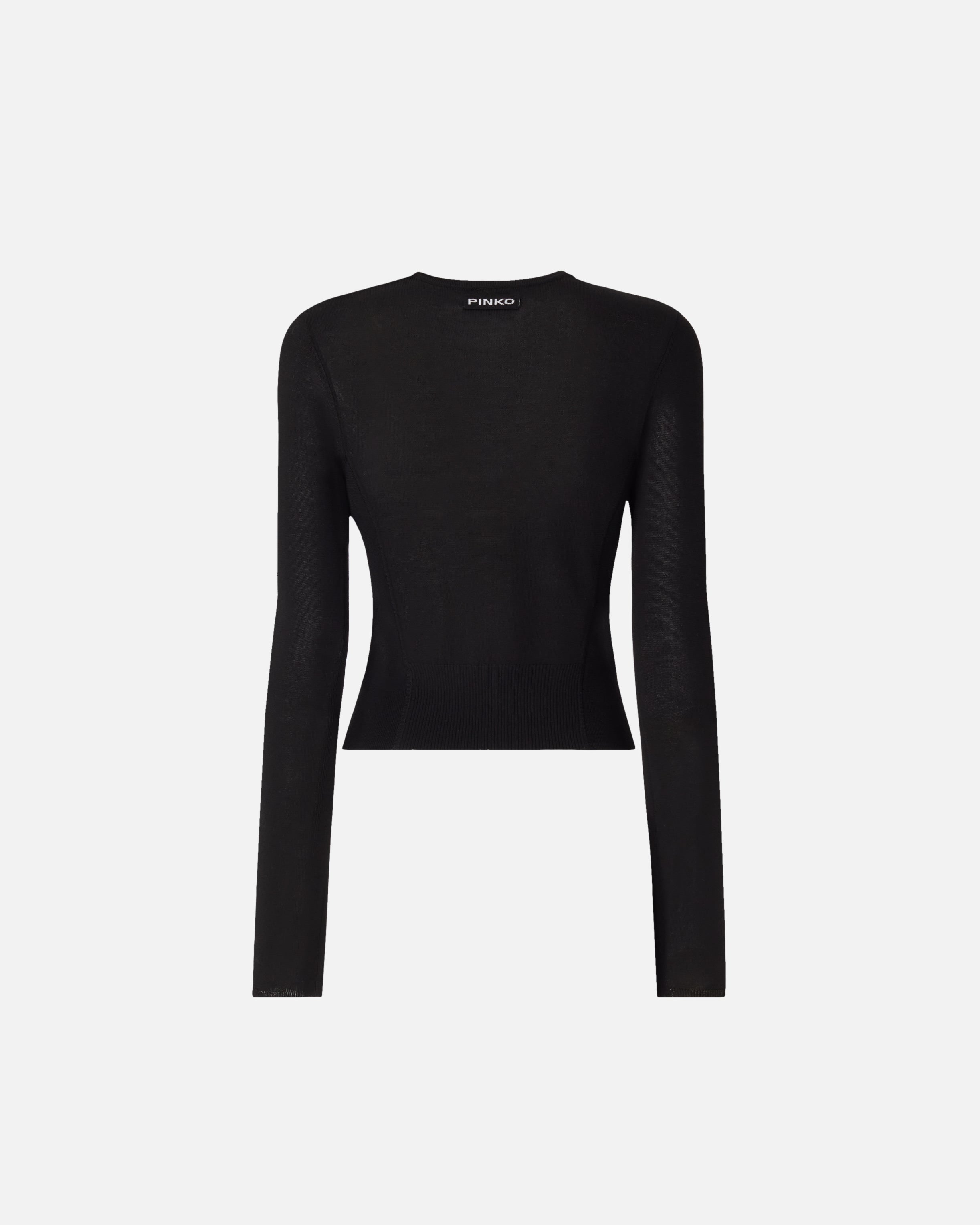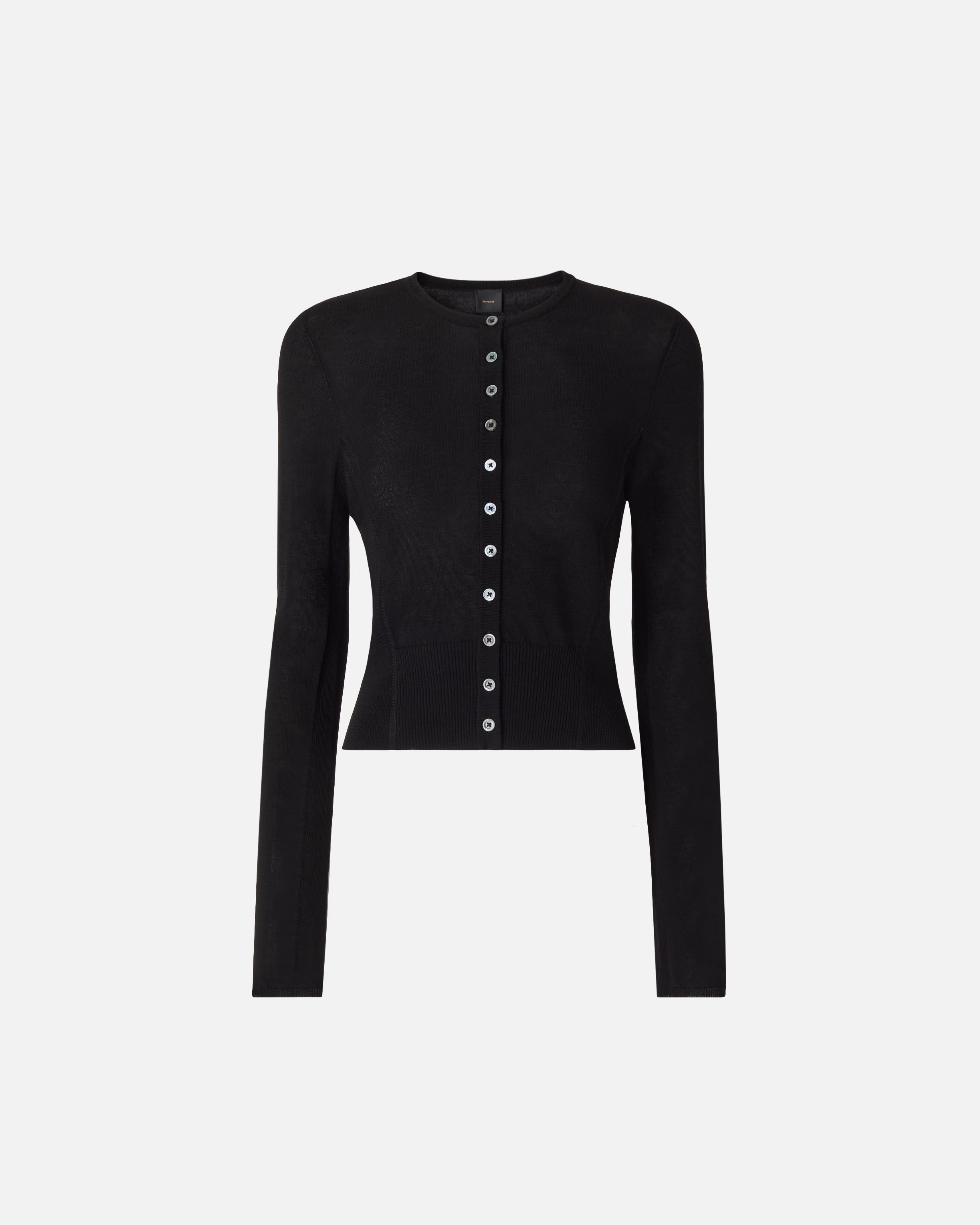 Cárdigan en punto de algodón y viscosa ultrafresco caracterizado por una confección acanalada en el bajo y a lo largo de la parte inferior de la manga. El cierre con pequeños botones de nácar aporta una elegancia sutil perfecta para el día a día, mientras que el toque final lo aporta la etiqueta con la inscripción del logotipo PINKO en la parte trasera.