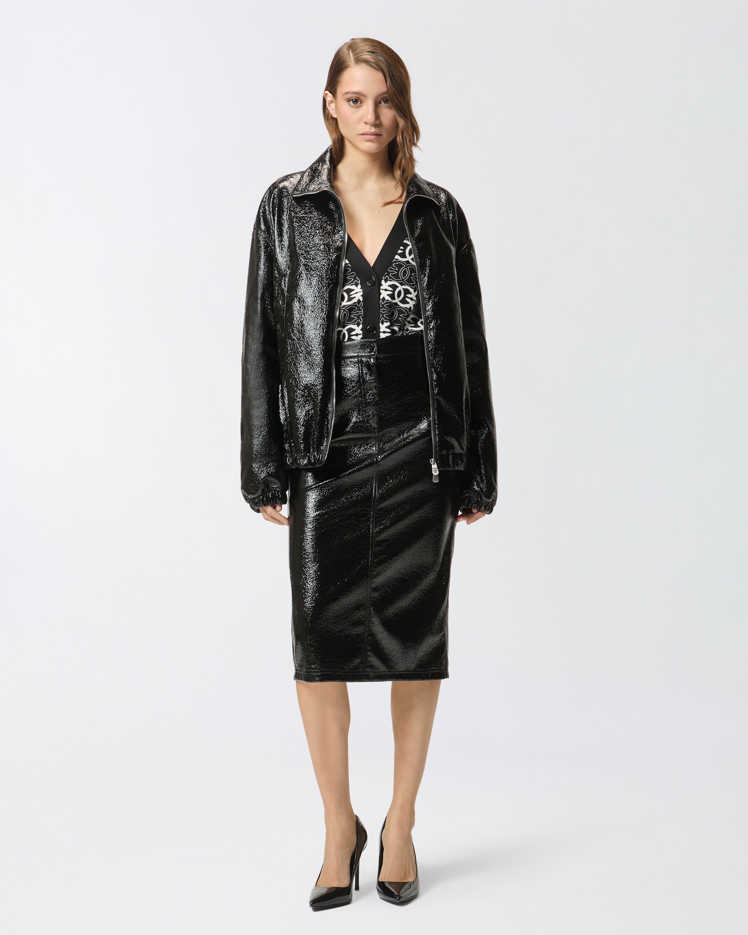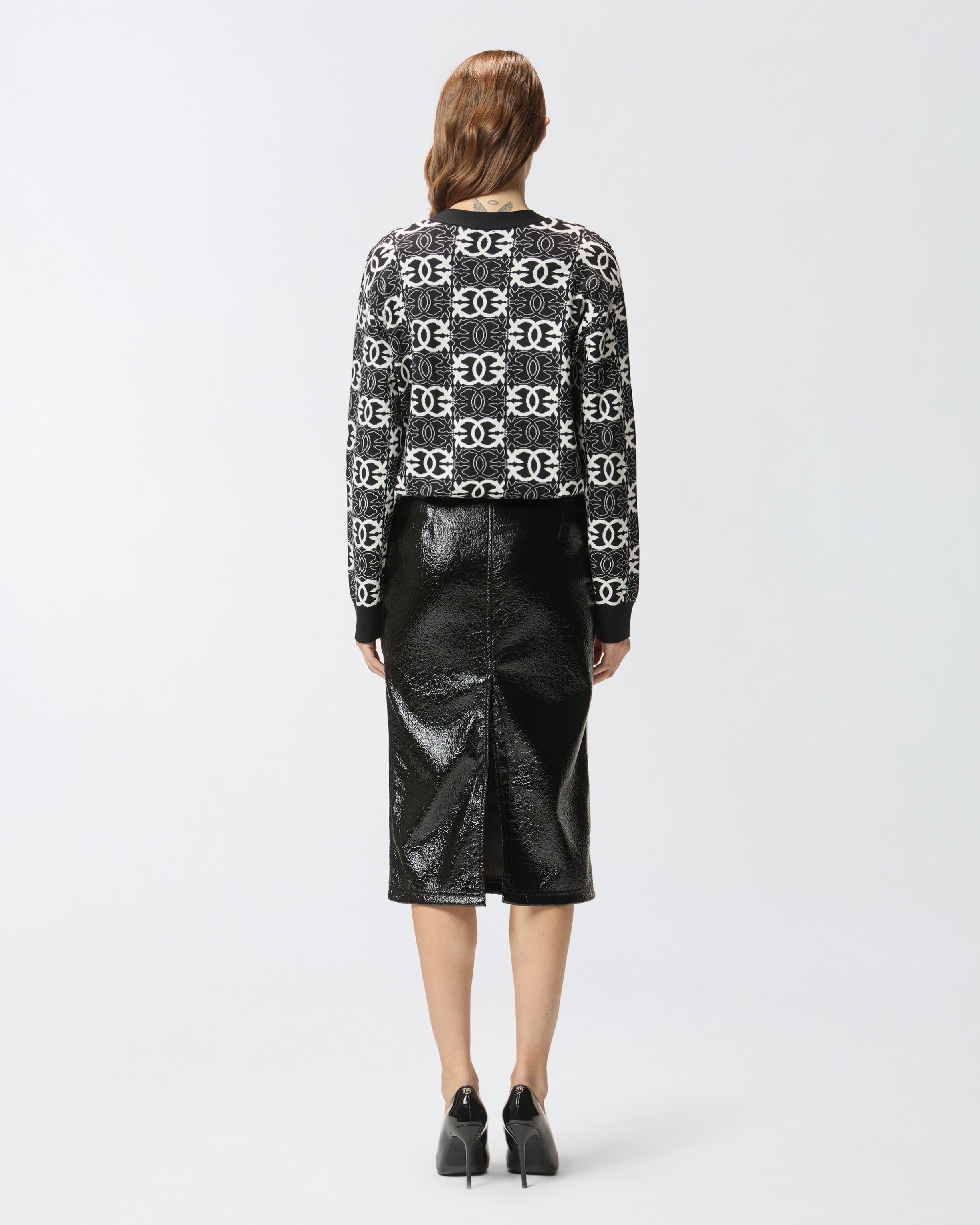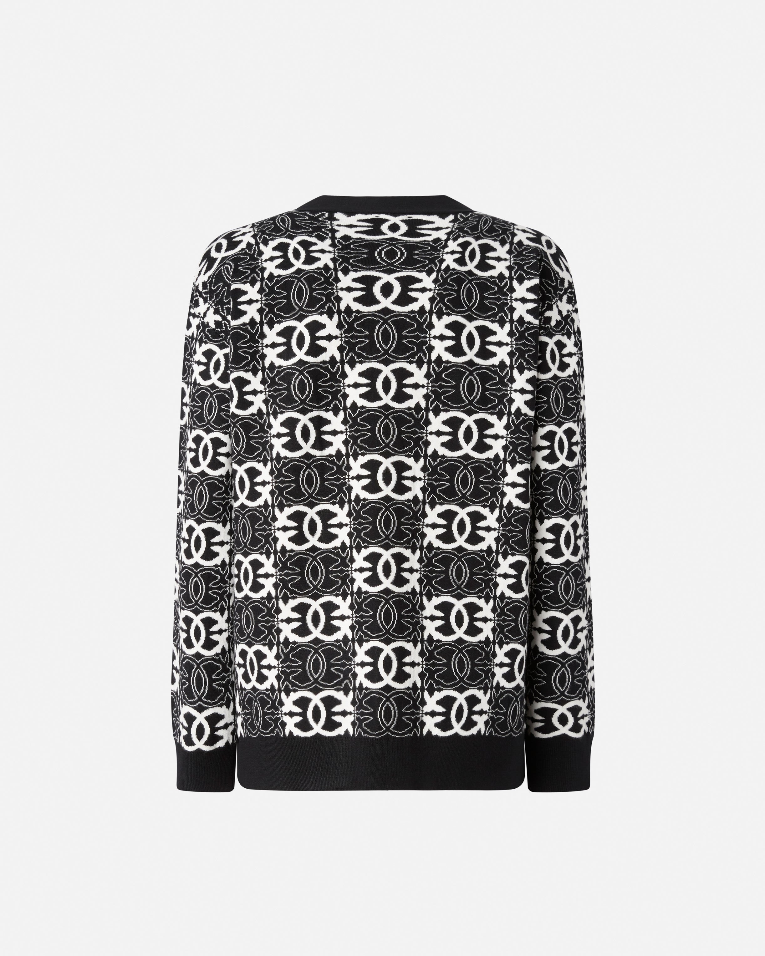 Cárdigan holgado de punto con manga larga con botones tono sobre tono y puños, botonadura y cuello de pico en contraste con confección acanalada. El motivo del logotipo Love Birds en punto jacquard por toda la superficie es un elemento impactante que enriquece el modelo. La prenda se ha sometido a pruebas de acabado para minimizar la posible formación de bolitas, garantizando una mayor suavidad y durabilidad del tejido. Combina esta prenda refinada y versátil con la falda a juego de la misma colección para lucir un look que no deja nada al azar.