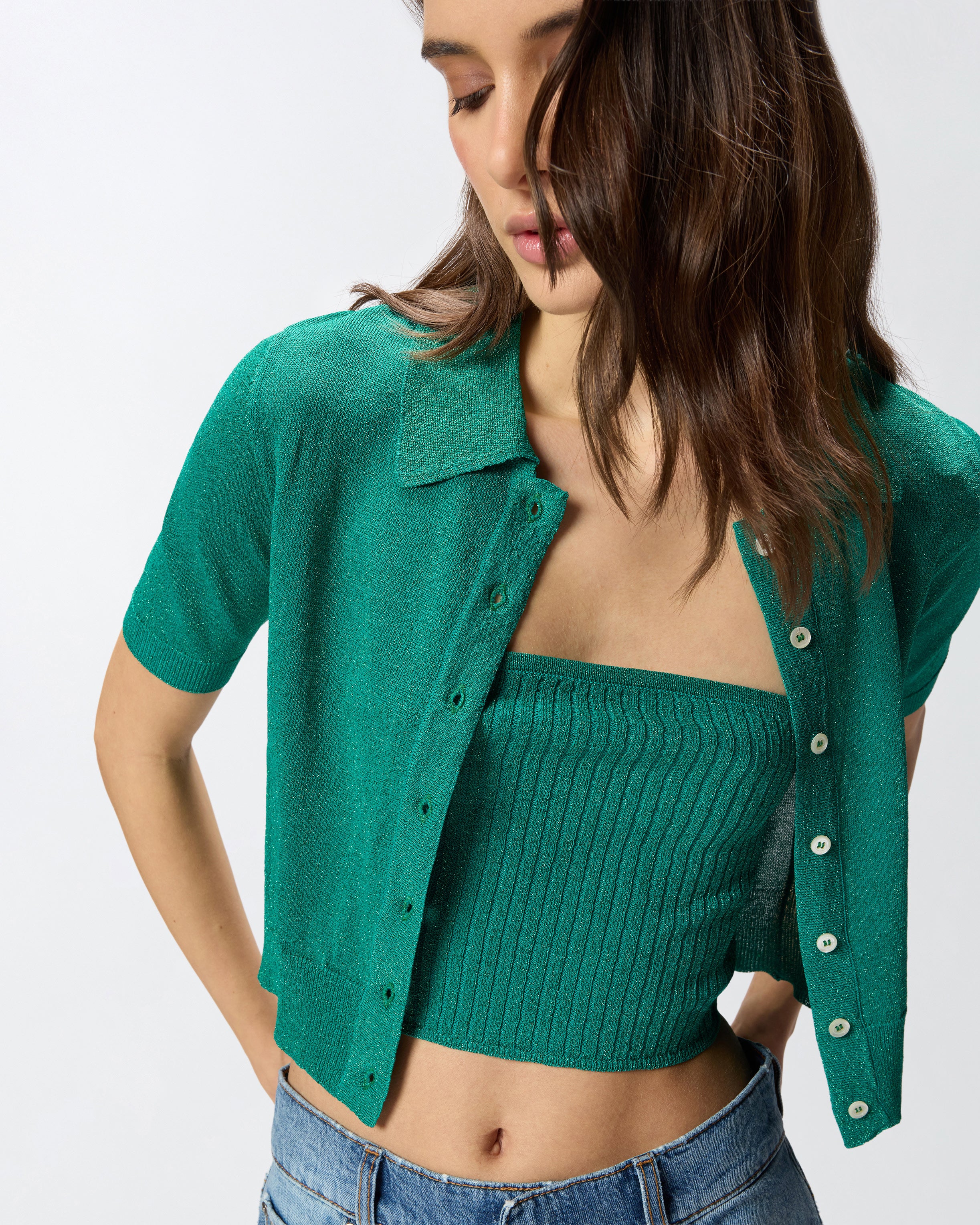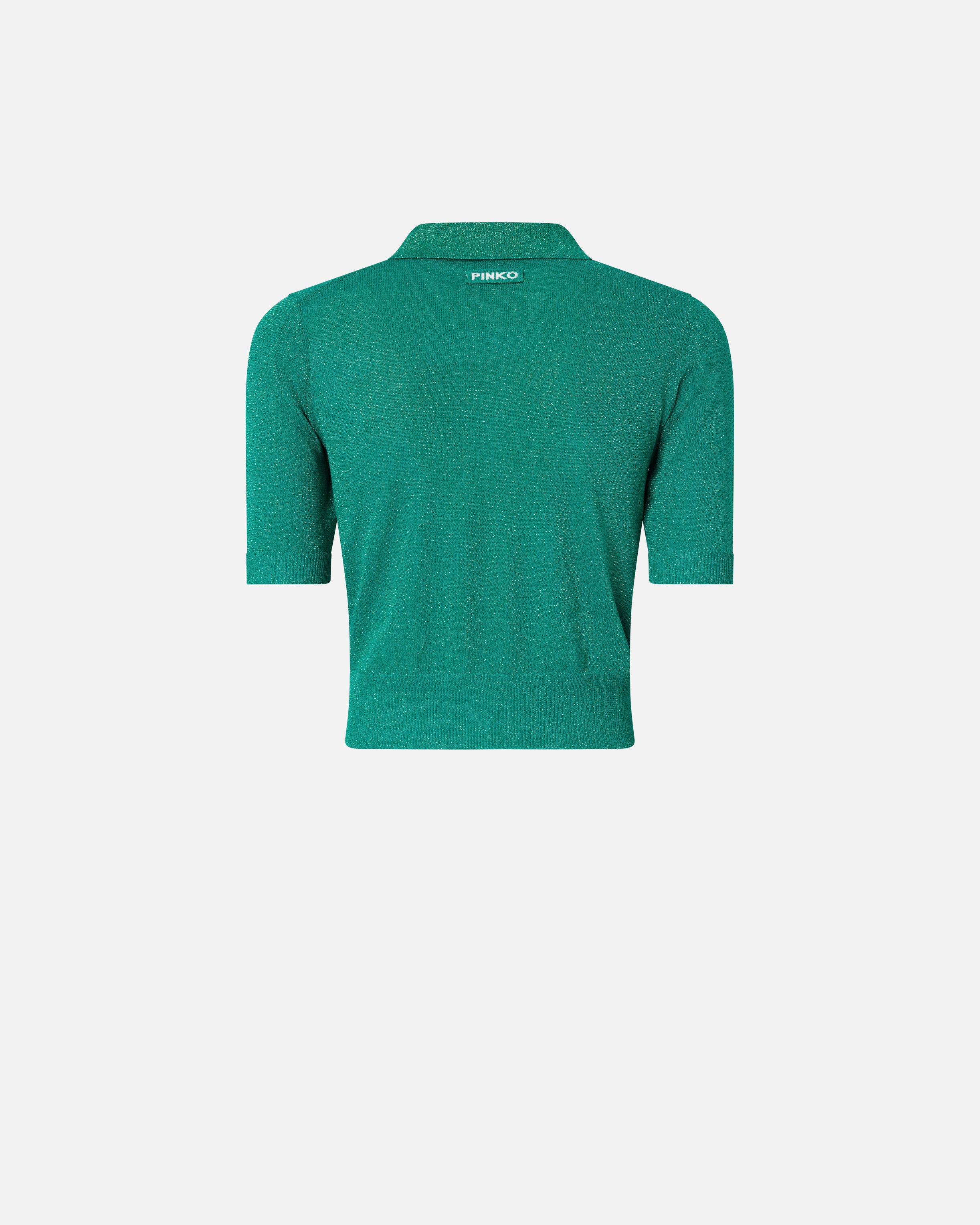 Cárdigan «cropped» de corte ajustado confeccionado en punto ligeramente transparente adornado con un hilo brillante para dar un toque luminoso al más puro estilo PINKO. El modelo se caracteriza por un diseño de media manga con cuello en punta y cierre frontal con botones, mientras que la parte inferior de la manga y la parte inferior de la prenda presentan una elegante confección acanalada. La prenda cuenta con un top de banda extraíble y se completa con una etiqueta con la inscripción del logotipo PINKO en jacquard en la parte trasera.