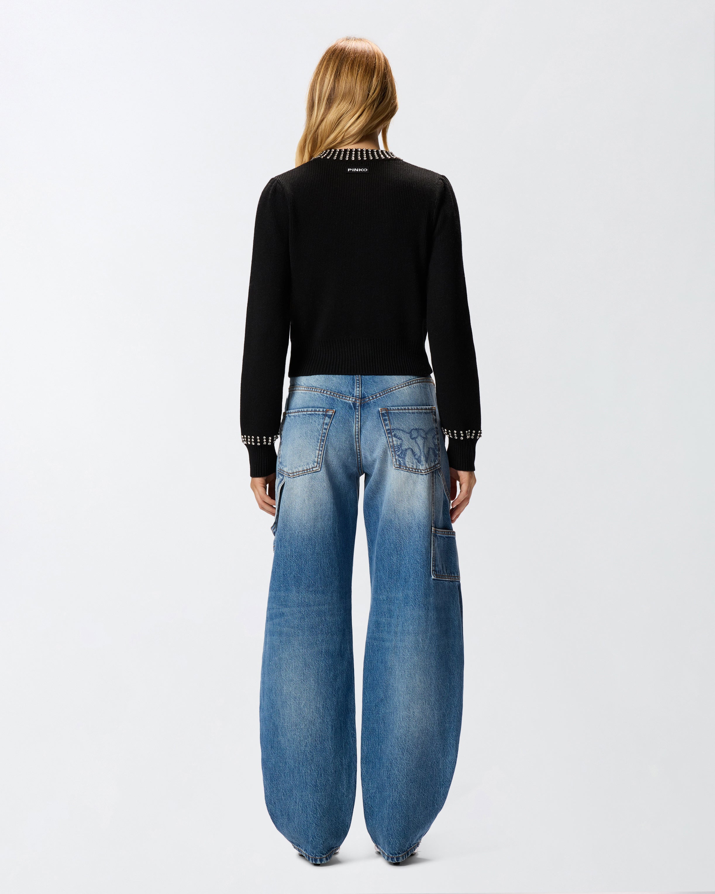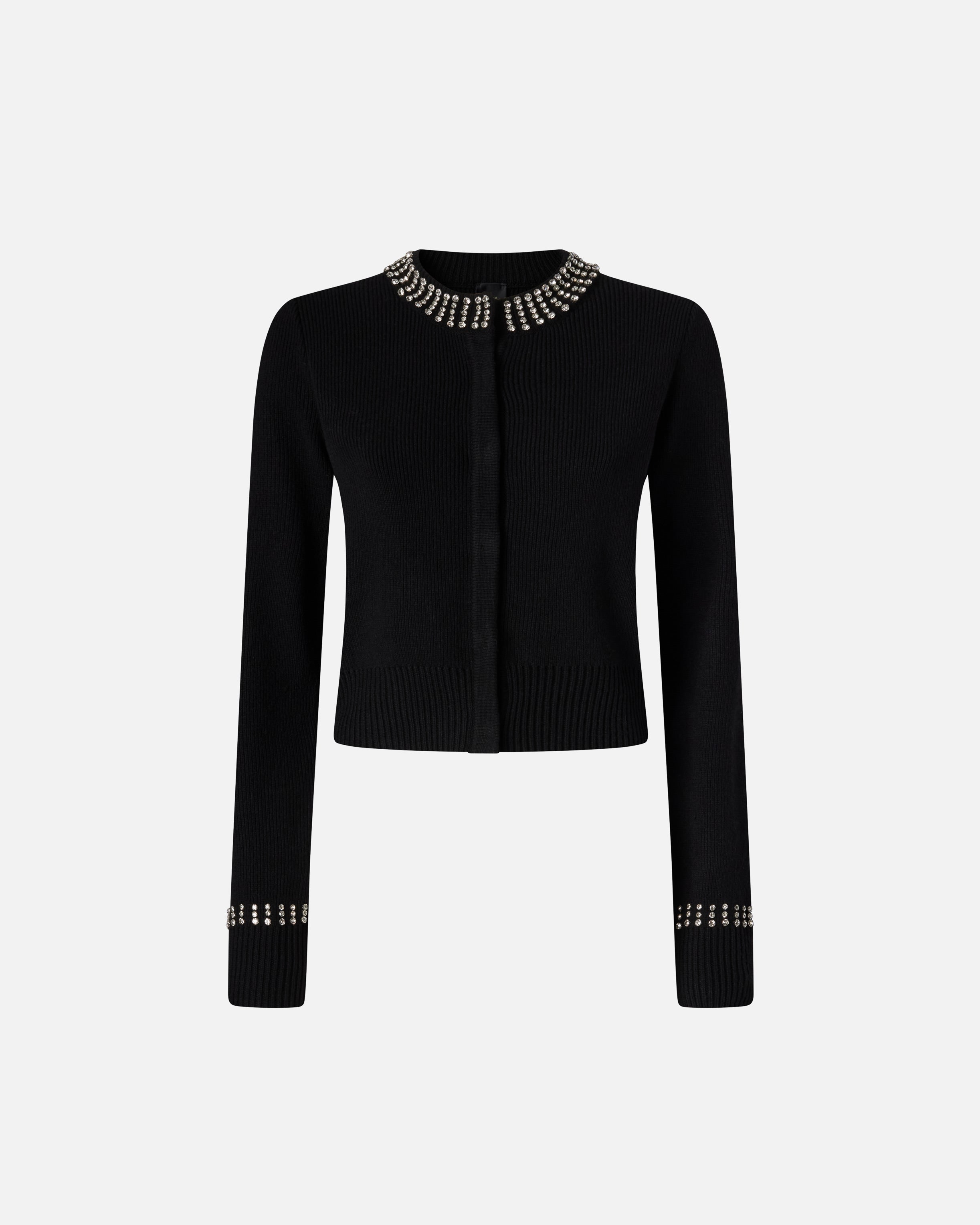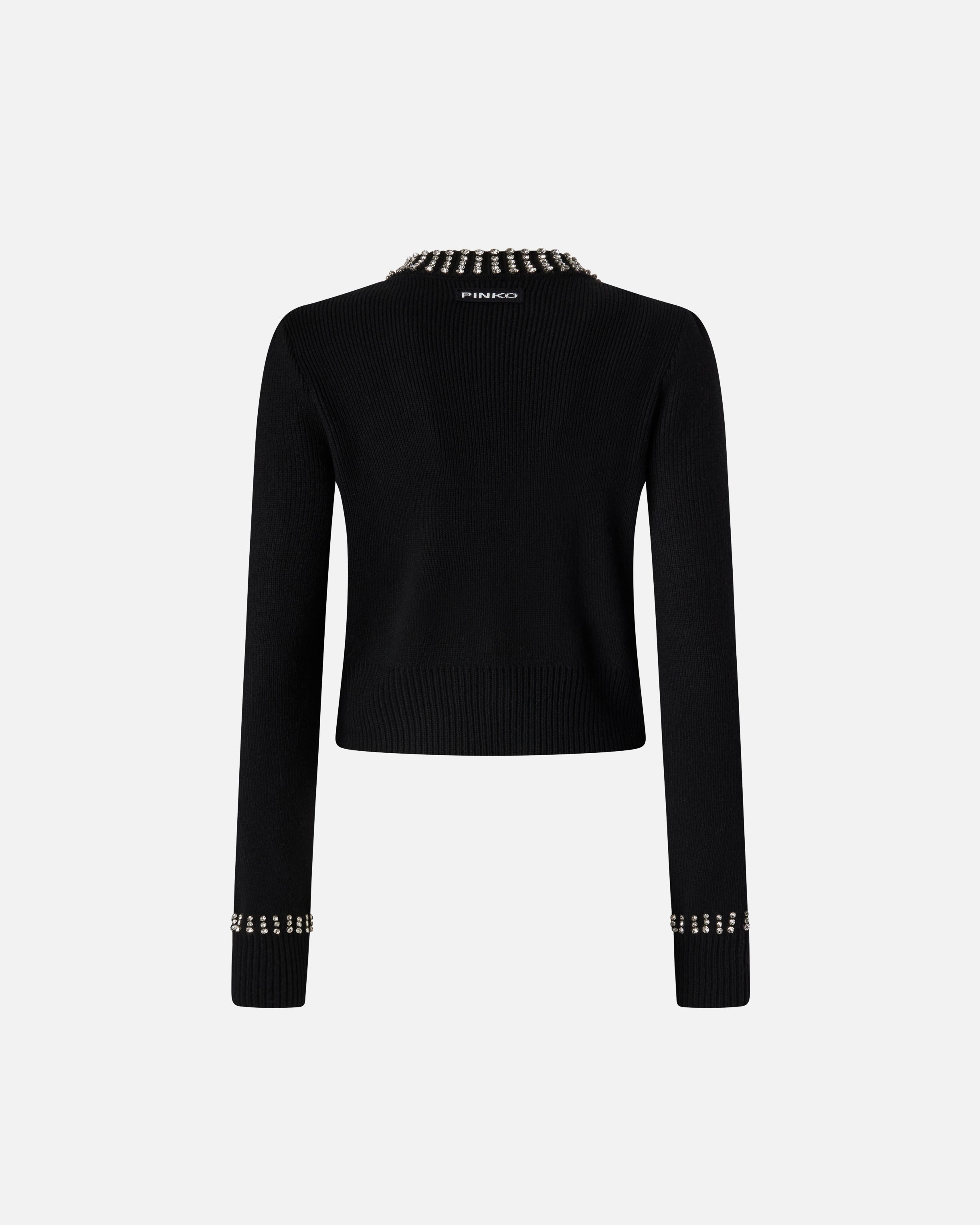 Cárdigan de manga larga con cuello redondo propuesto en un elegante corte slim. El cierre de la prenda consiste en una botonadura oculta, mientras que el bajo y los puños aportan movimiento gracias a su confección de canalé. En la parte delantera destacan dos bolsillos, uno de los cuales presenta la icónica etiqueta tono sobre tono con el logotipo de letras PINKO. El cuello redondo y los puños captan de inmediato las miradas gracias a las aplicaciones de pedrería que adornan el diseño: ideal para iluminar tus looks y tus días. La prenda se ha sometido a pruebas de acabado para minimizar la posible formación de bolitas, garantizando una mayor suavidad y durabilidad del tejido.