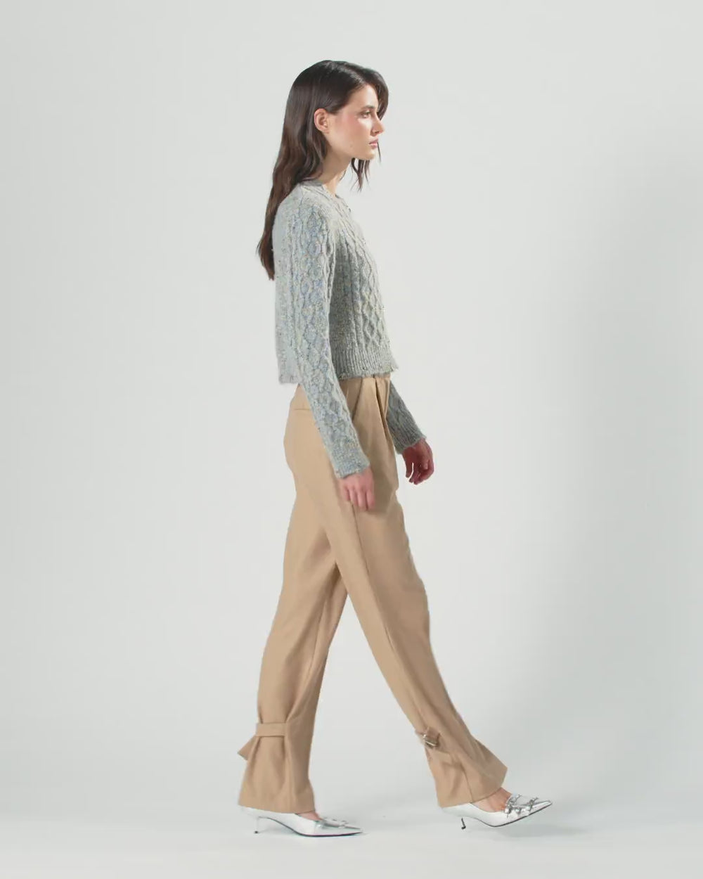Cárdigan de cuello redondo y manga larga de punto con hilos de diferentes colores, caracterizado por una confección acanalada en la parte posterior y por el punto trenzado en la parte delantera y en las mangas, que aporta movimiento y tridimensionalidad al diseño. La parte delantera presenta un clásico cierre de botones, mientras que la etiqueta con el logotipo de letras PINKO tono sobre tono en la parte trasera completa el accesorio con un toque personalizado. La prenda se ha sometido a pruebas de acabado para minimizar la posible formación de bolitas, garantizando una mayor suavidad y durabilidad del tejido.