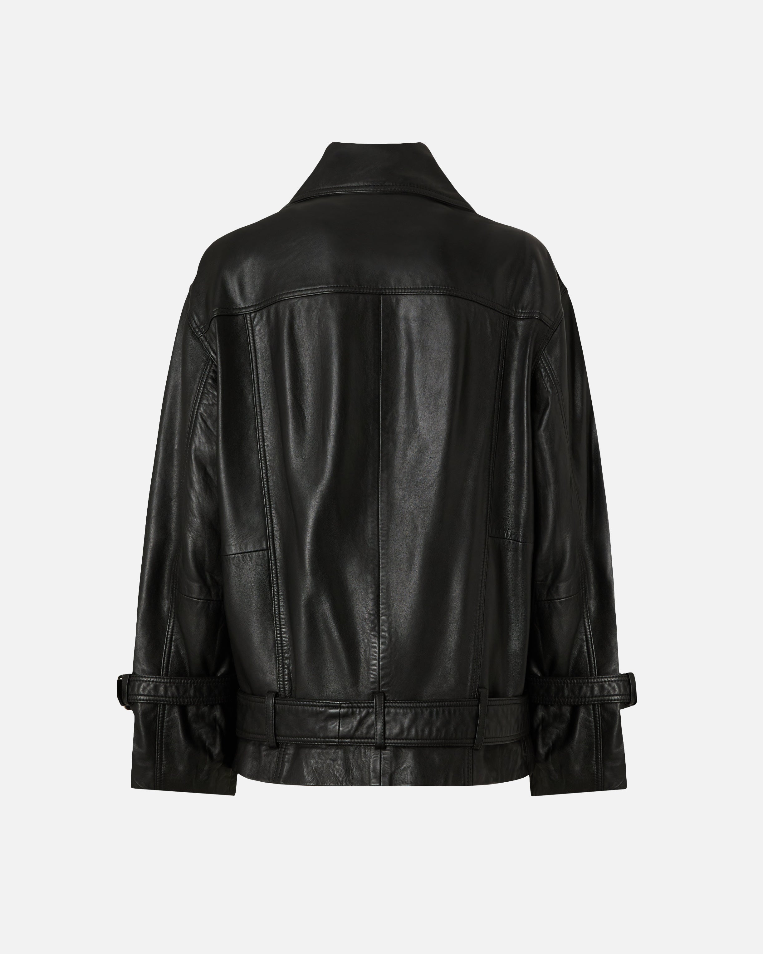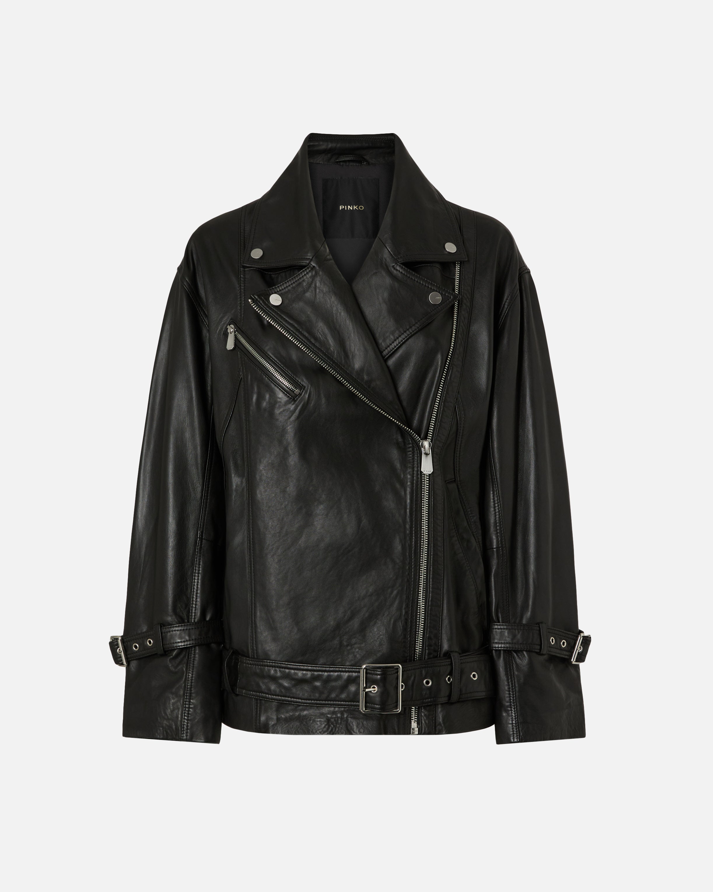 Cazadora motera estilo chupa con solapas anchas con botones, tira con hebilla en los puños, bolsillos oblicuos en los laterales, cierre delantero con cremallera descentrada y pequeño bolsillo con cremallera en el pecho. La prenda se presenta en una versión de piel con un llamativo efecto envejecido, obtenido mediante un proceso especial de teñido y acabado, y cuenta con un cinturón con hebilla en el bajo que se puede llevar abierto o cerrado para personalizar el ajuste. Esta chaqueta es una reinterpretación contemporánea de la clásica cazadora motera de piel, con una línea ligeramente más holgada y menos estructurada, perfecta para combinar con tus looks de diario e iluminarlos con el estilo que representa esta prenda de abrigo.
