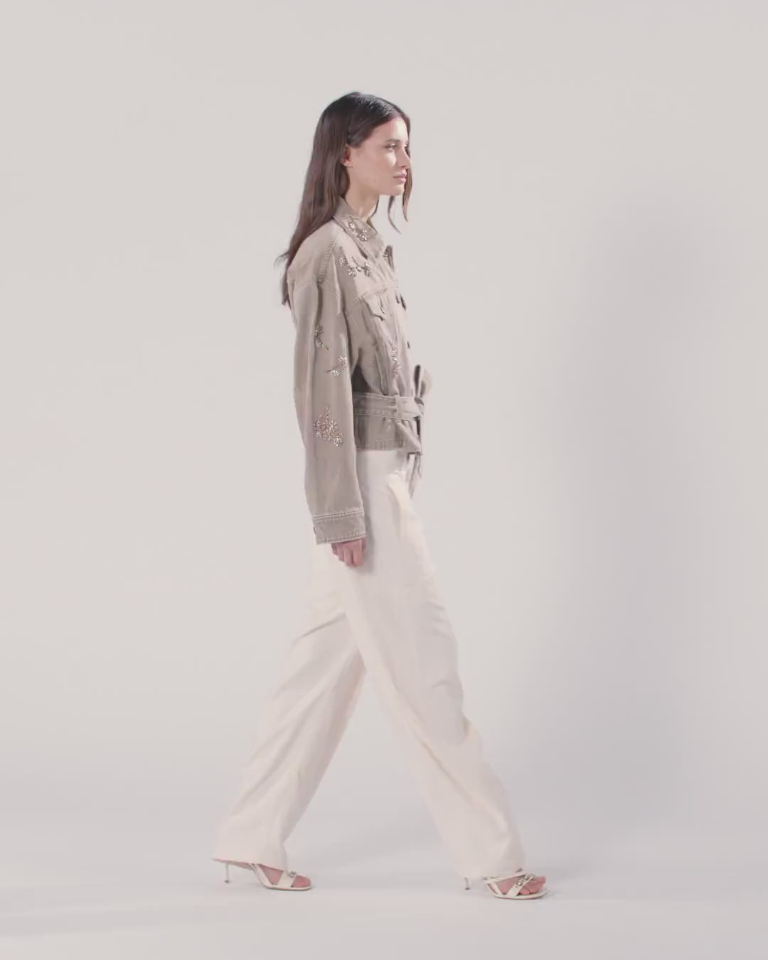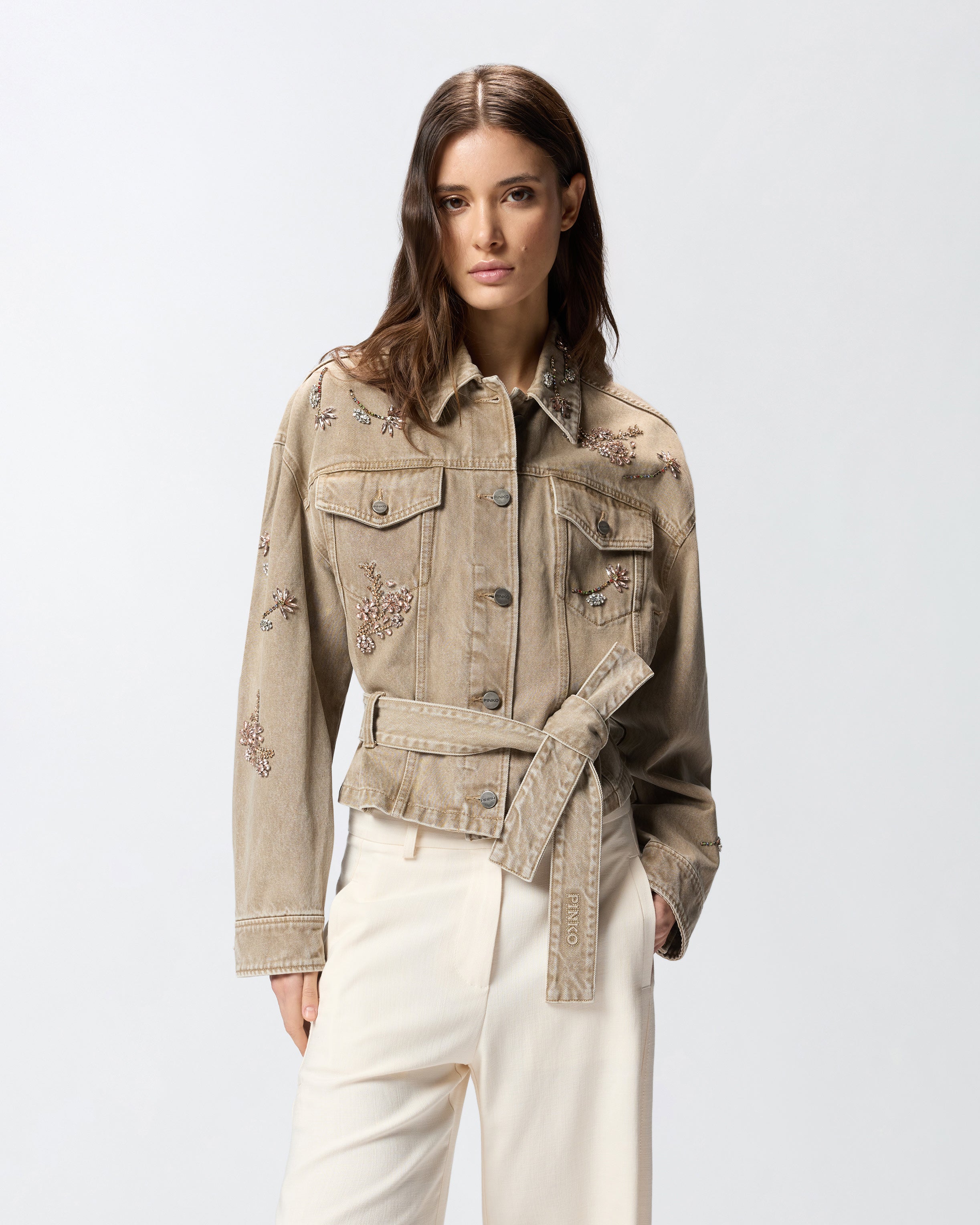 Cazadora de manga larga con hombros caídos confeccionada en denim de algodón y lyocell marrón y adornada con un motivo de flores joya bordadas en la parte delantera. El modelo cuenta con puños con botones, dos bolsillos con solapa y botón en el pecho y dos bolsillos ribeteados laterales, y está rematado con un cinturón extraíble del mismo tejido para anudar en la cintura. Se trata de una prenda versátil y contemporánea lista para realzar tus conjuntos de diario al más puro estilo PINKO. - GIUNGLA JACKET