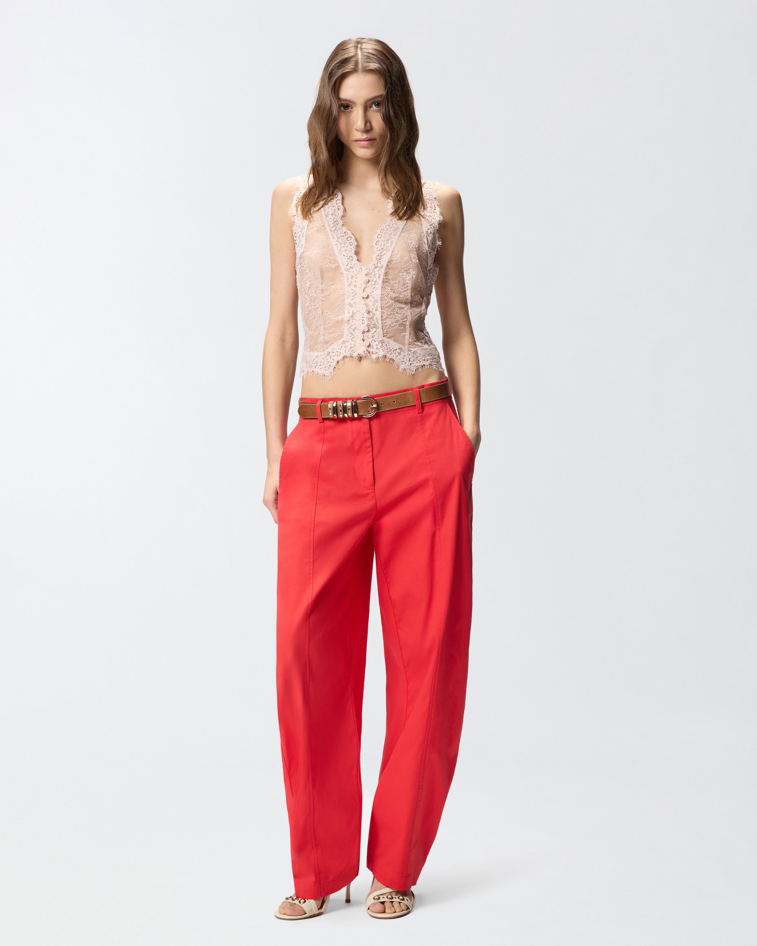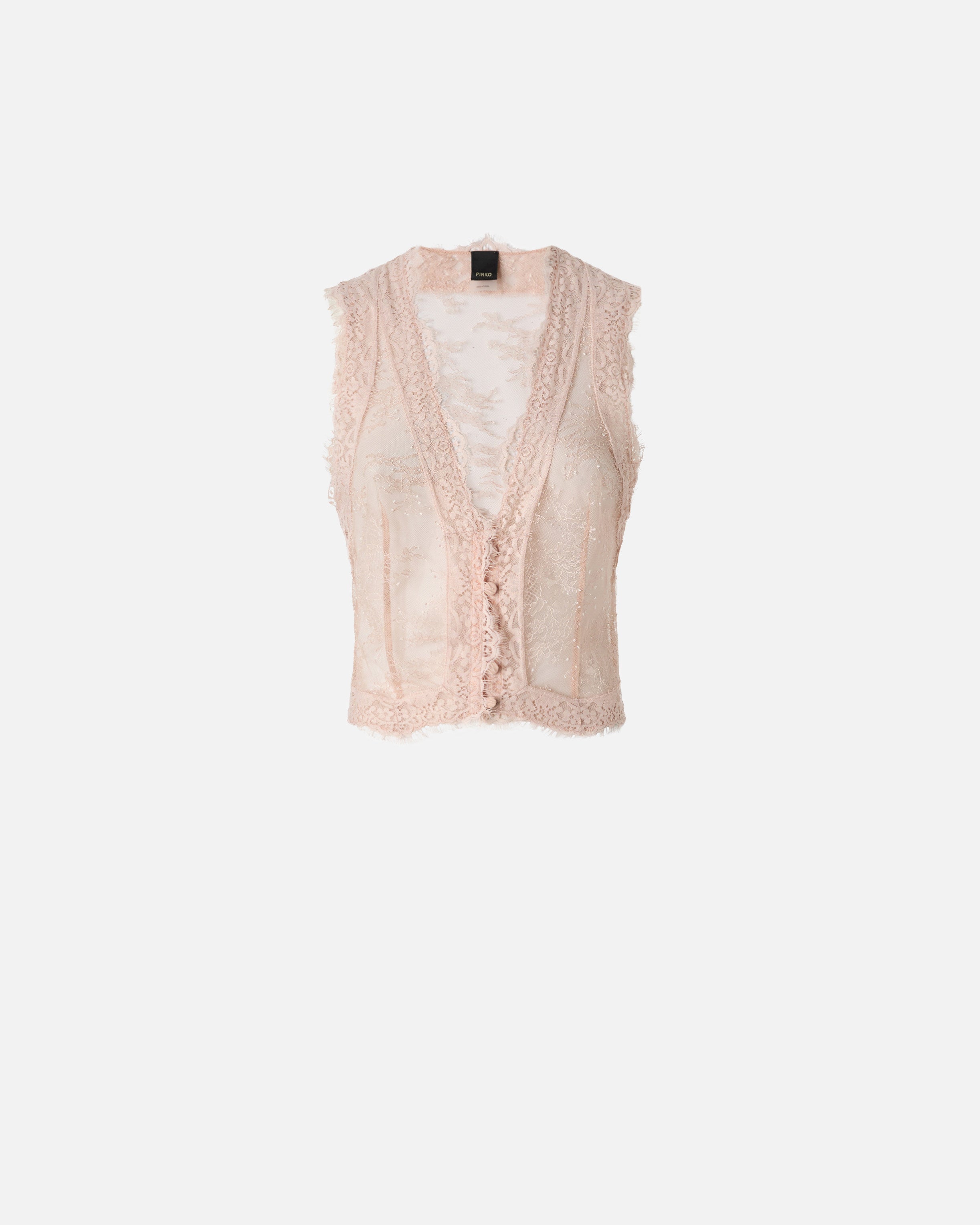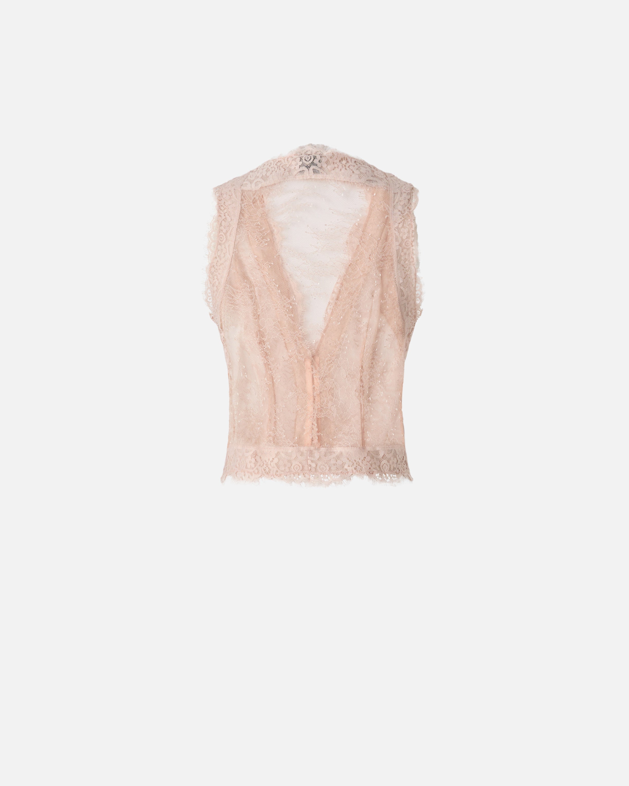 Chaleco de corte entallado caracterizado por un diseño estilo bustier y un pronunciado escote de pico en la parte delantera, que continúa con una abertura con pequeños botones forrados. El modelo está confeccionado en un delicado encaje valencienne con motivo floral que crea un efecto semitransparente y está acabado con bordes festoneados sin rematar. La ligereza y el juego de transparencias femeninas hacen de este chaleco de mujer la elección ideal para un look elegante que no renuncia a un toque de sensualidad.