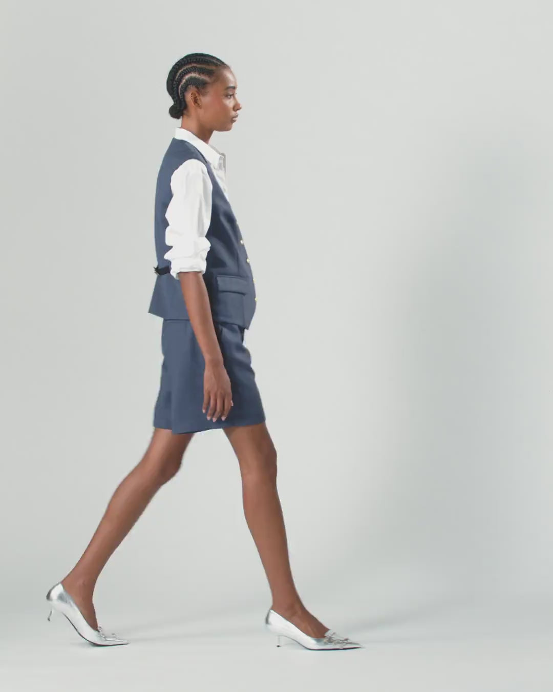 Lined regular fit vest with V-neck, figure-hugging front pleats, front flap pockets and martingale detail on the back. The garment is made of textured wool, particularly structured and resistant even for the cold season. Front closure with metal buttons decorated with a star. Combine the vest with the oversized blazer jacket in the same fabric to create an elegant yet contemporary outfit.