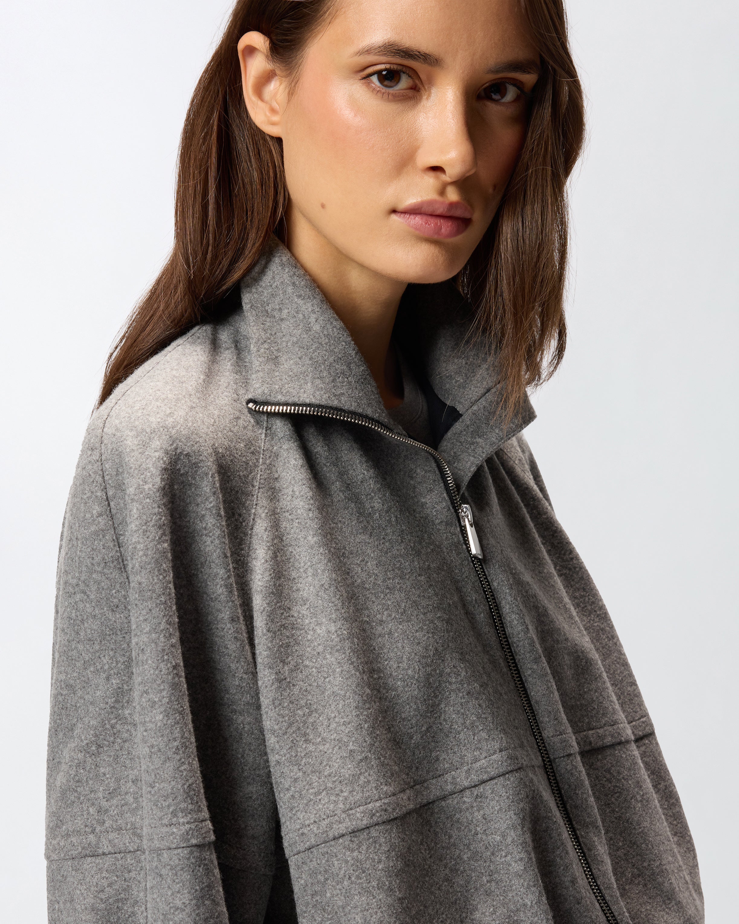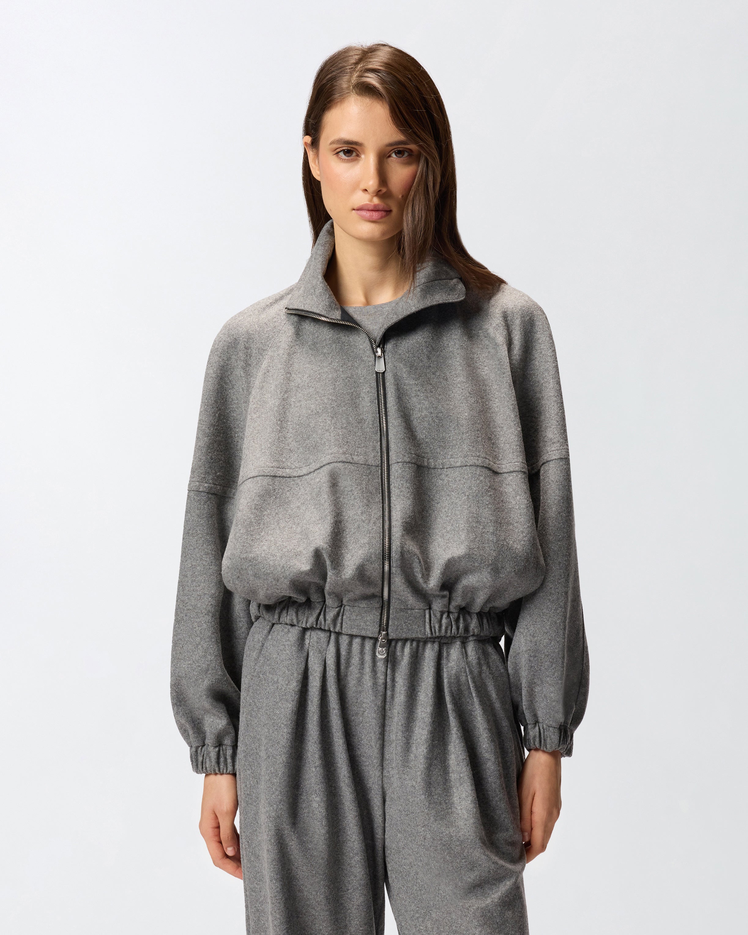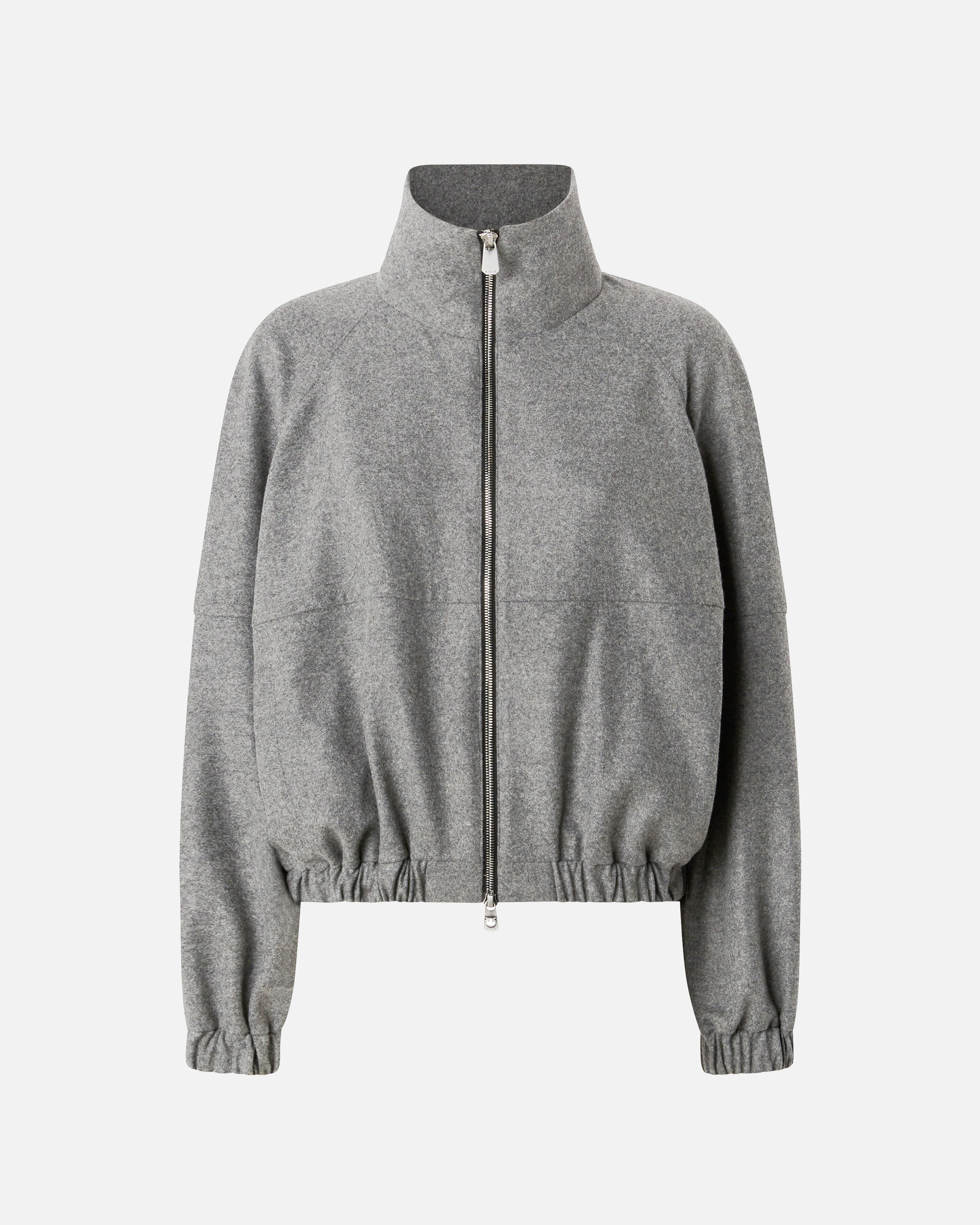 Chaqueta bómber de corte regular confeccionada en franela de punto de mezcla de lana teñida en hilo, un tejido perfecto para combinar suavidad, elasticidad y comodidad. La prenda presenta un envolvente cuello subido, un funcional cierre frontal con cremallera y cómodos bolsillos laterales, resultando aún más práctica gracias al dobladillo y los puños elásticos. Abraza el estilo deportivo con este modelo práctico y versátil, para llevar en el tiempo libre o en las ocasiones más informales.