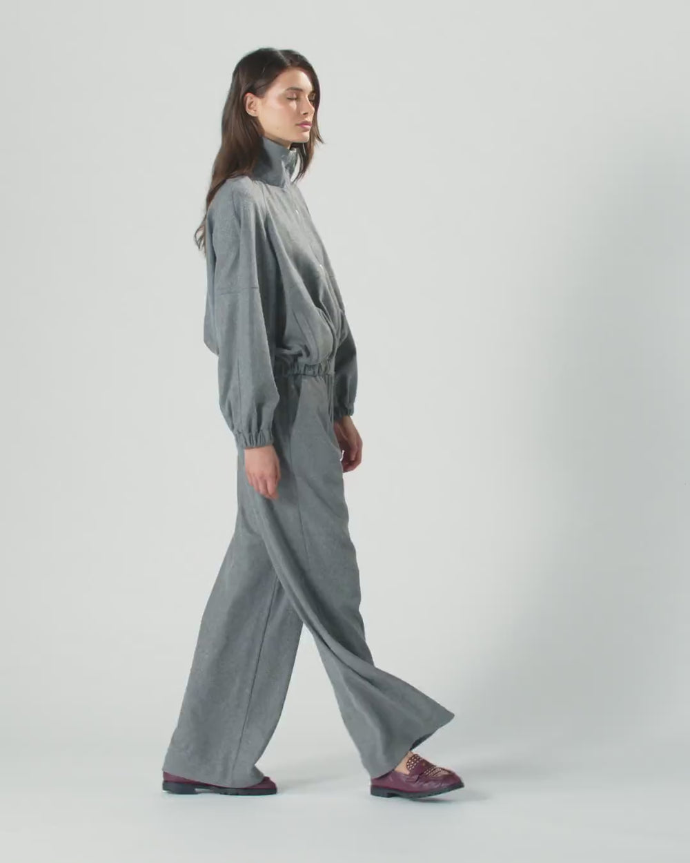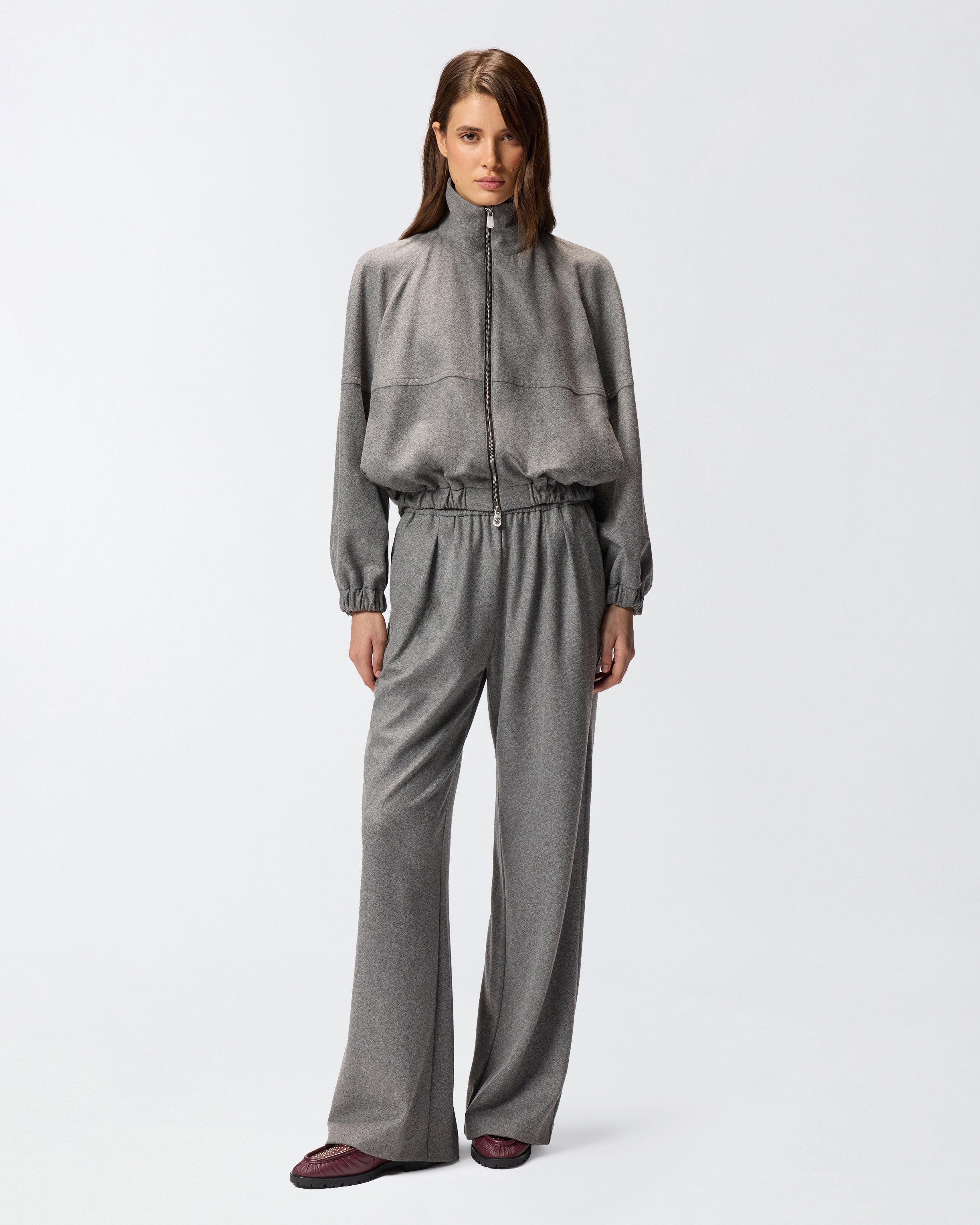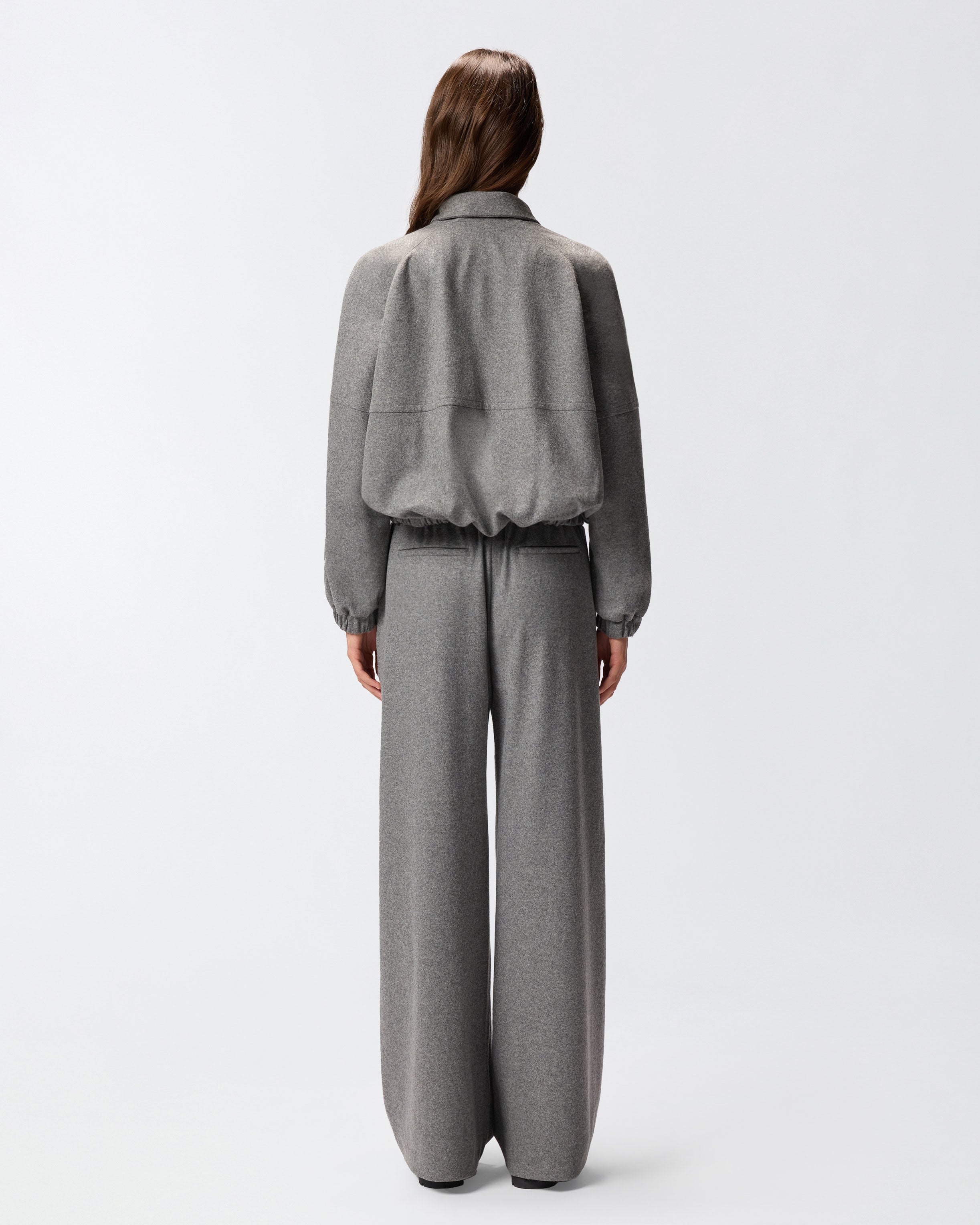 Chaqueta bómber de corte regular confeccionada en franela de punto de mezcla de lana teñida en hilo, un tejido perfecto para combinar suavidad, elasticidad y comodidad. La prenda presenta un envolvente cuello subido, un funcional cierre frontal con cremallera y cómodos bolsillos laterales, resultando aún más práctica gracias al dobladillo y los puños elásticos. Abraza el estilo deportivo con este modelo práctico y versátil, para llevar en el tiempo libre o en las ocasiones más informales.