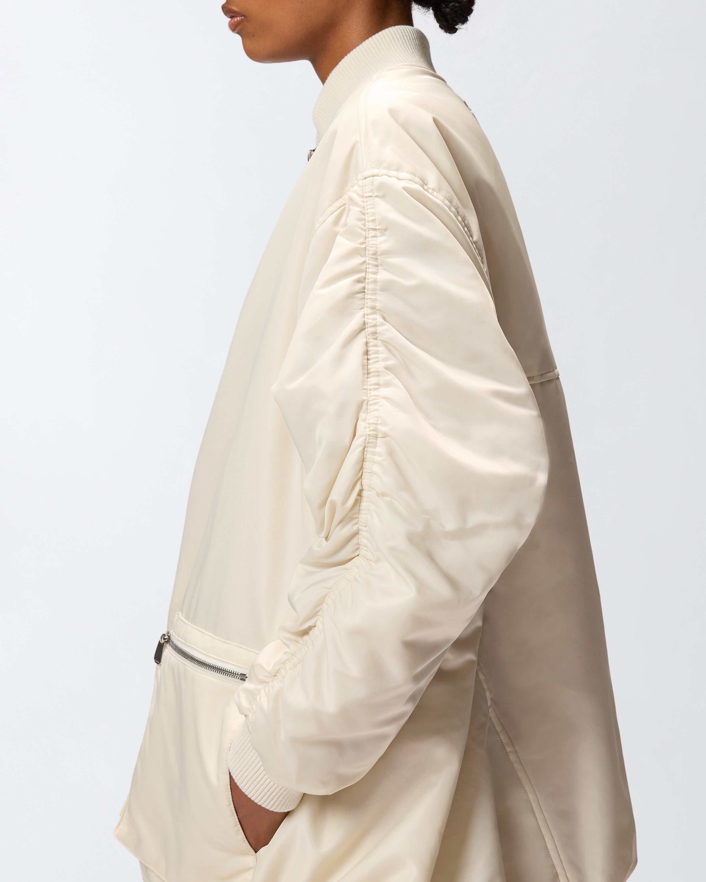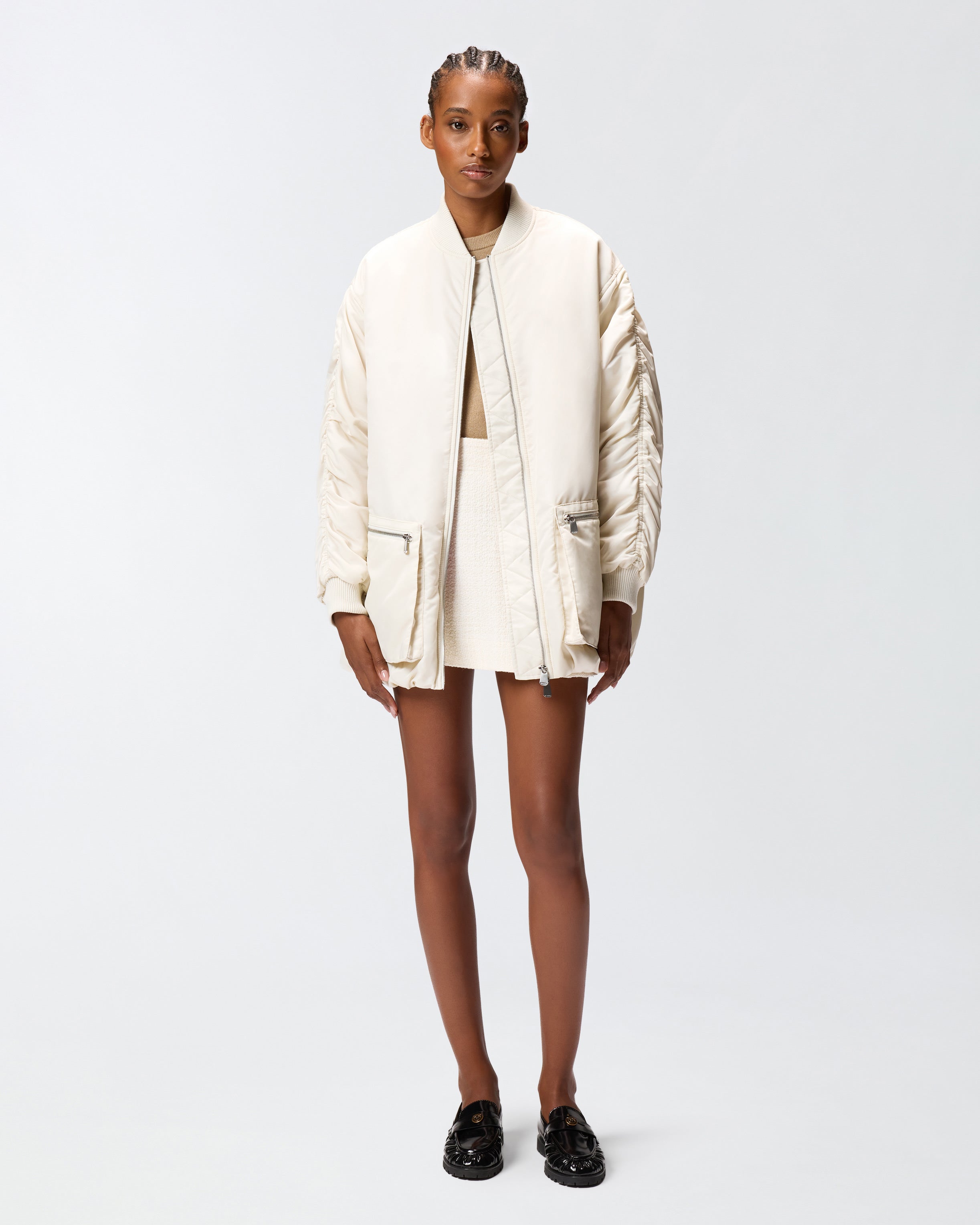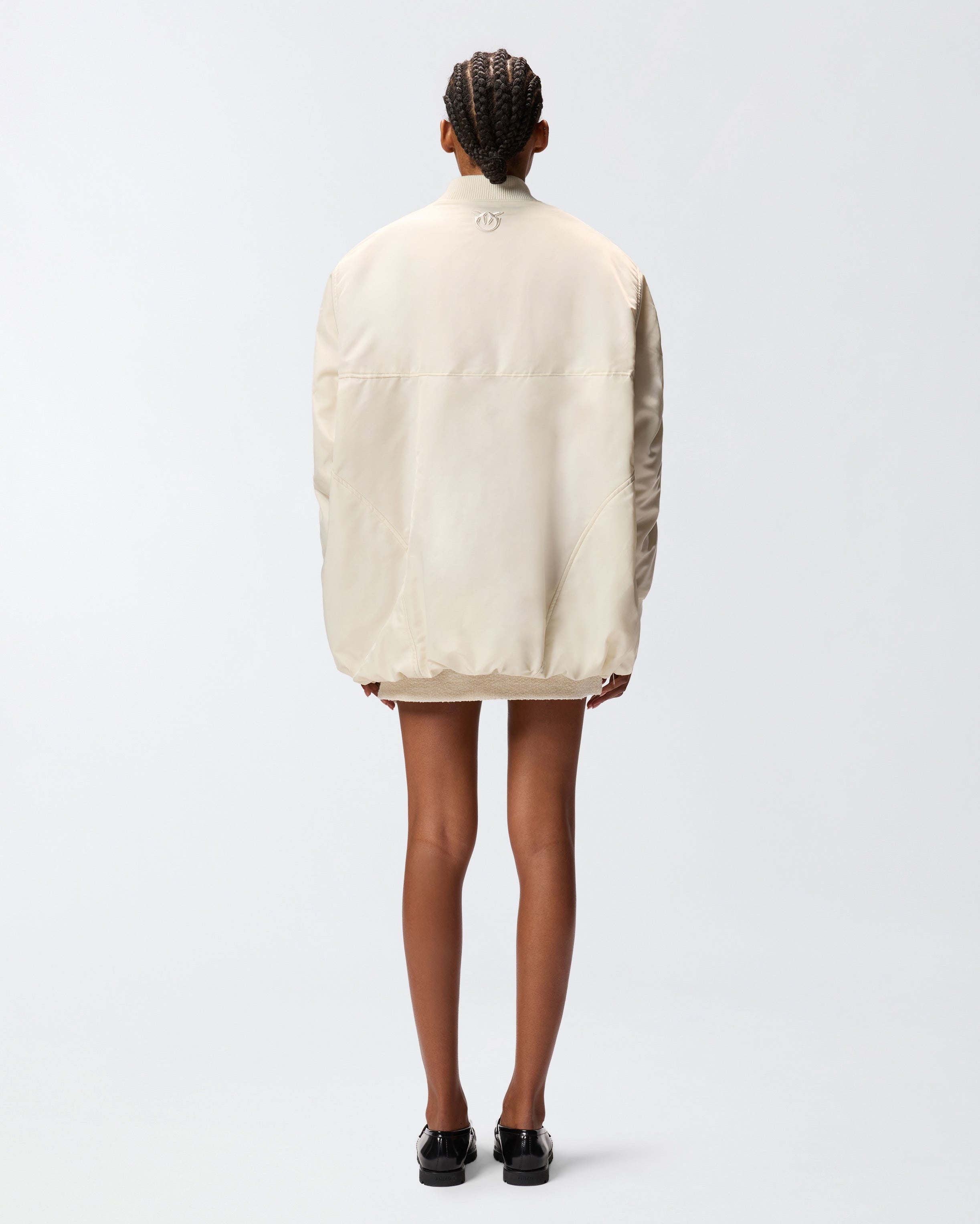 Cazadora de raso técnico con manga larga de hombros caídos y maxibolsillos frontales de estilo utilitario con cremallera. El modelo presenta elementos típicos de la bómber, como el clásico cuello y los puños de punto acanalado, pero también muestra aspectos más inéditos, como la silueta alargada y las mangas fruncidas. El cinturón extraíble está decorado con la emblemática hebilla Love Birds Diamond Cut. Cierre con cremallera de tirador doble en la parte delantera. Para mayor comodidad, esta chaqueta bómber está forrada en su interior con un tejido en contraste.