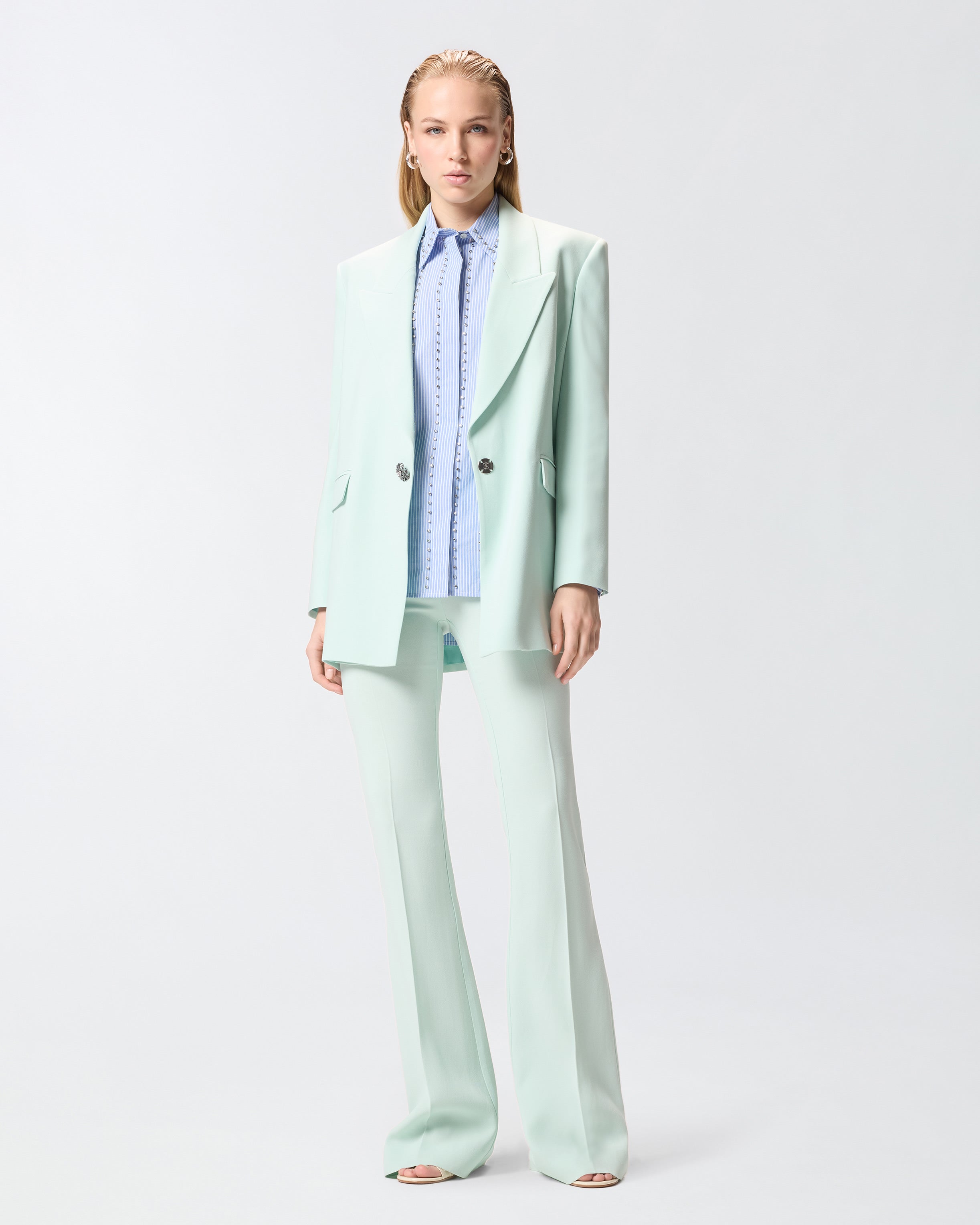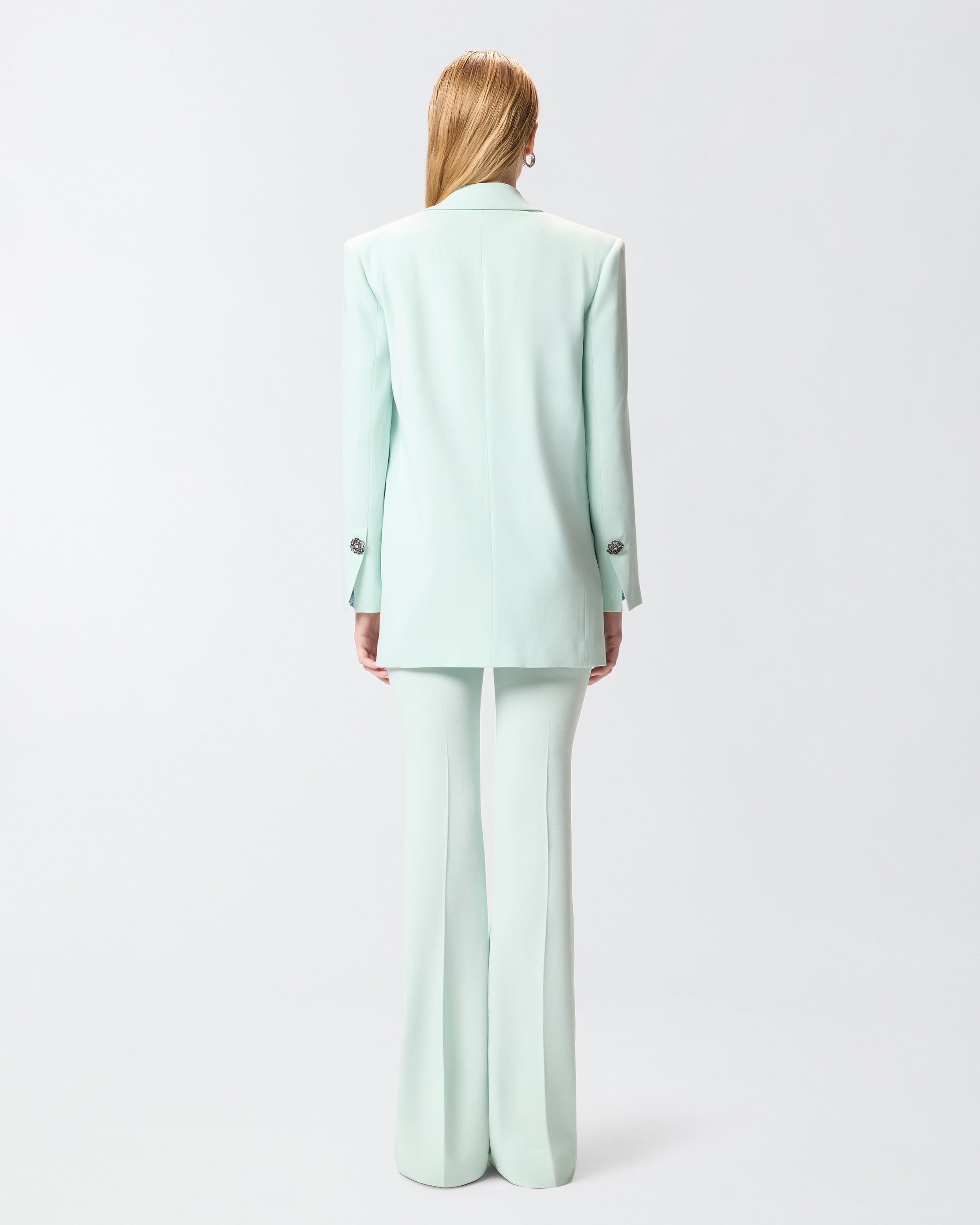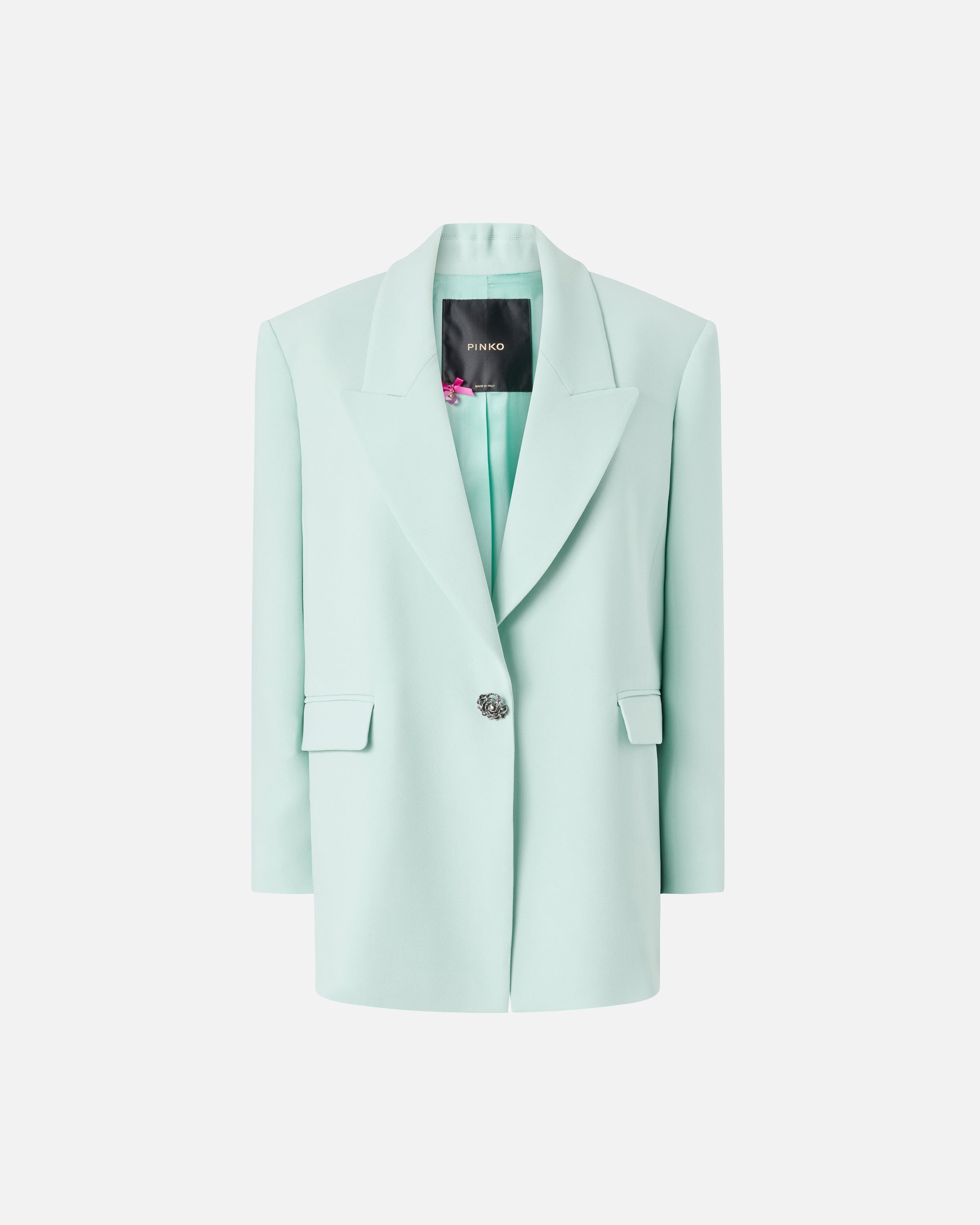 Chaqueta confeccionada en viscosa elástica, tejido icónico que recuerda al clásico cady, caracterizado por un tacto suave y envolvente que se desliza con naturalidad sobre el cuerpo, definiendo la silueta con elegancia y ofreciendo un ajuste impecable. El modelo, con cierre de botonadura sencilla de un botón, presenta solapas de pico, dos bolsillos delanteros con solapa y aberturas con botones en los puños. Sin embargo, los verdaderos protagonistas de la chaqueta son los botones, formados por una aplicación estilo joya en forma de rosa en la que cada pétalo está delicadamente adornado con brillantes cristales. La prenda se completa con un forro interior de aspecto brillante similar al satén, que garantiza una mayor comodidad al llevarla. - MANDARINO JACKET