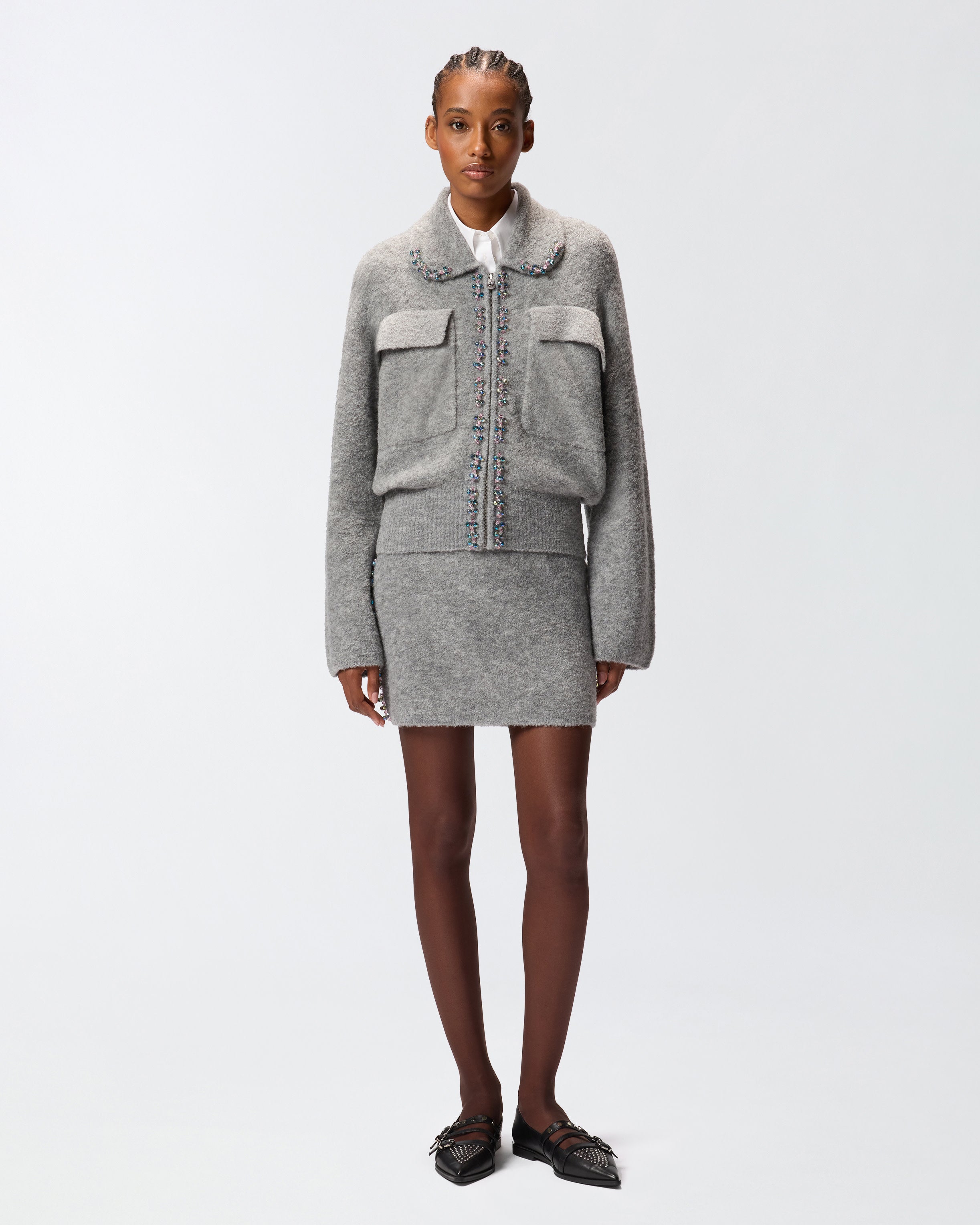 Chaqueta con cuello, bolsillos con solapa en el pecho y banda elástica en la parte inferior, confeccionada en suave punto de mezcla de lana efecto bouclé. El logotipo de letras PINKO tono sobre tono destaca en la parte posterior, mientras que los bordes del cuello con puntas redondeadas y los laterales del cierre de cremallera están delineados con coloridas cuentas tipo joya para iluminar el look y embellecer el tejido. La prenda se ha sometido a pruebas de acabado para minimizar la posible formación de bolitas, garantizando una mayor suavidad y durabilidad del tejido.
