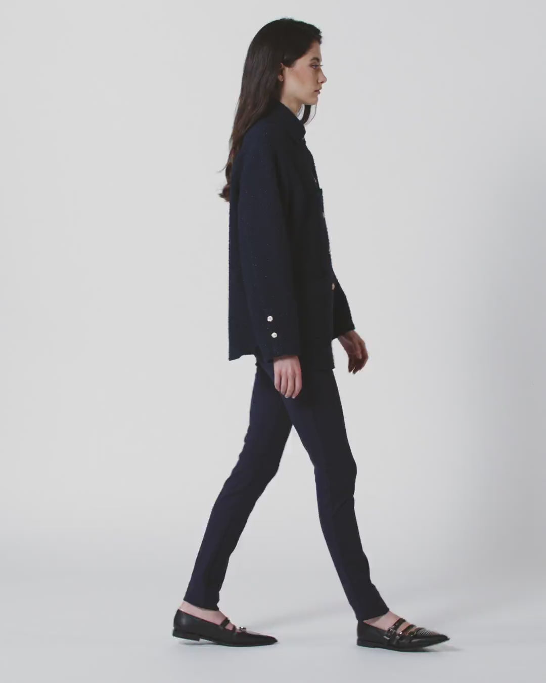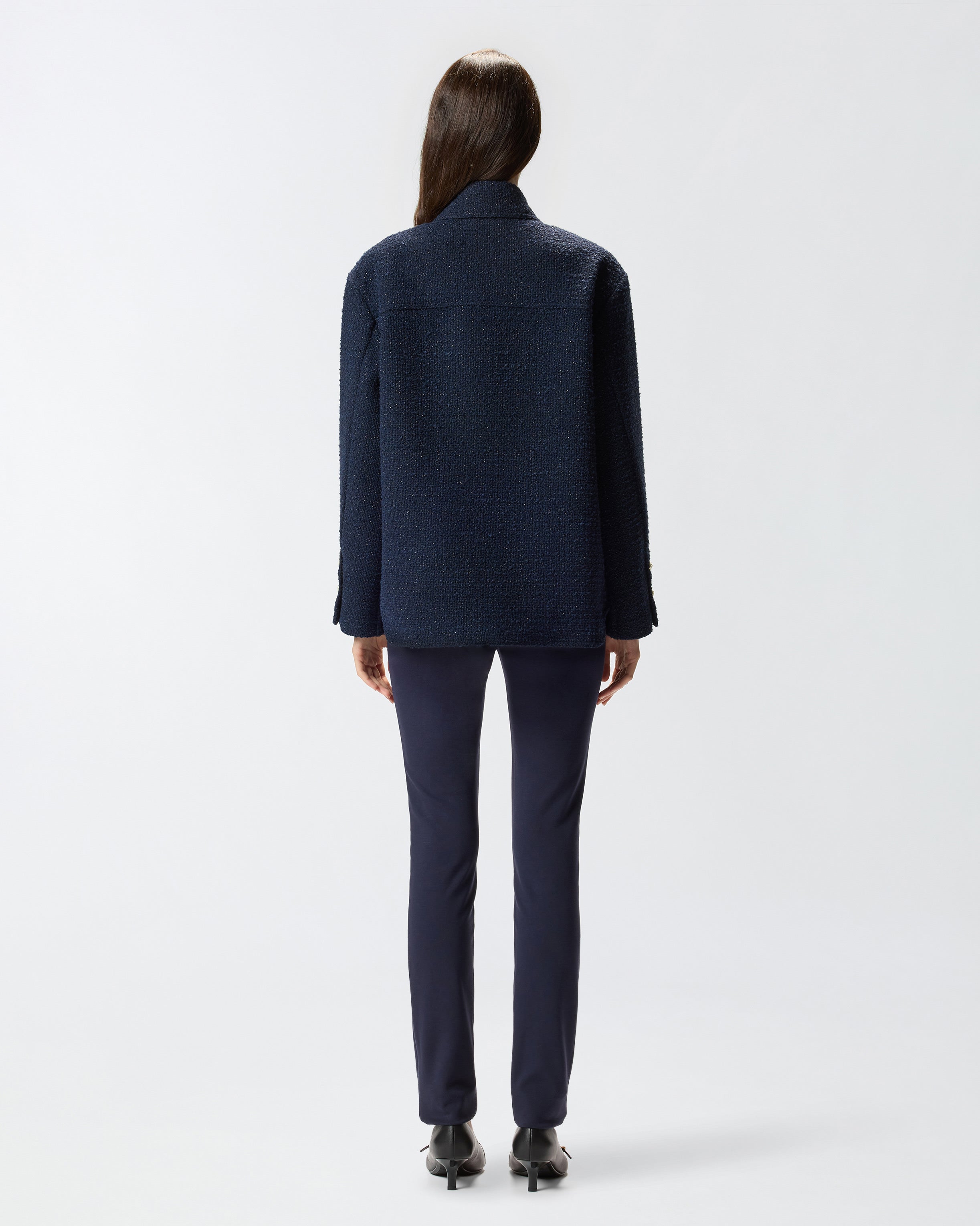 Chaqueta holgada de tweed acoplado con cuello clásico y cierre en la parte delantera con botones de metal decorados con estrellas. El modelo presenta manga larga montada y cuenta con dos bolsillos de parche aplicados en la parte inferior y uno aplicado en el pecho. La chaqueta está forrada y es perfecta para el cambio de temporada: combínala con unos vaqueros y una camisa ligera para un look clásico pero femenino.