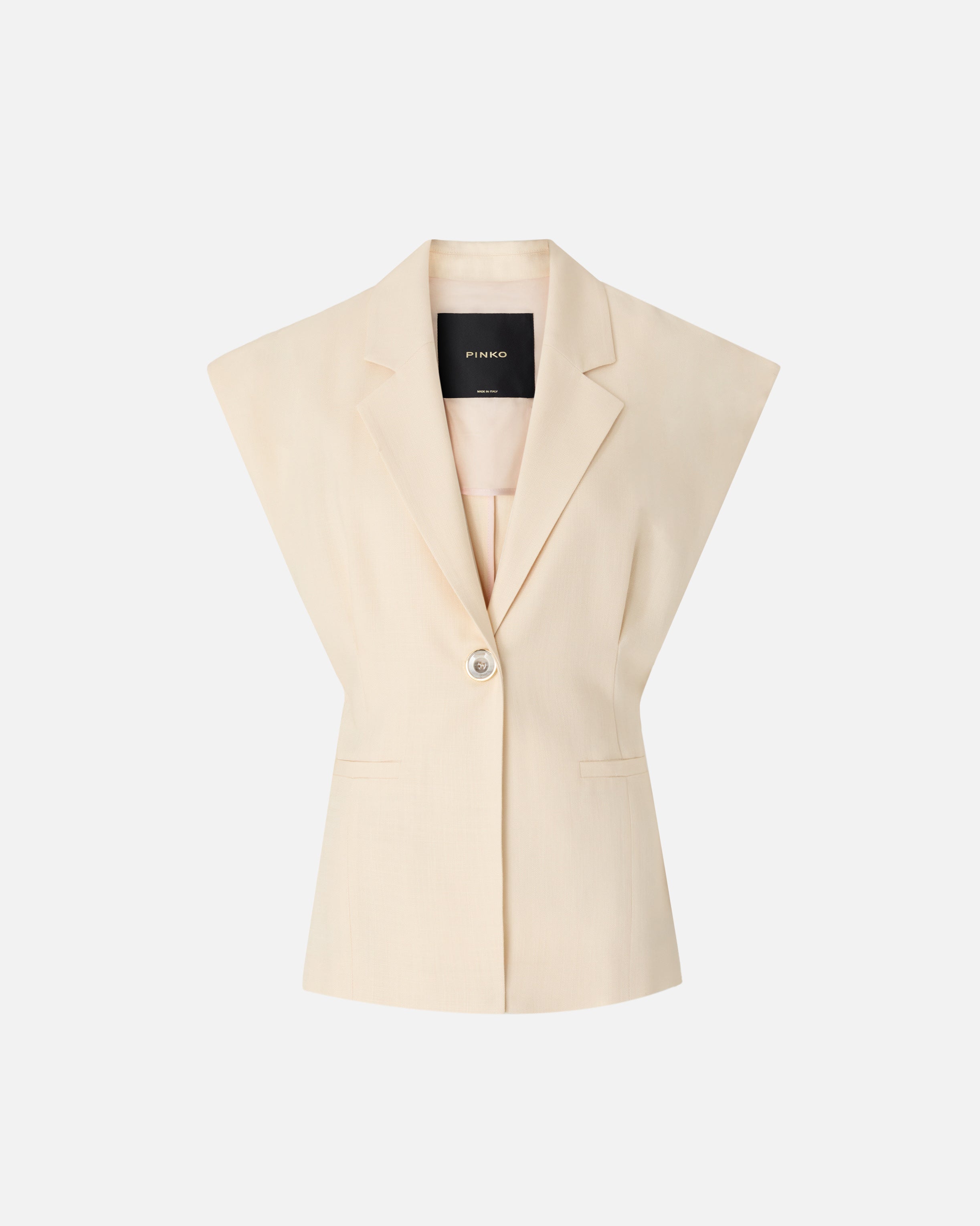 Chaqueta sin mangas confeccionada en un tejido panamá que evoca el inconfundible aspecto rústico del lino para crear un look elegante y desenfadado. La prenda presenta un cierre de botonadura simple con un botón y se caracteriza por solapas clásicas, dos refinados bolsillos de ribete y pinzas en la parte delantera y trasera que dan forma a la cintura. El forro tono sobre tono confeccionado en algodón puro garantiza una mayor comodidad. Ponte esta chaqueta con la falda a juego para crear un total look femenino ideal para ocasiones formales.