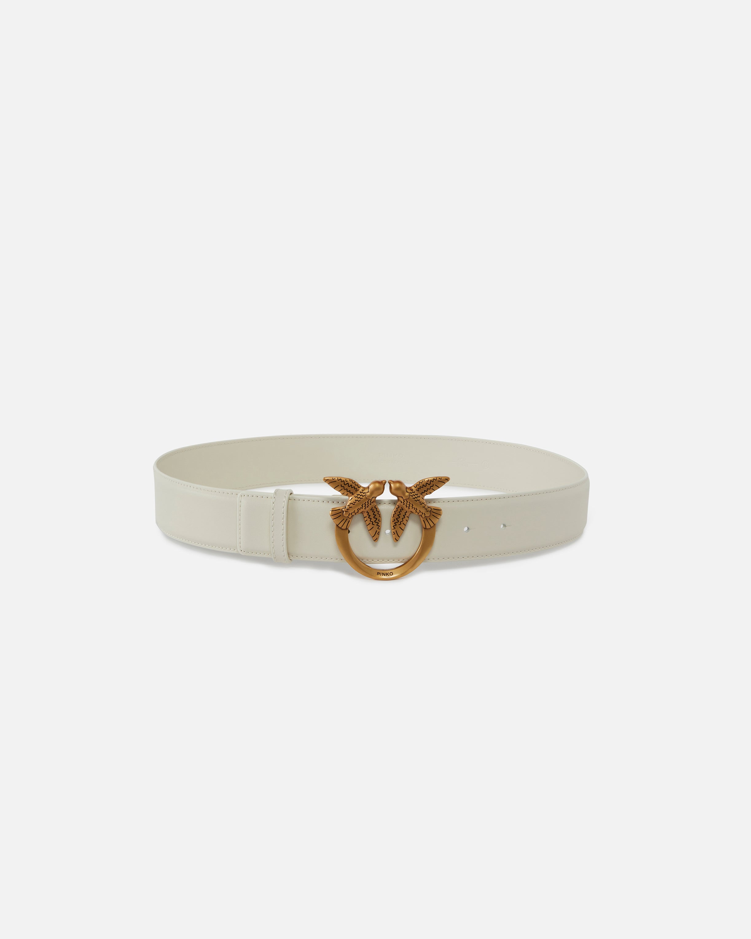 Cinturón para llevar alto en la cintura de piel lisa con acabado sedoso y hebilla Love Birds Diamond Cut de metal.