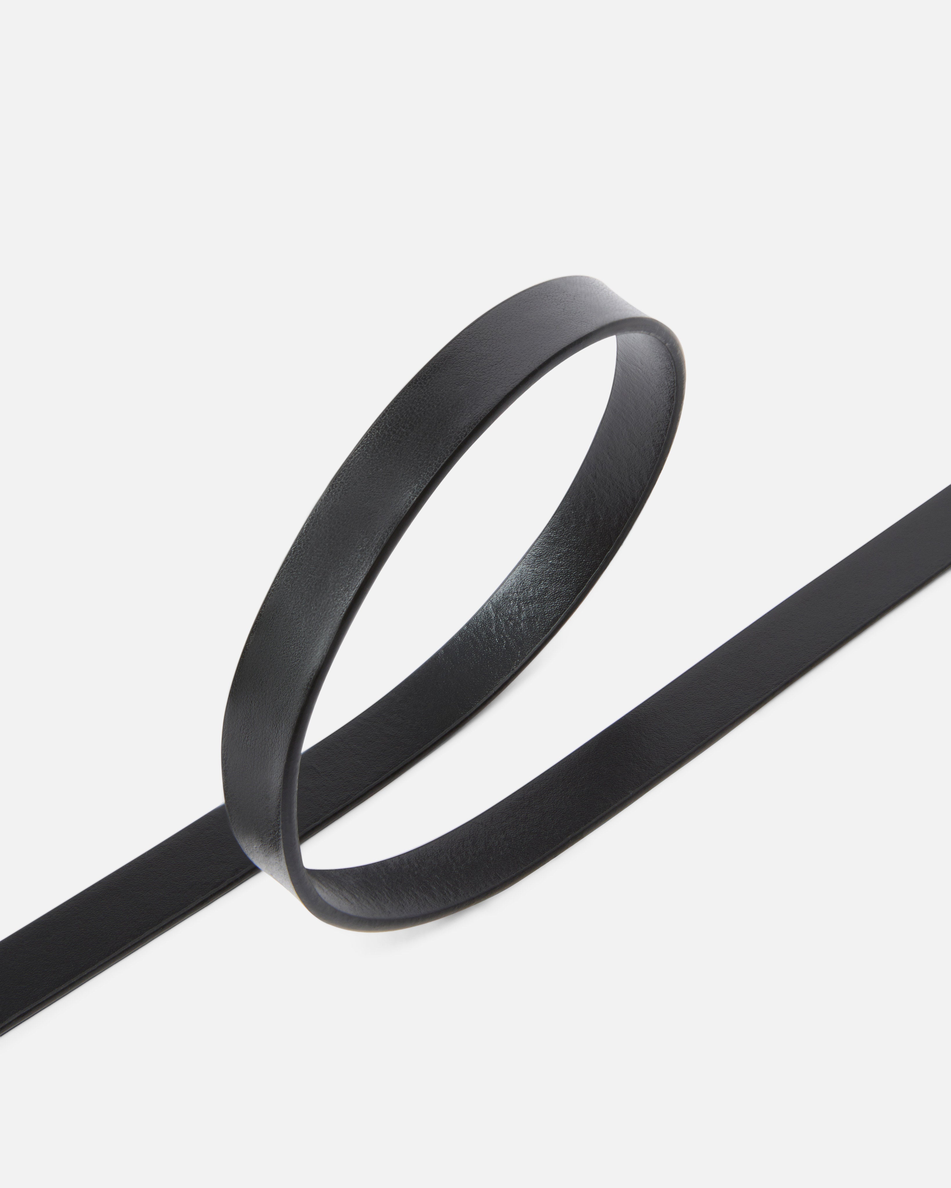 Cinturón fino de 1,2 cm de ancho en piel suave y brillante. Los detalles metálicos con galvanizado plateado se encuentran en la hebilla de diseño sencillo y personalizan el modelo con el nombre de la marca. El interior está realizado en parte con un material derivado de fibras de cuero regeneradas. Esencial y refinado, este accesorio es la pieza imprescindible para tus looks de día, entre otros.