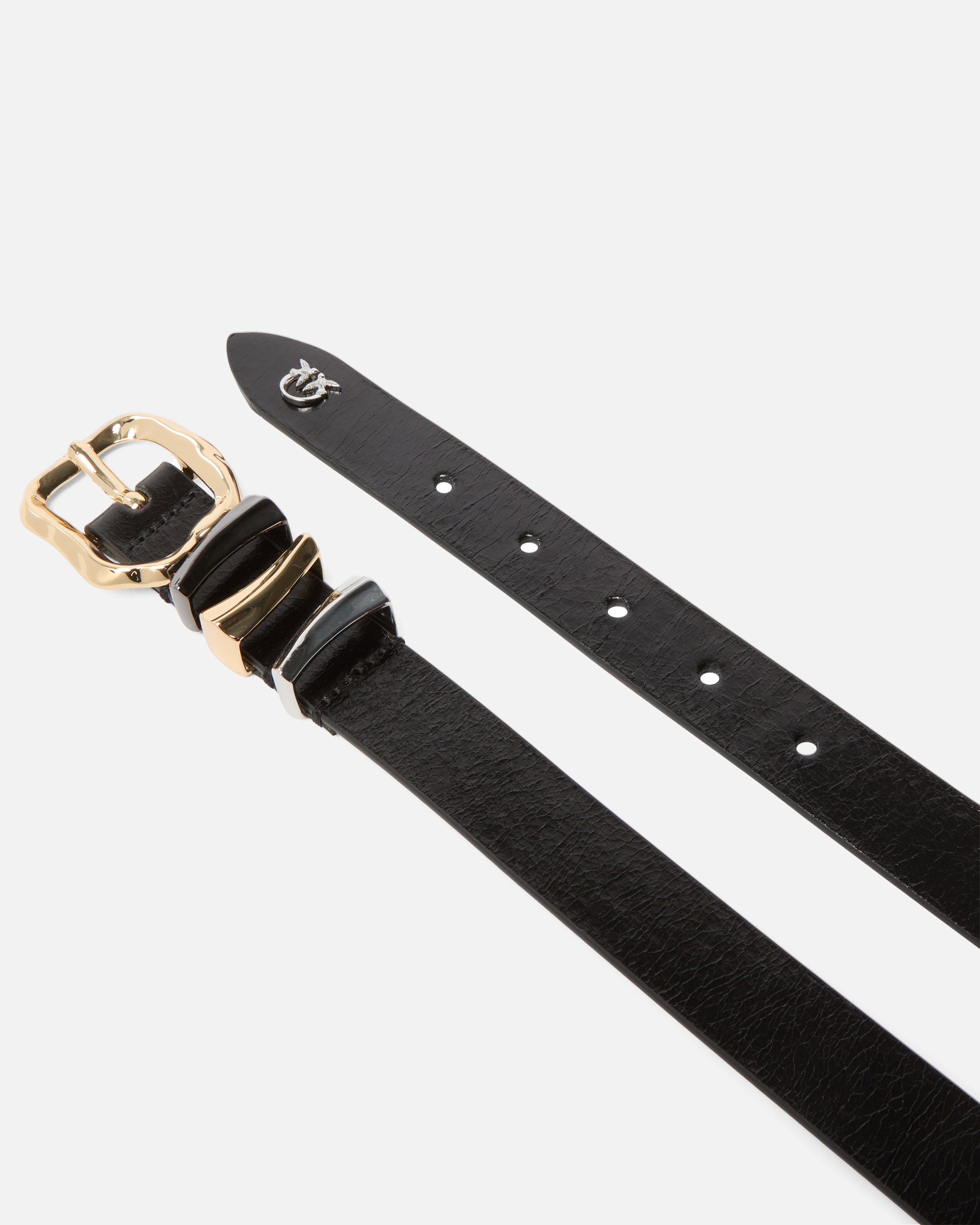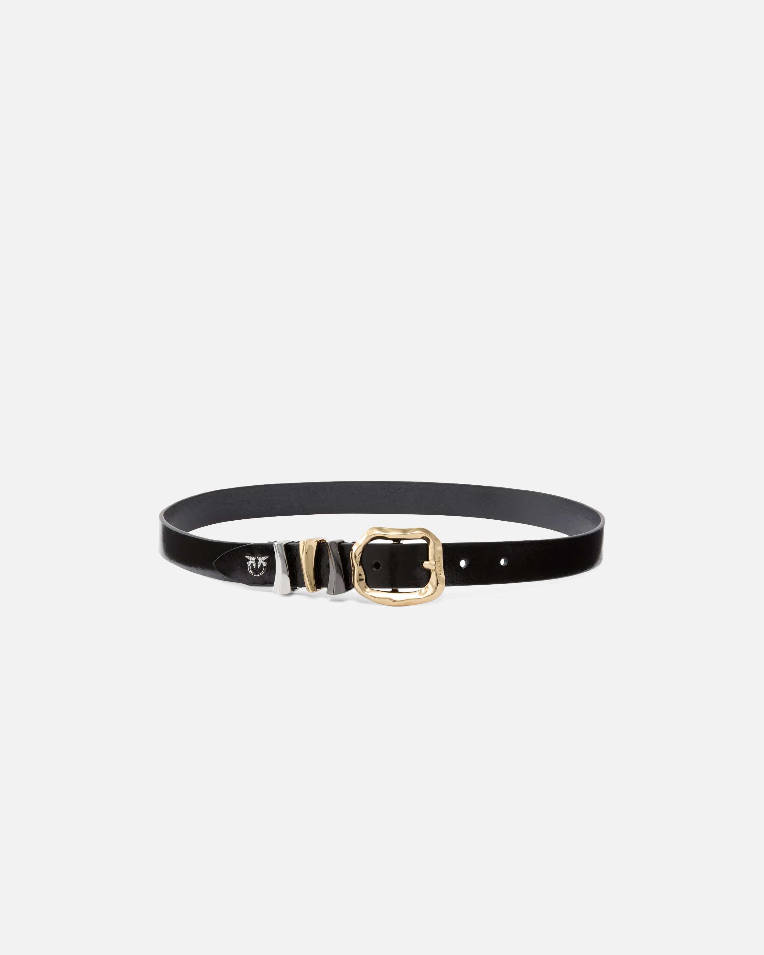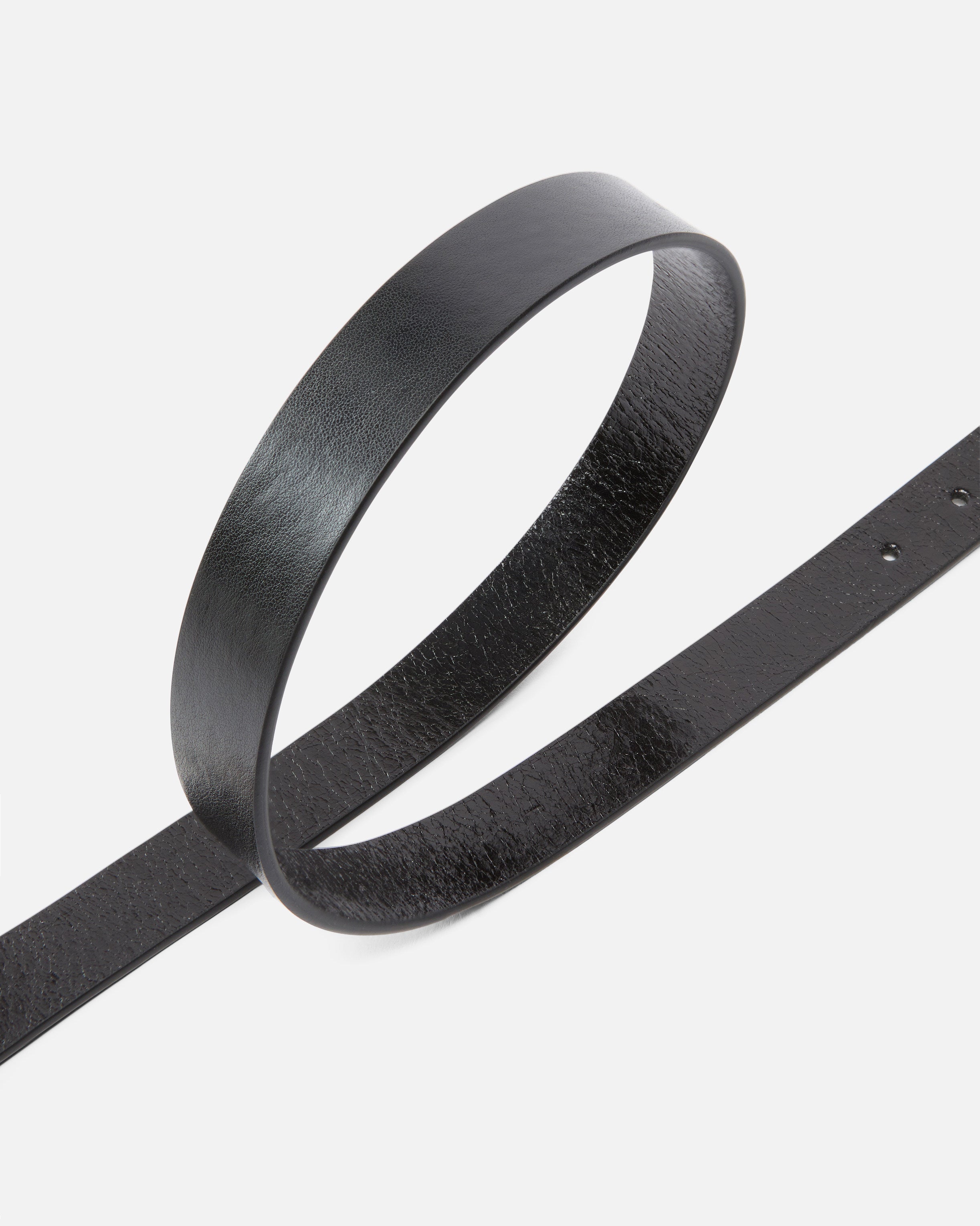 Cinturón fino de 2 cm de ancho en suave piel flor con efecto brillante. Caracterizado por trabillas de anilla metálicas en distintos galvanizados, este accesorio resulta original y refinado. El interior está realizado en parte con un material derivado de fibras de cuero regeneradas. El diseño se completa con el logotipo Love Birds plateado en el extremo.