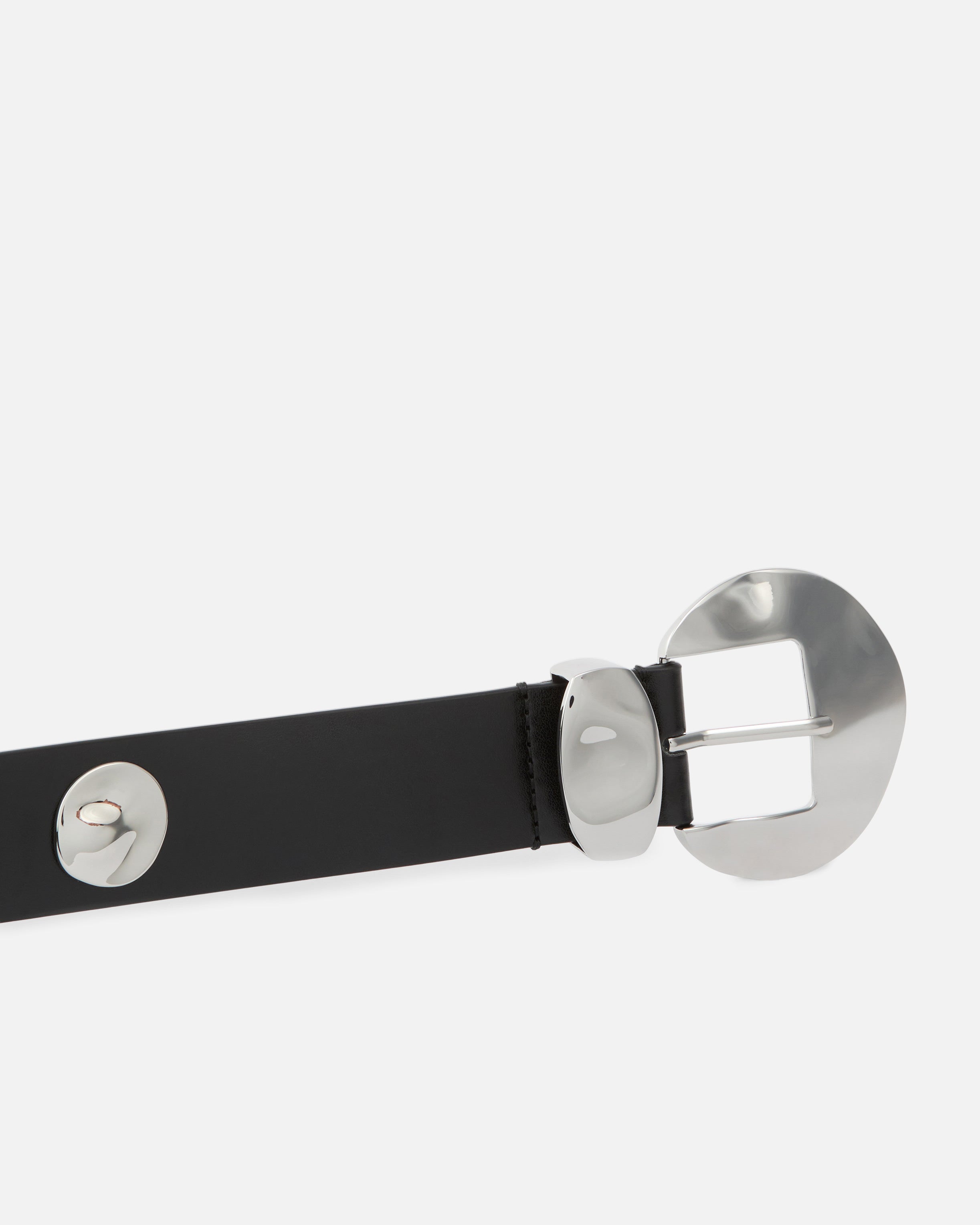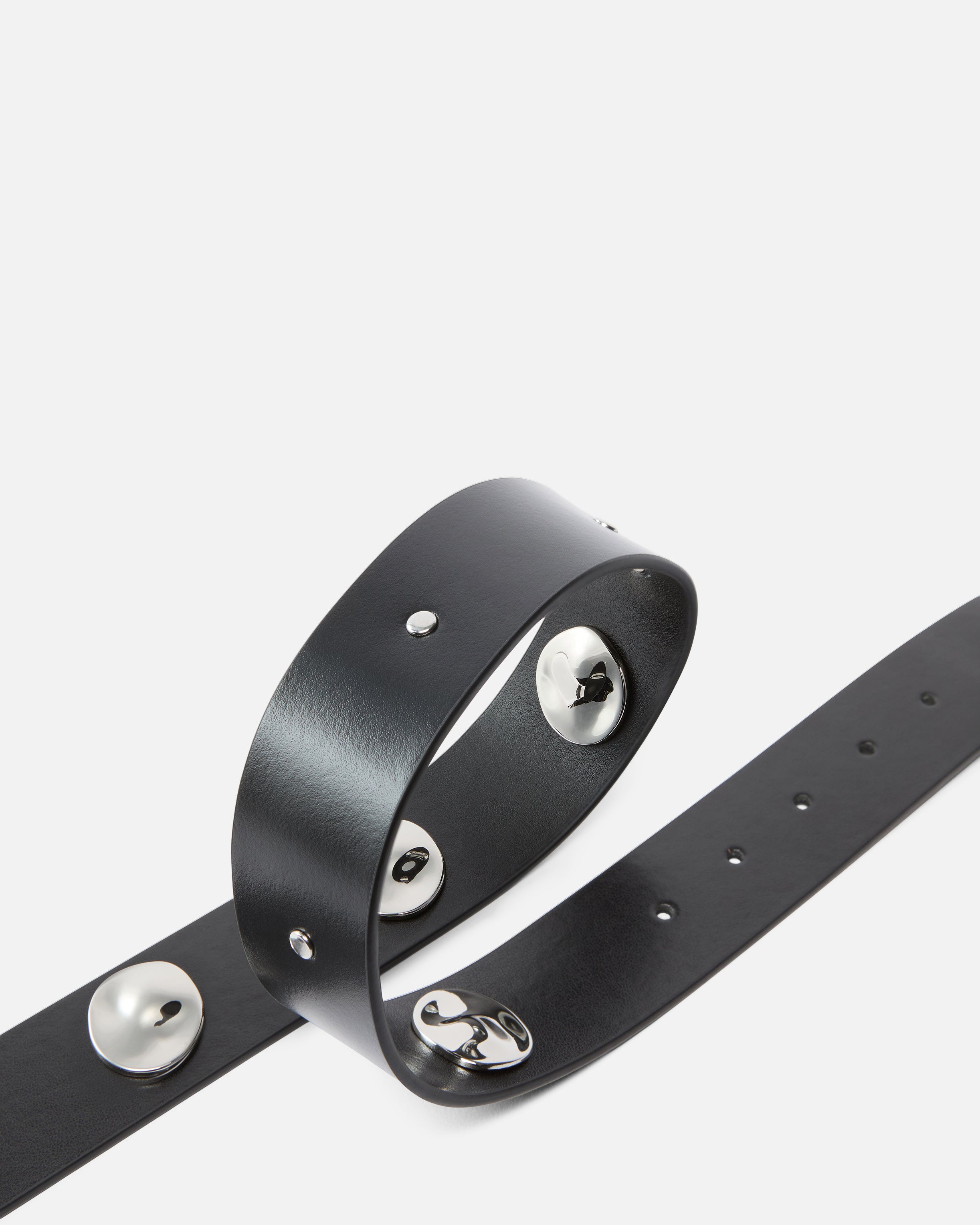 Cinturón de 4 cm de ancho en piel suave con hebilla brillante de diseño irregular en metal con galvanizado plateado. Las tachuelas retoman el color y la forma de la hebilla, dando al accesorio un toque atrevido e irrepetible. El diseño se completa con el logotipo Love Birds plateado en el extremo. El interior está realizado en parte con un material derivado de fibras de cuero regeneradas. Combina este versátil accesorio con unos vaqueros para lucir un conjunto informal que no deja nada al azar.