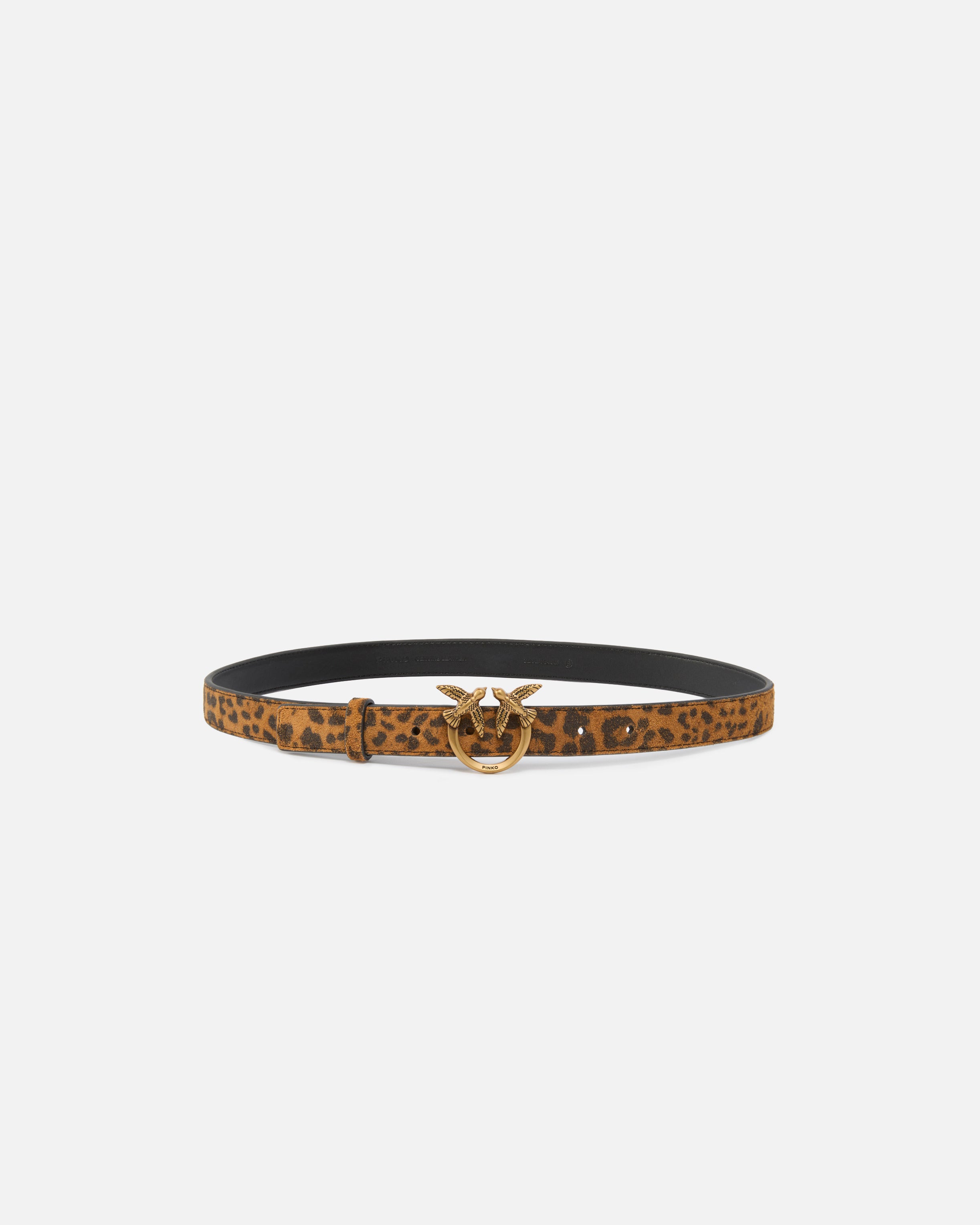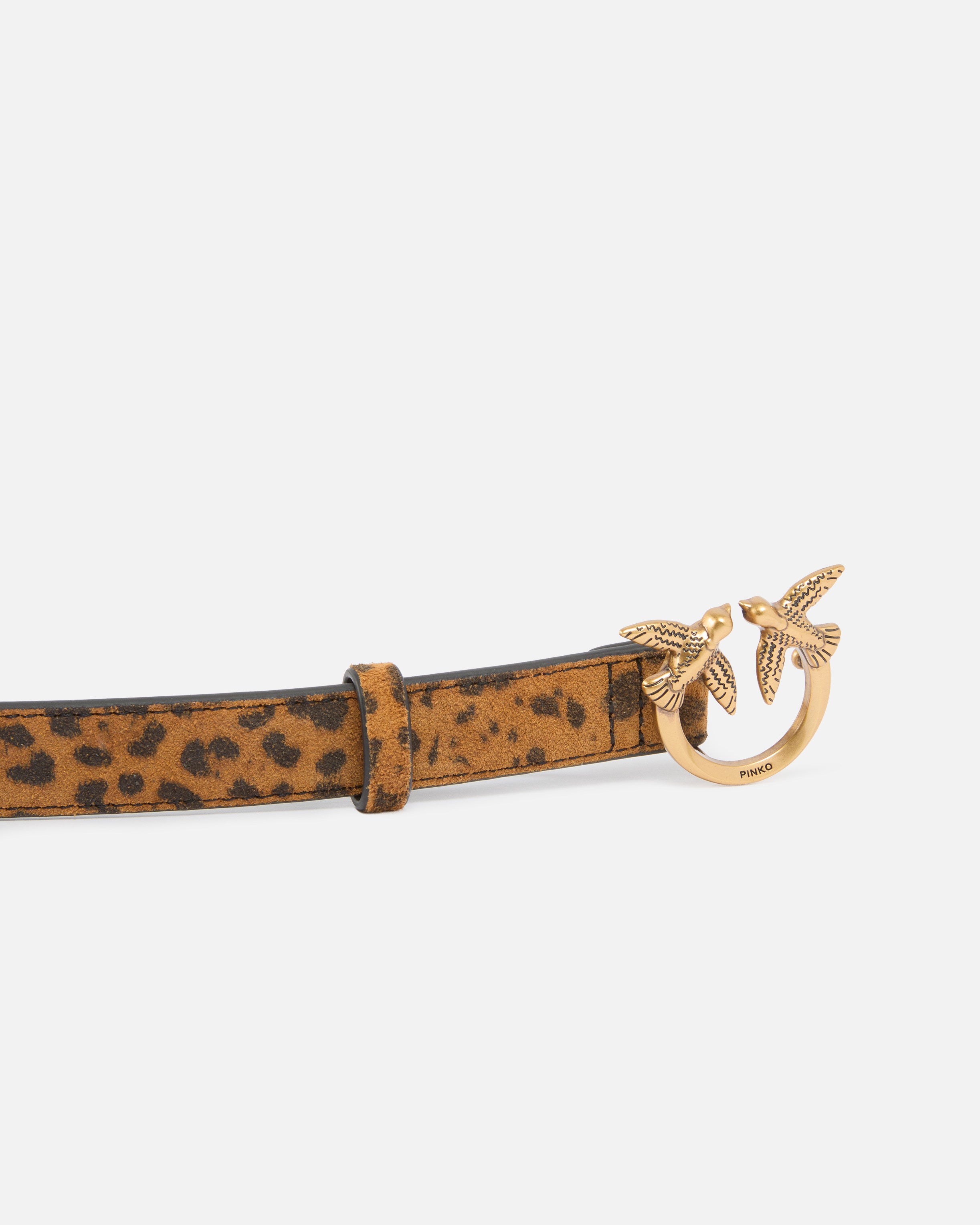 Cinturón de 2 cm de ancho realizado en ante suave y caracterizado por un atrevido estampado de leopardo en tonos cálidos y naturales. El modelo presenta un interior liso a contraste que resalta el atractivo del motivo animal del exterior y se completa con la icónica hebilla metálica con el logotipo Love Birds.