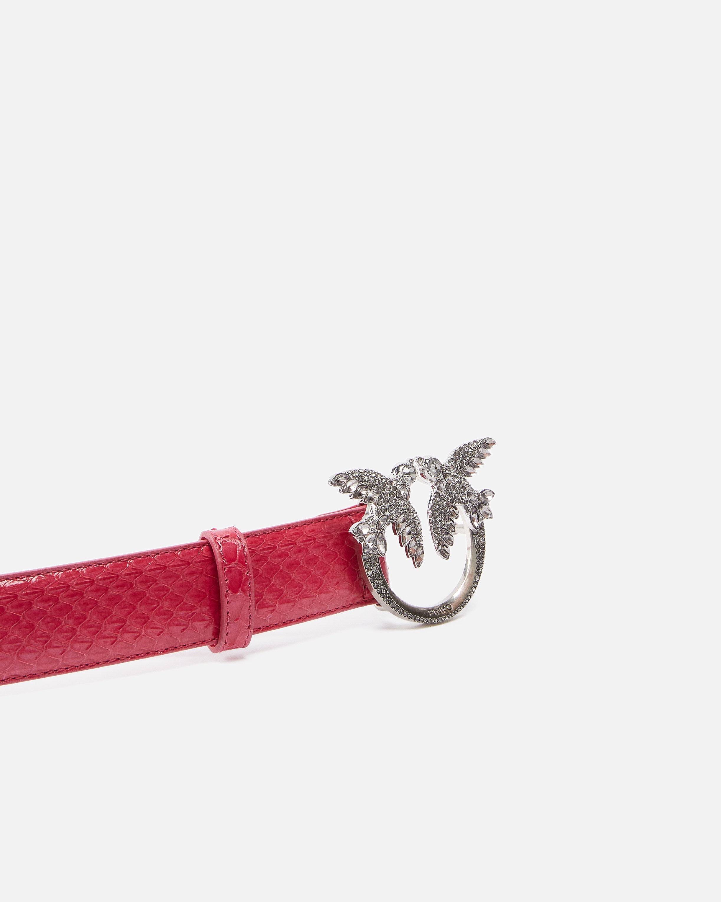 Cinturón para mujer de 3 cm de alto en preciosa piel de pitón ayers caracterizado por un especial y refinado acabado brillante. El cinturón podría presentar imperfecciones naturales, derivadas de la propia piel y del proceso de aplicación manual: estas características no deben considerarse un defecto, sino un rasgo distintivo y personal de cada modelo. El interior del cinturón está realizado en piel lisa, mientras que el cierre se personaliza con una minihebilla con el logotipo de los pajaritos Love Birds Diamond Cut de metal, adornada con pavé de cristales, para dar un toque brillante a tus looks de noche. El accesorio forma parte de la colección cápsula especial de edición limitada creada en exclusiva para PINKO Galleria.
