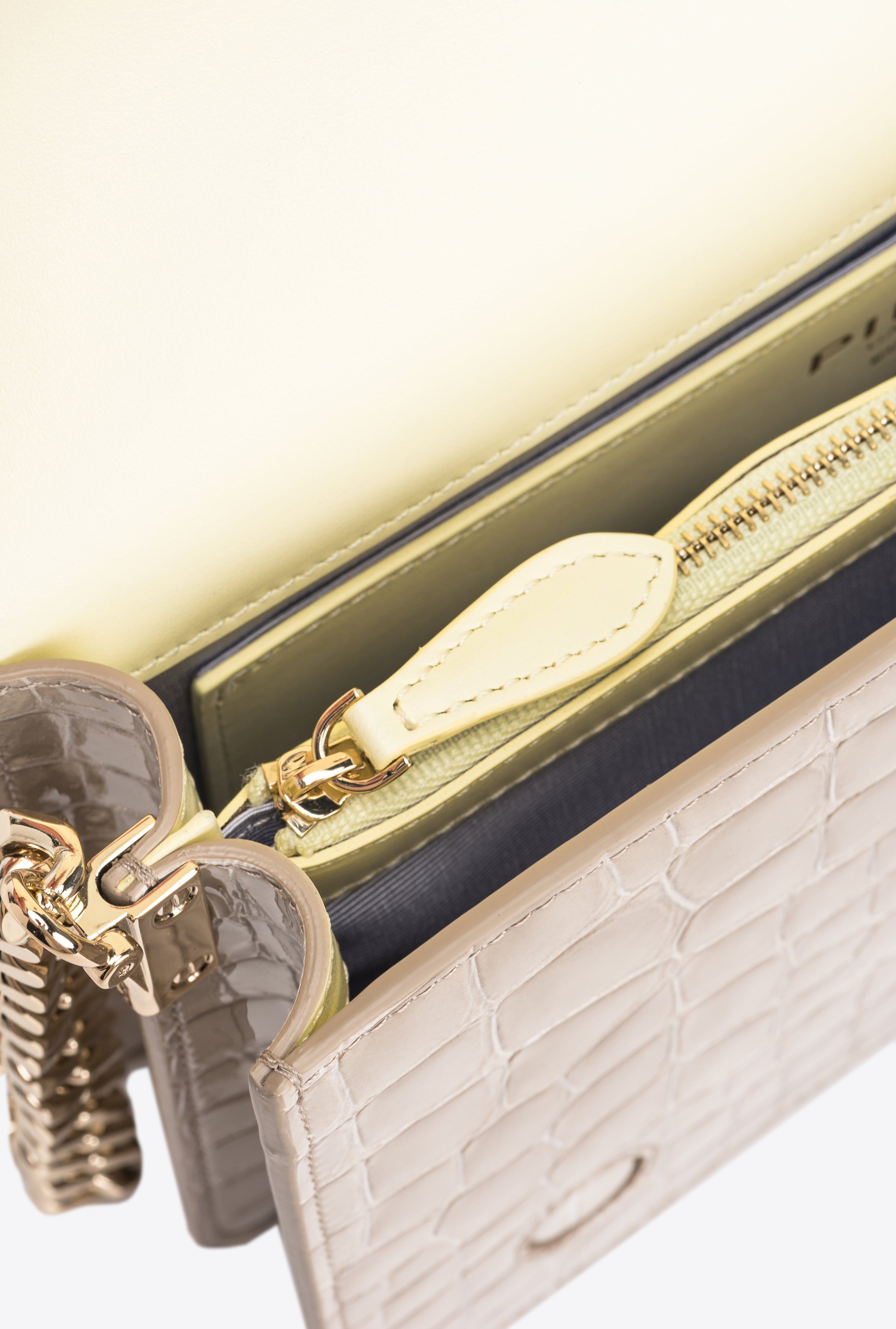 Bolso Classic Love Bag Click de piel con estampado de cocodrilo con efecto brillante y ligeramente repujado, en una combinación de dos variantes de color diferentes. El cierre automático oculto se completa con la emblemática hebilla Love Birds Diamond Cut de metal galvanizado en oro claro con esmalte blanco, adornada con pavé de piedras negras. El interior está forrado en un color a contraste e incluye un bolsillo plano y un panel divisorio con cierre de cremallera. La correa combina la clásica cadena redonda con una práctica tira ajustable de piel para el hombro. El bolso forma parte de la colección cápsula especial de edición limitada creada en exclusiva para PINKO Galleria. ¡Utiliza el chip especial NFC para vivir una experiencia única y específica del bolso que has comprado!