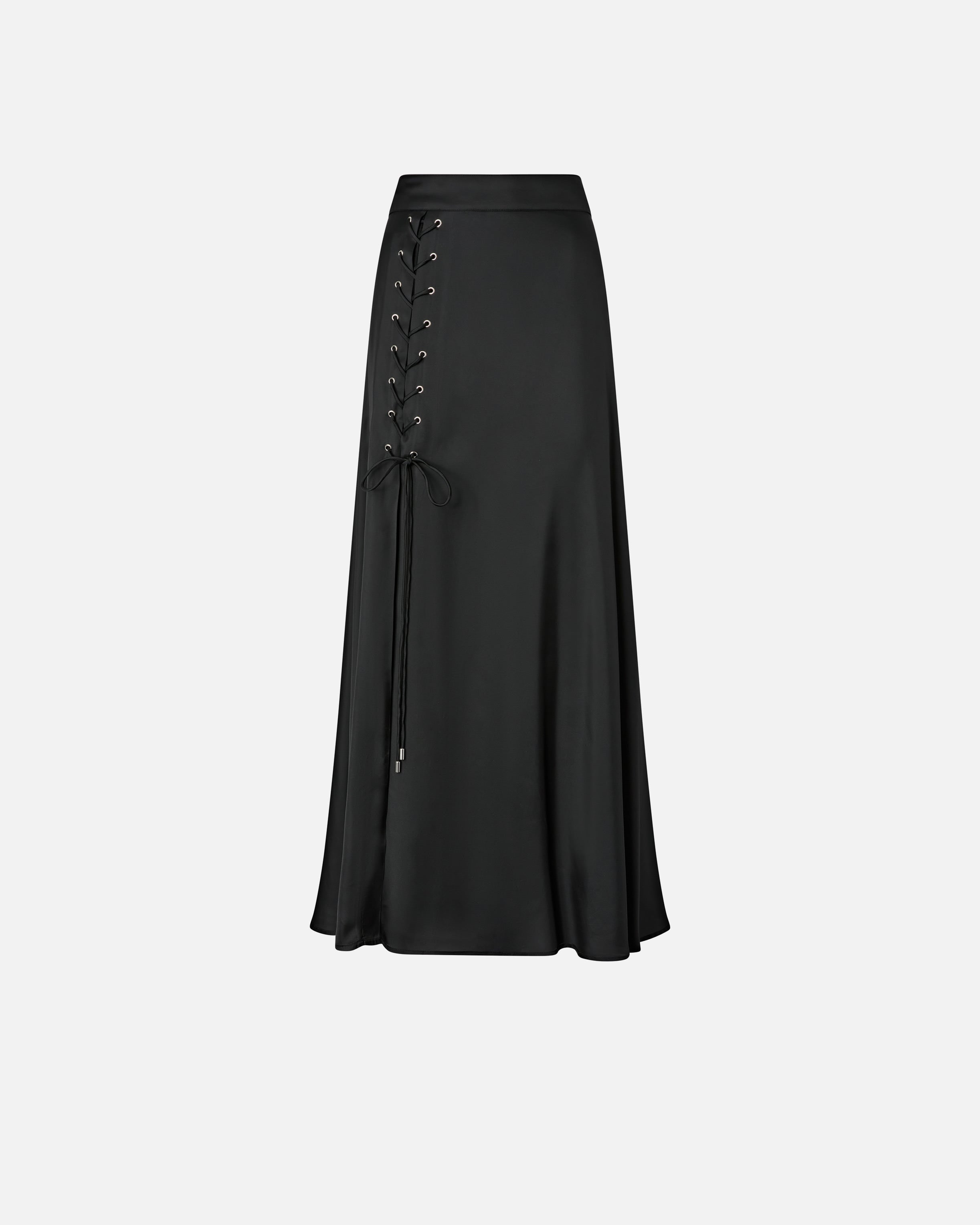 Falda larga de línea holgada y evasé, confeccionada en tejido de sarga para un efecto aún más fluido y deslizante. El modelo, que cuenta con un cómodo cierre con cremallera invisible en la parte trasera, se distingue por la pronunciada abertura lateral en la parte delantera con ojales metálicos y cordones cruzados para ajustar y anudar según se prefiera, acabados con finales metálicos. La ligereza del tejido y los seductores detalles de inspiración corsetera hacen de esta prenda un aliado perfecto para combinar con un top minimalista y un par de sandalias joya para un look de noche elegante pero con el toque de determinación típico de PINKO.