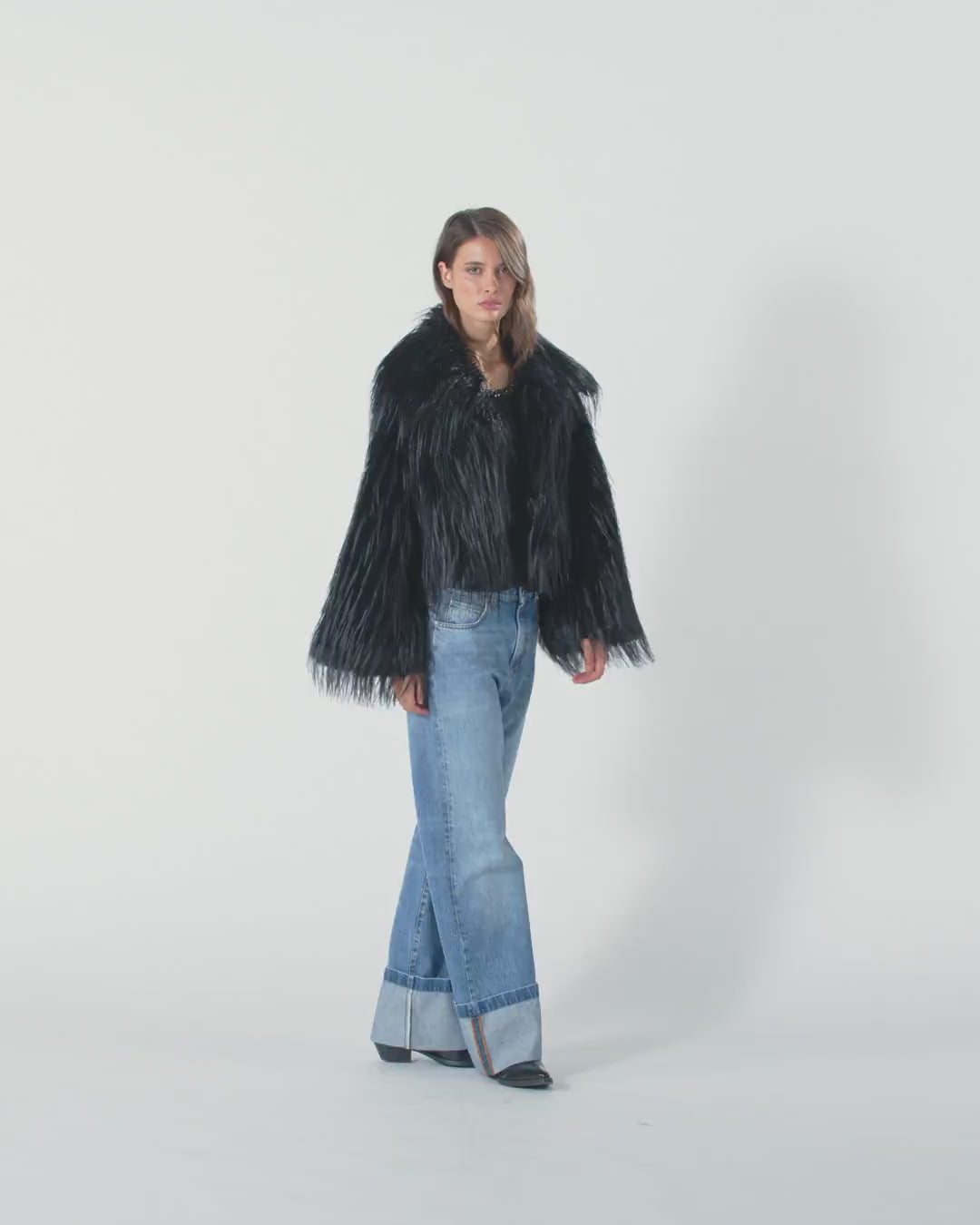 Chaqueta estilo gabán de manga larga con cuello amplio y envolvente confeccionada en un suave tejido Aspen efecto pelo. El modelo, listo para regalarte un look de auténtica estrella, se completa con un cierre frontal oculto y está forrado para garantizar un uso cómodo.