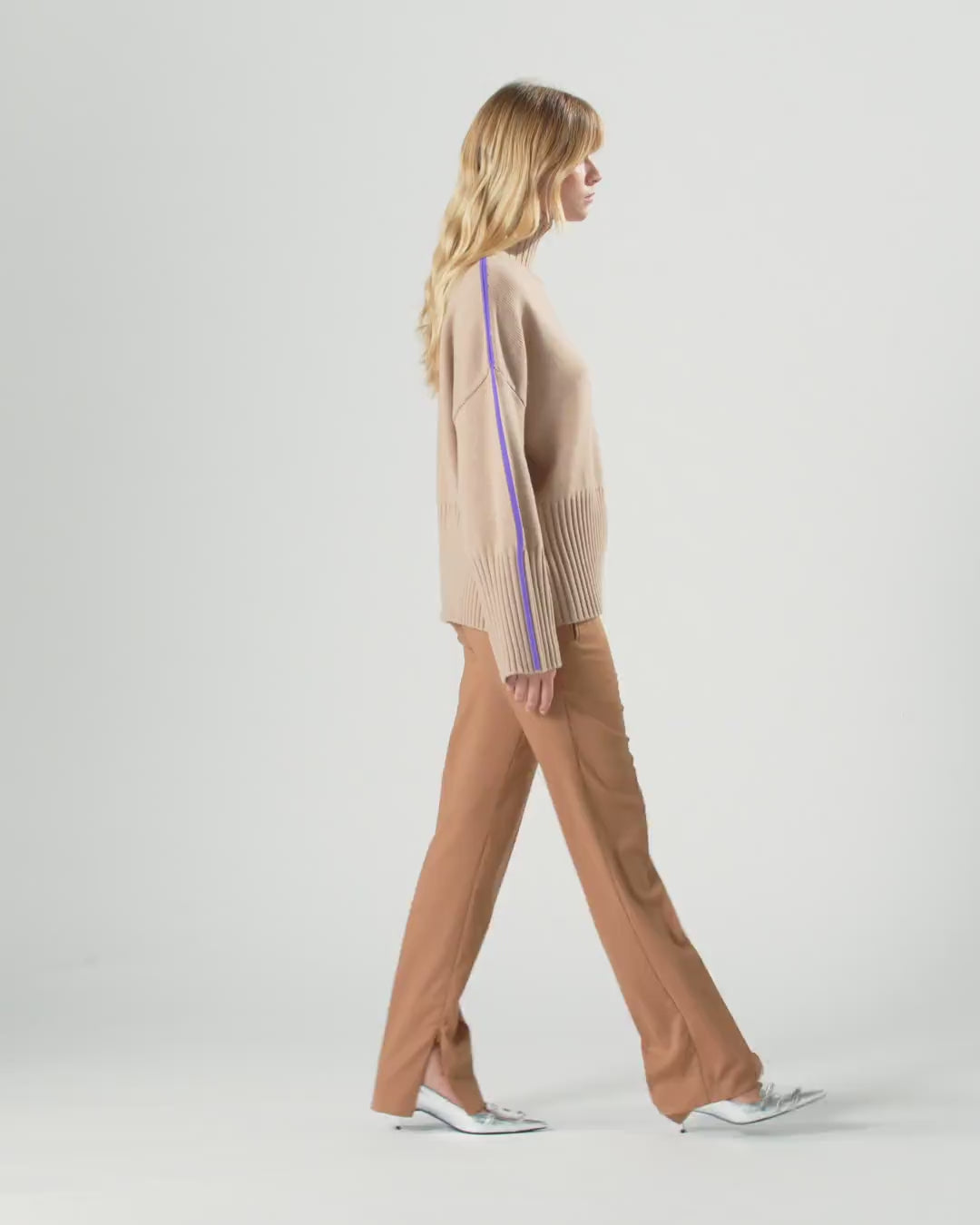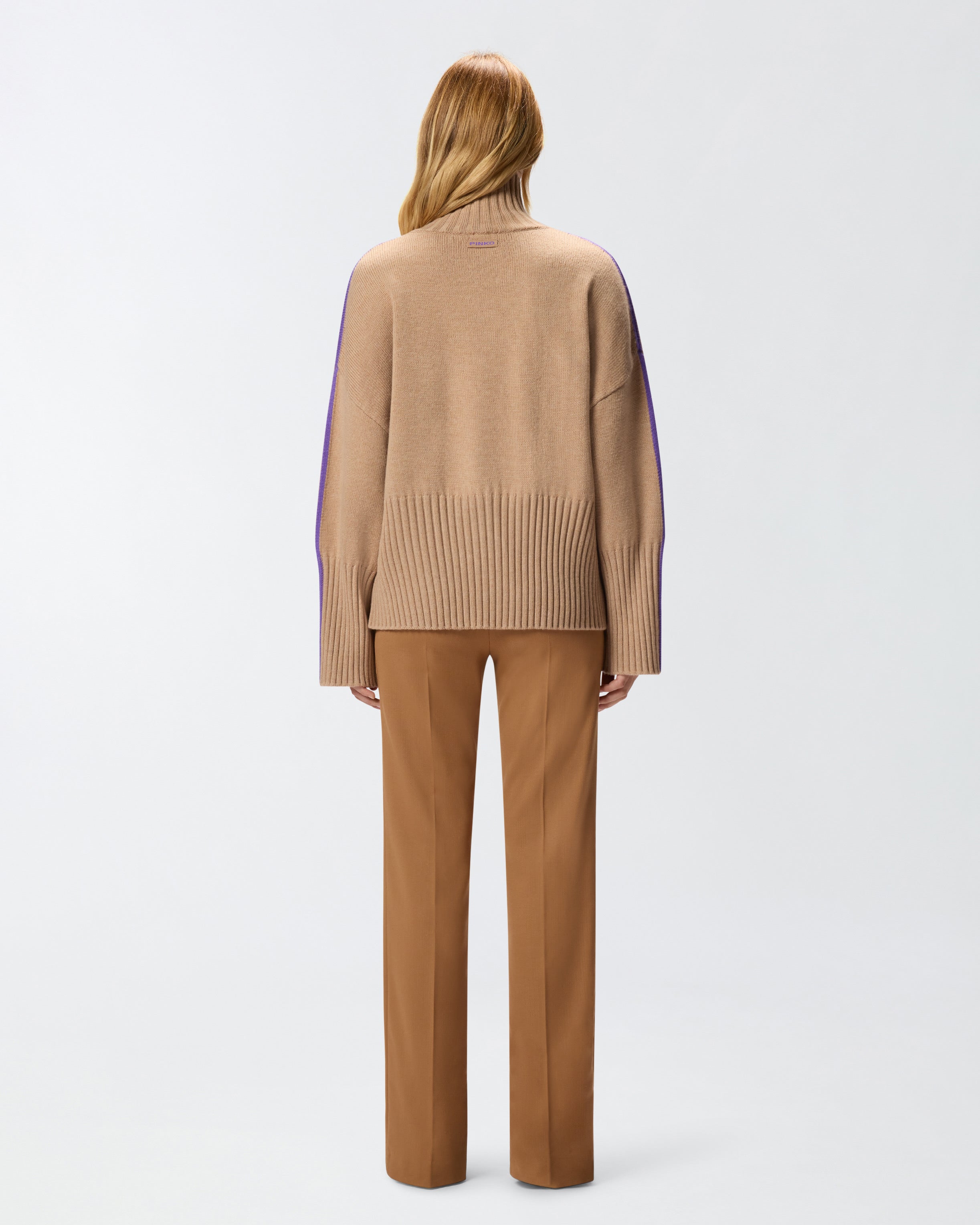 Jersey de cuello alto y corte relajado, confeccionado en lana merina de alta calidad, con cuello redondo, bajo y puños de canalé. El hilado en contraste de las mangas aporta un toque llamativo al diseño y retoma el color del logotipo de letras PINKO en la parte trasera de la prenda. La prenda se ha sometido a pruebas de acabado para minimizar la posible formación de bolitas, garantizando una mayor suavidad y durabilidad del tejido. Elegante y versátil a la vez, este modelo es perfecto para cualquier ocasión.
