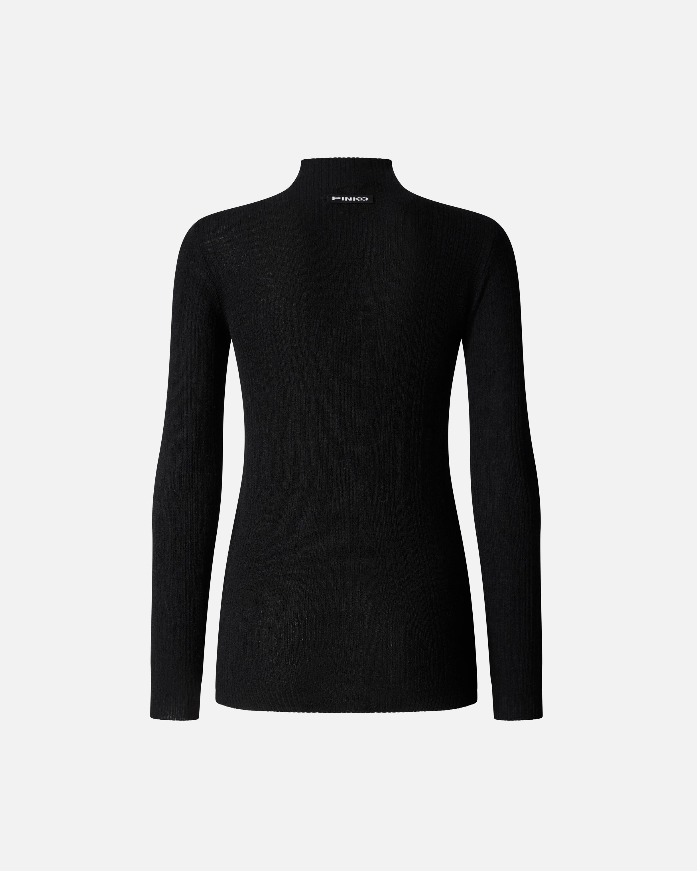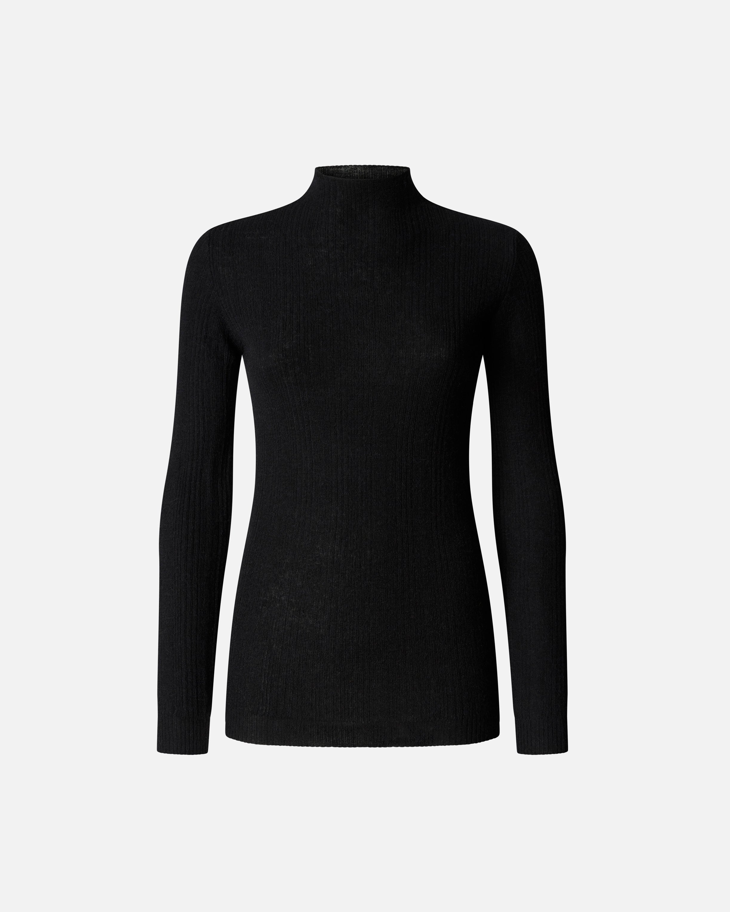 Jersey de manga larga sin costuras confeccionado en mezcla de lana de alpaca supersuave, un hilado hecho en Italia y capaz de ofrecer una sensación de suavidad al tacto y al llevarlo puesto. La línea ceñida del jersey de cuello alto se completa con la etiqueta con el logotipo en la parte central trasera. El detalle final lo aporta la delicada confección de canalé en toda la prenda. La prenda se ha sometido a pruebas de acabado para minimizar la posible formación de bolitas, garantizando una mayor suavidad y durabilidad del tejido.