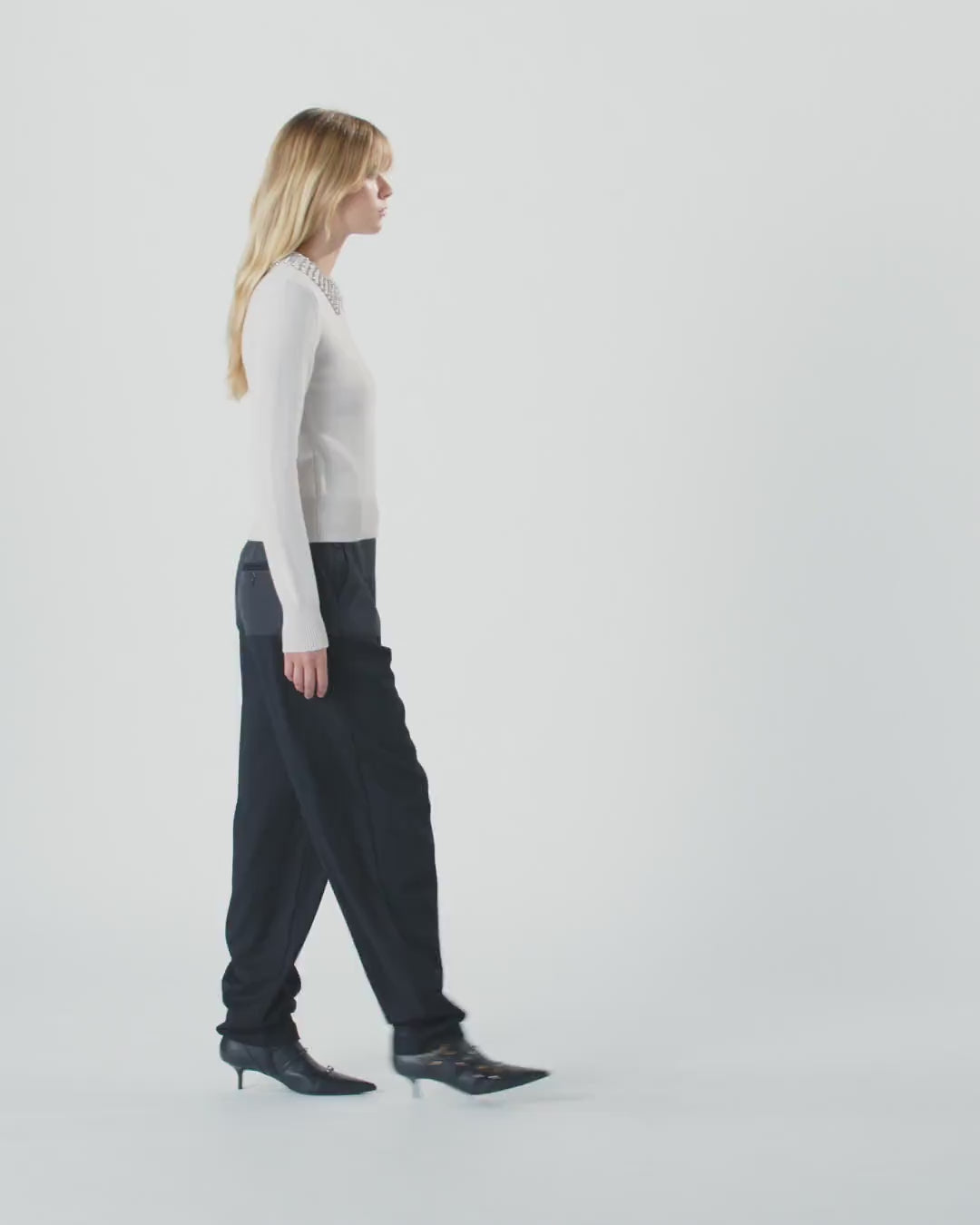 Jersey de manga larga y corte ceñido con cuello estilo polo. El cuello llama la atención de inmediato gracias a las aplicaciones de strass que adornan el diseño. Bajo y puños son de canalé, mientras que en la parte inferior delantera destaca la etiqueta tono sobre tono con el logotipo de letras PINKO. La prenda se ha sometido a pruebas de acabado para minimizar la posible formación de bolitas, garantizando una mayor suavidad y durabilidad del tejido.