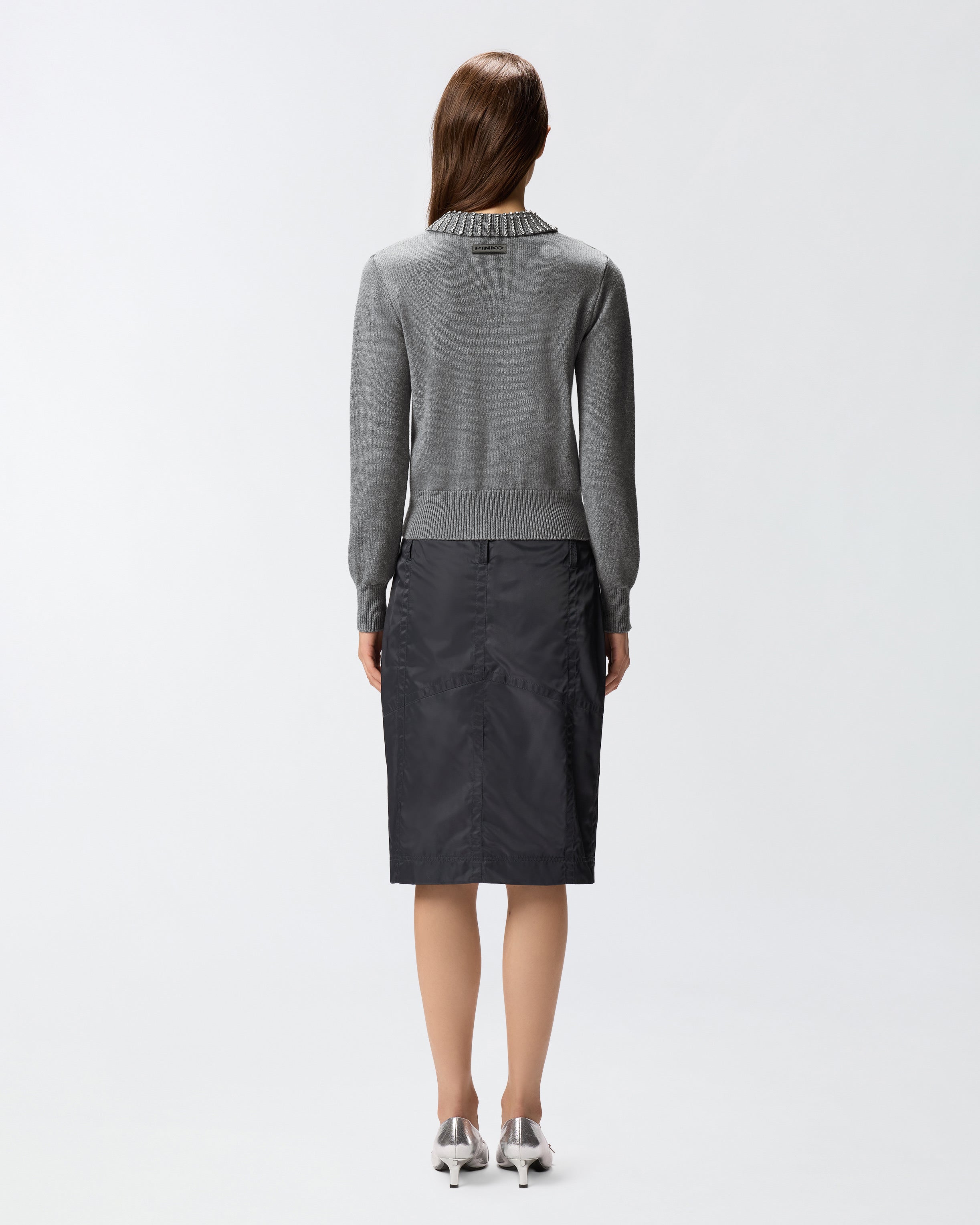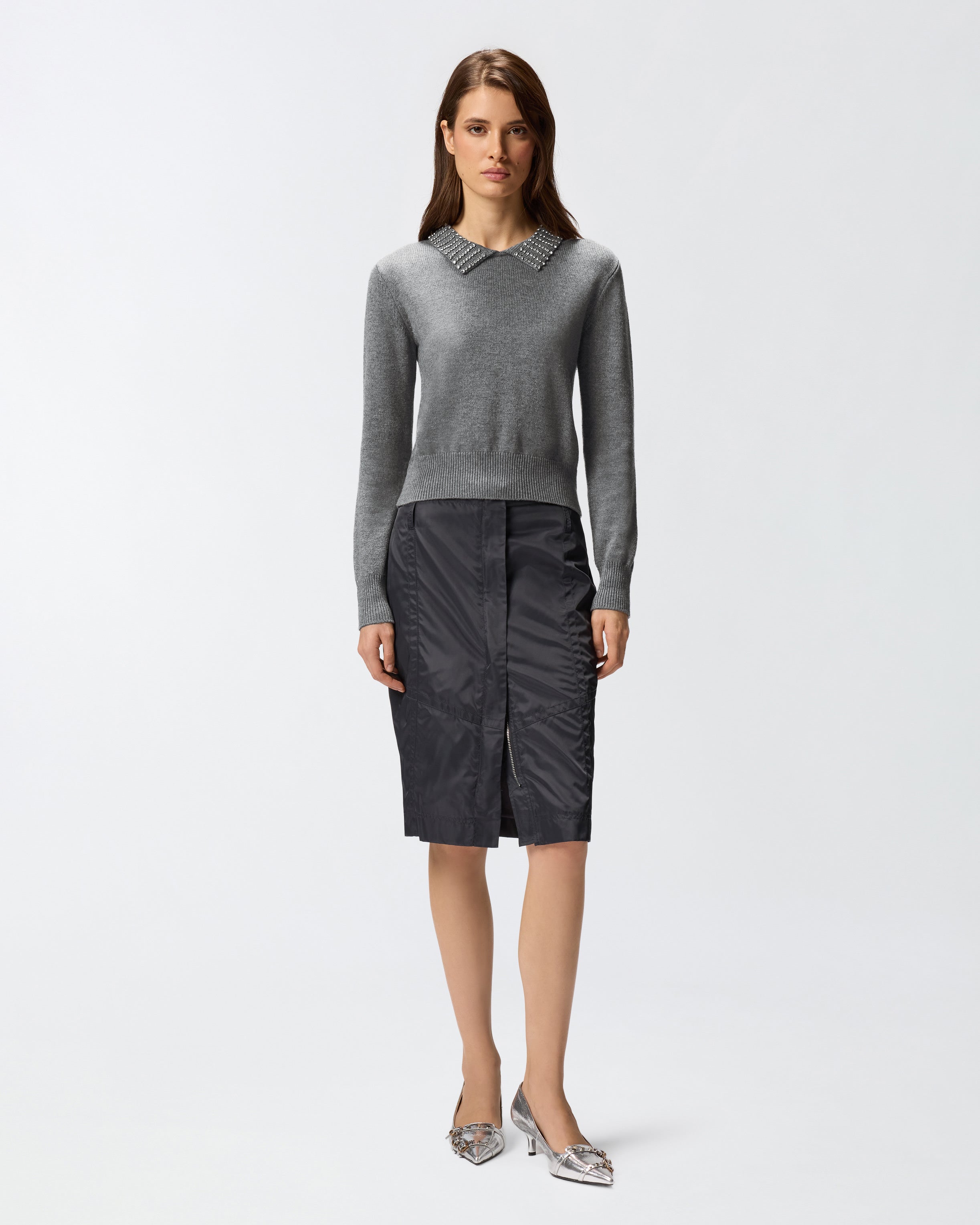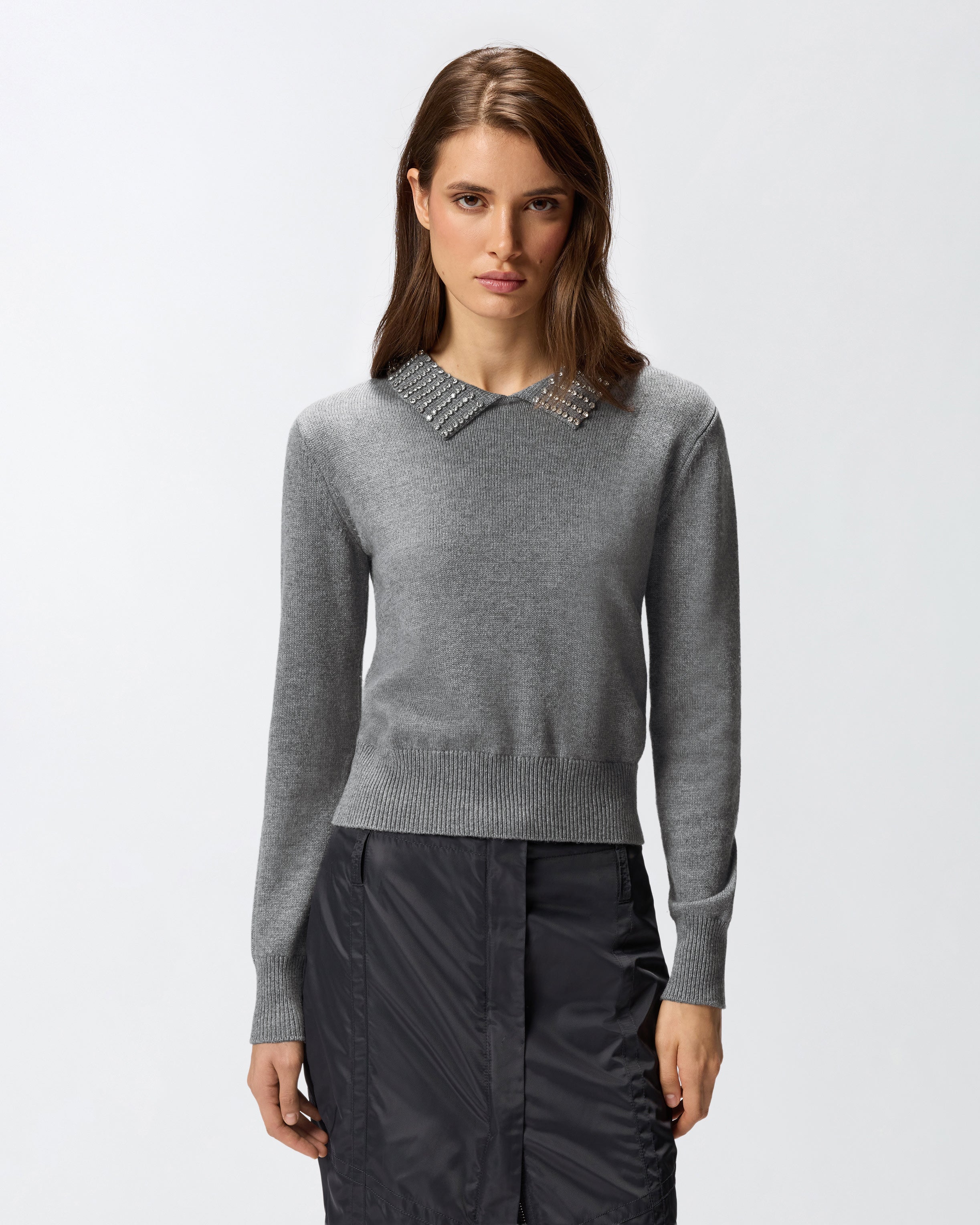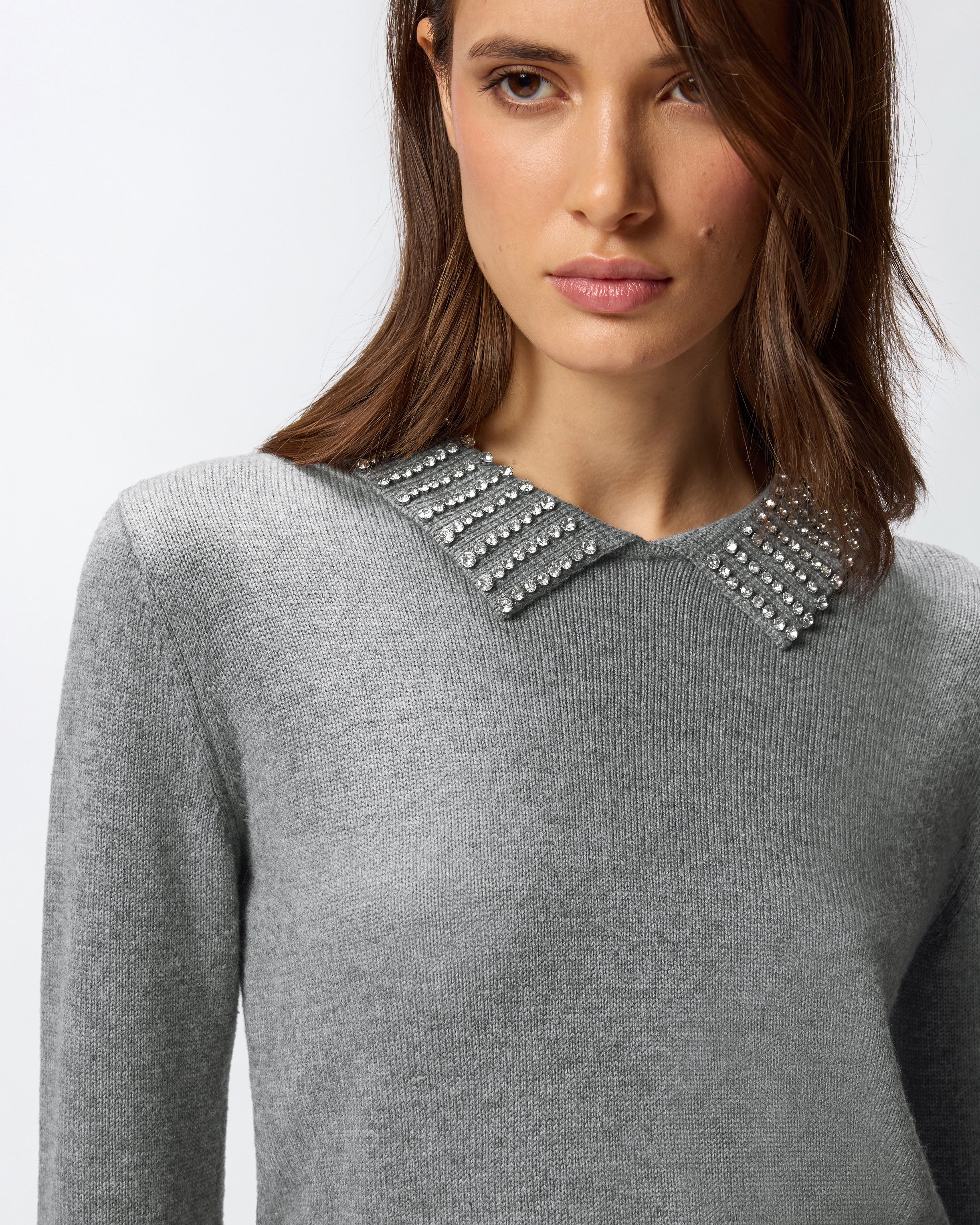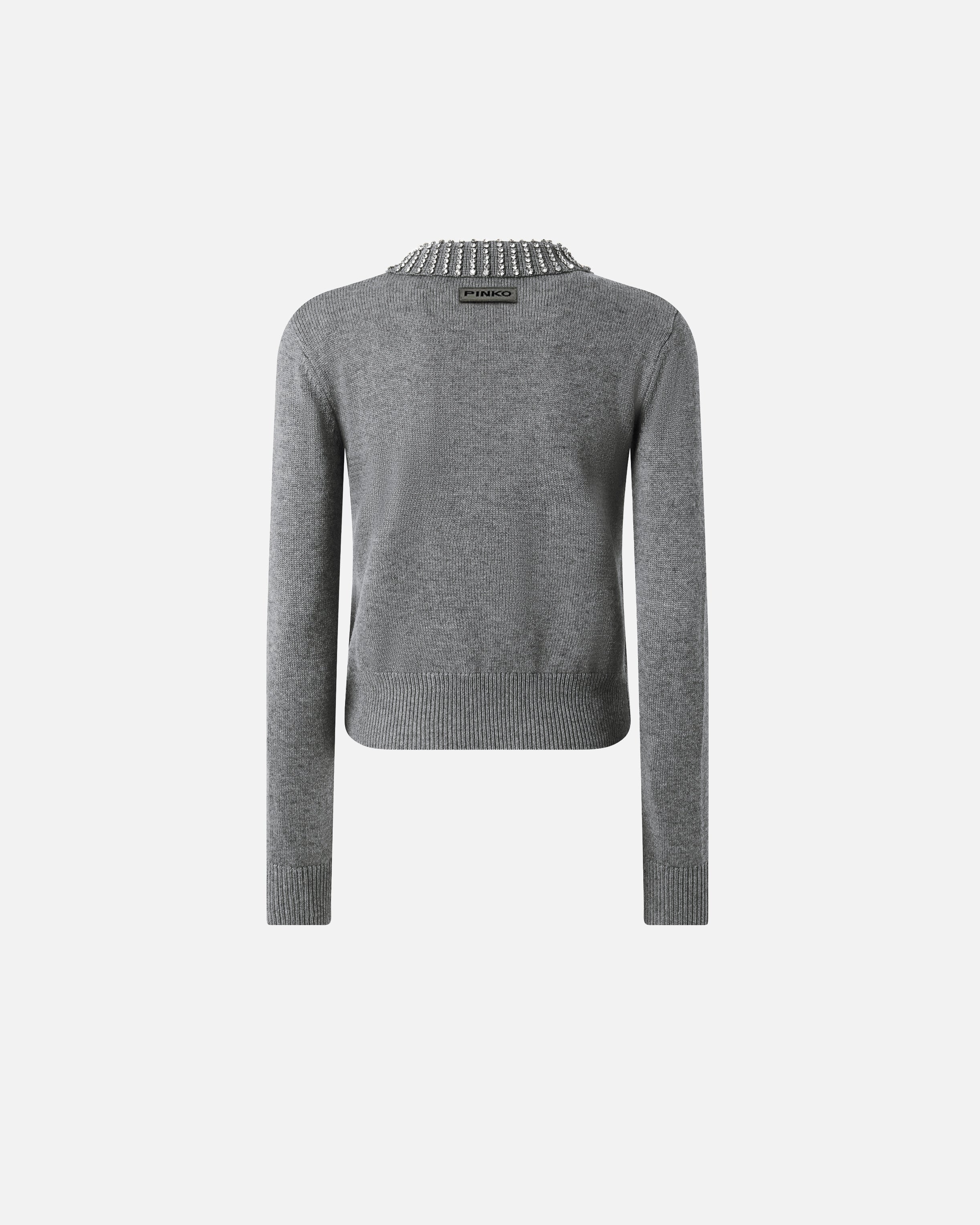 Jersey de manga larga y corte ceñido con cuello estilo polo. El cuello llama la atención de inmediato gracias a las aplicaciones de strass que adornan el diseño. Bajo y puños son de canalé, mientras que en la parte inferior delantera destaca la etiqueta tono sobre tono con el logotipo de letras PINKO. La prenda se ha sometido a pruebas de acabado para minimizar la posible formación de bolitas, garantizando una mayor suavidad y durabilidad del tejido.