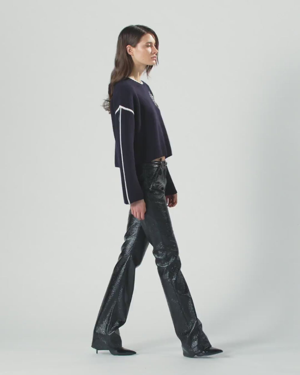 Jersey de cuello redondo y manga larga de lana merina: un hilado suave y ligero para un armario original. Haz que tus looks resulten inimitables con este diseño adornado con el logotipo de letras PINKO en el interior de un bordado en forma de corazón, lleno de luminosos strass. El hilado en contraste en el cuello, las mangas y las sisas aporta un toque llamativo al diseño, mientras que el toque final lo aporta la etiqueta tono sobre tono con el logotipo de letras PINKO detrás del cuello. La prenda se ha sometido a pruebas de acabado para minimizar la posible formación de bolitas, garantizando una mayor suavidad y durabilidad del tejido.