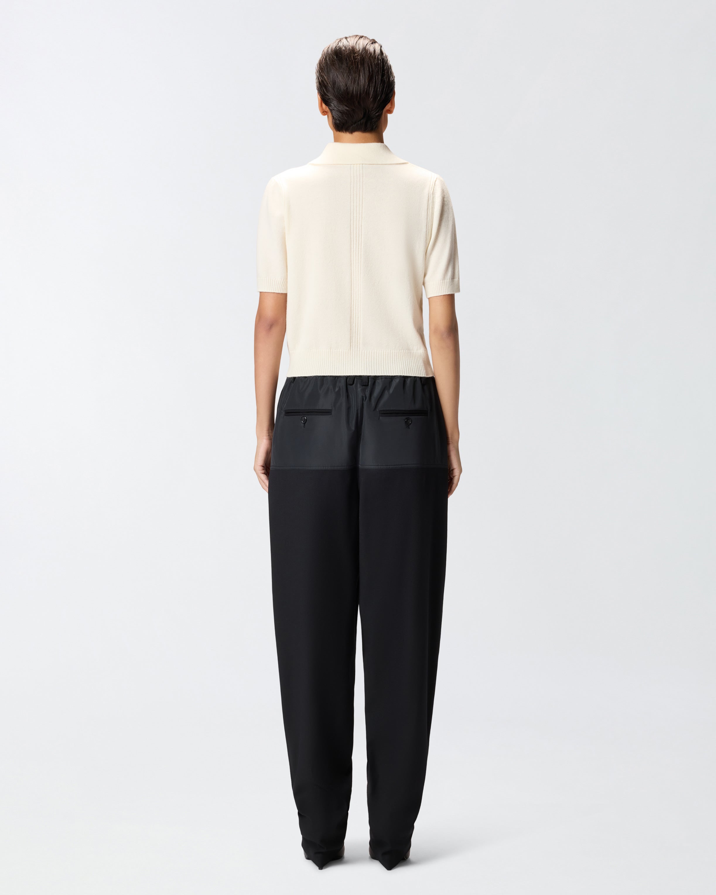Jersey corto estilo polo de línea ceñida en suave hilado de mezcla de lana merina y cachemira. El modelo se completa con los bordes de las mangas y del bajo acanalados y con la etiqueta tono sobre tono con el logotipo de letras PINKO en la parte delantera izquierda. El hilado en contraste realza con elegancia la tapeta de tres botones. La prenda se ha sometido a pruebas de acabado para minimizar la posible formación de bolitas, garantizando una mayor suavidad y durabilidad del tejido. El tejido de calidad y el diseño versátil darán vida a un sinfín de looks.