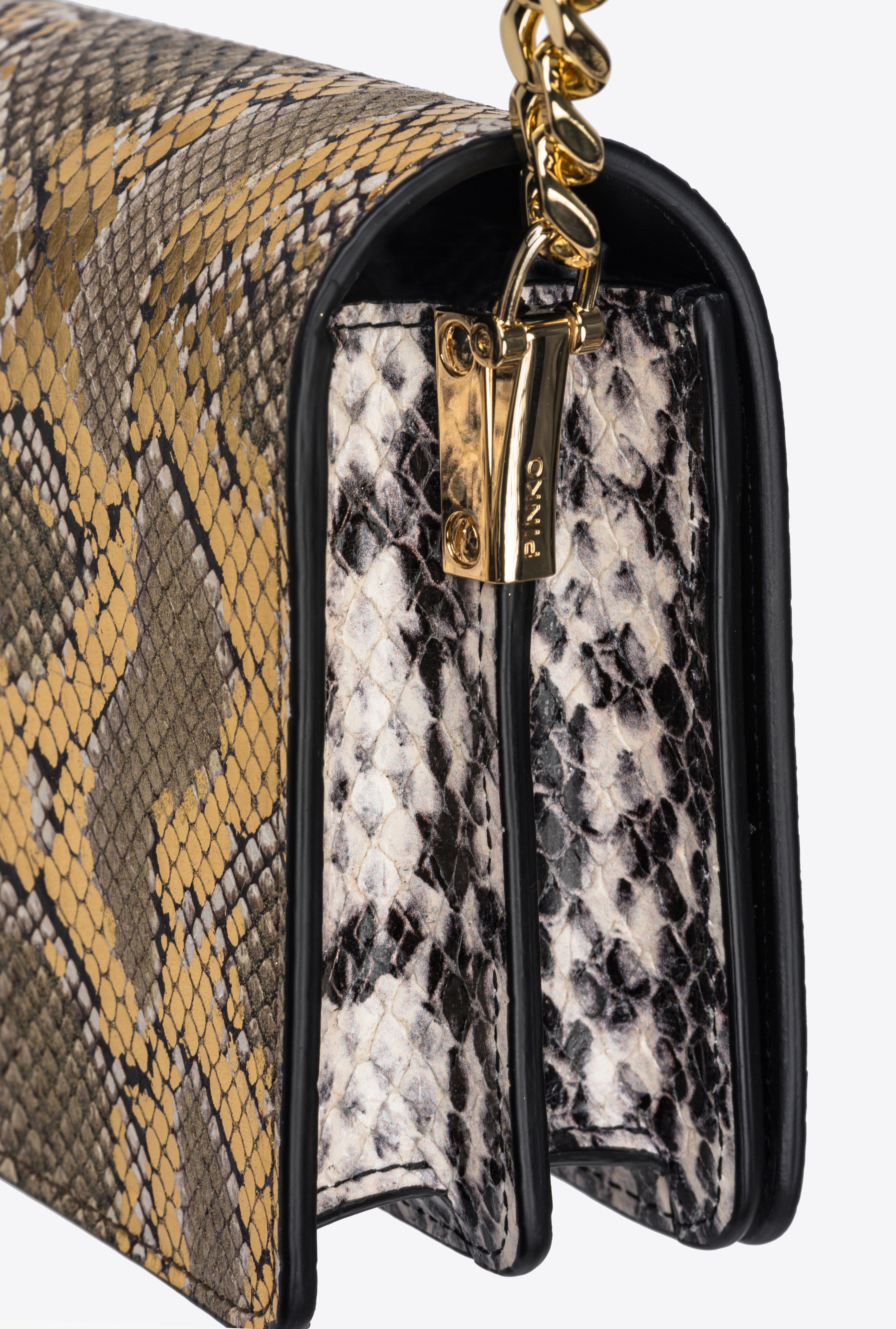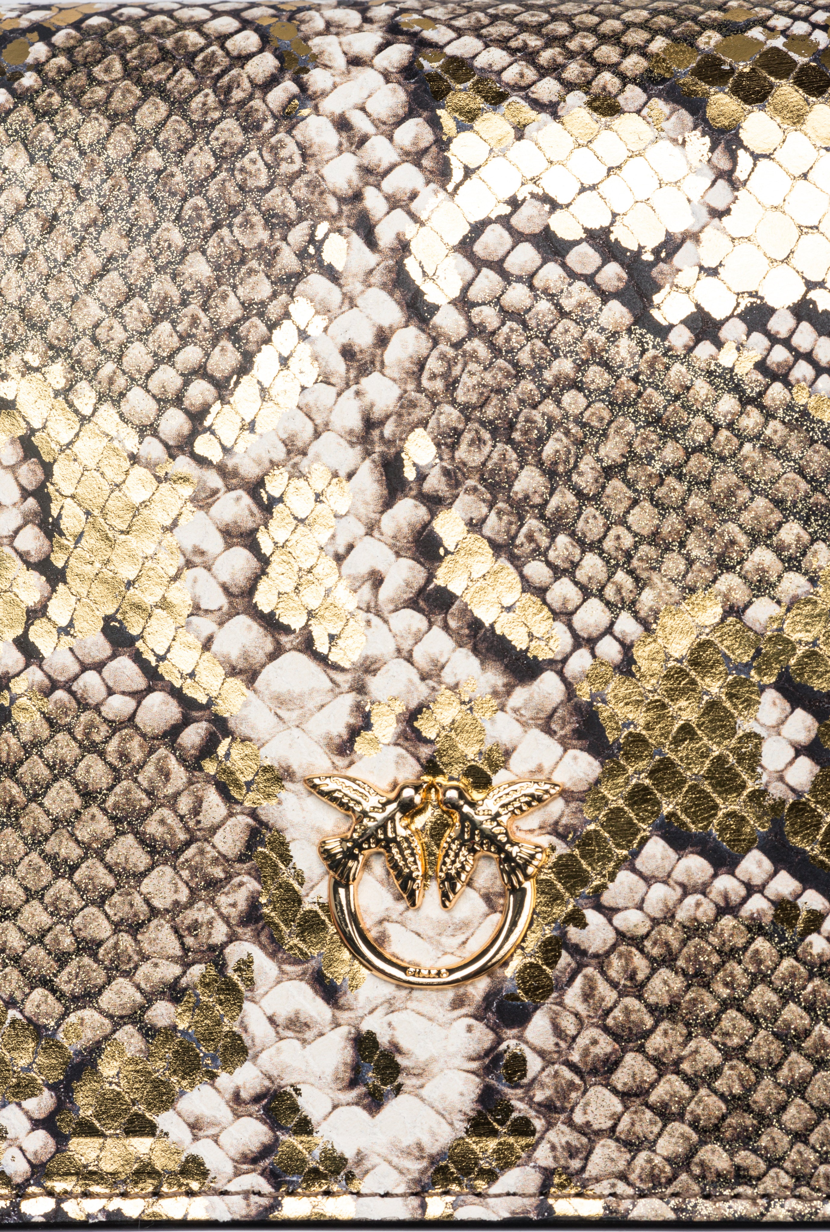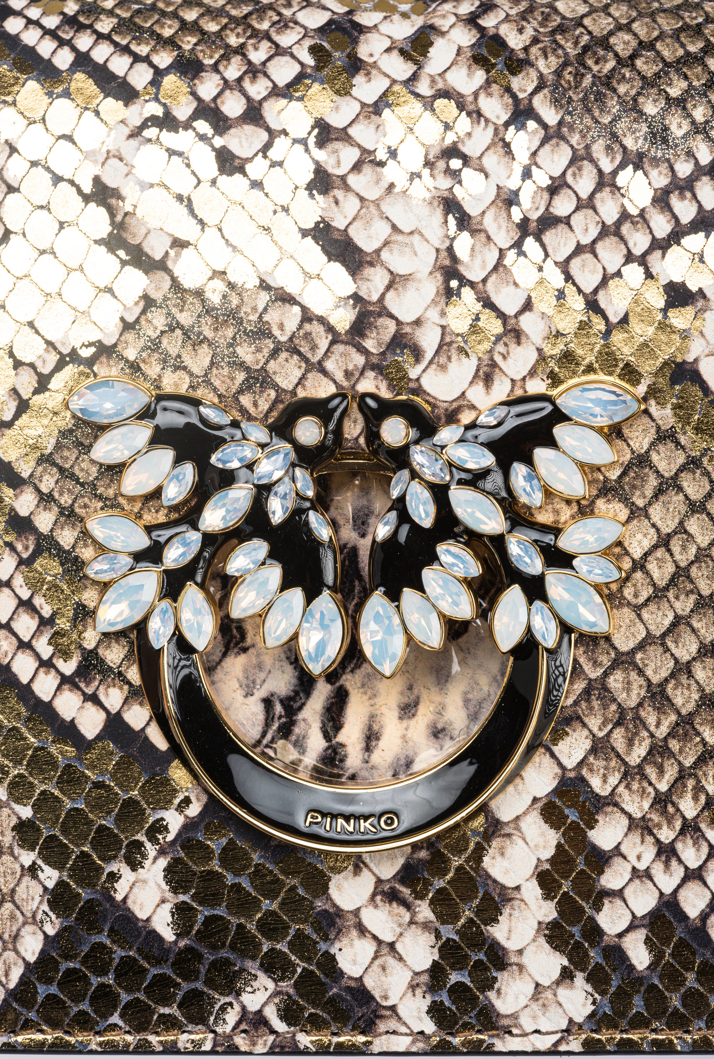 Bolso Mini Love Bag Click de piel con estampado reptil y un particular efecto revestido y laminado en dos materiales. La piel con estampado pitón está realizada en una combinación de blanco y negro a la que se superpone una segunda trama en estampado pitón con laminado en oro, purpurina y manchas en color blanco y negro. El cierre automático oculto se completa con la emblemática hebilla Love Birds Diamond Cut de metal con efecto cut-out y baño dorado con esmalte negro, adornada con pavé de pedrería blanca tornasolada. El interior está forrado en contraste de color e incluye bolsillo interno y panel divisorio con cierre de cremallera. La correa combina la clásica cadena redonda con una práctica hombrera ajustable de piel. El bolso forma parte de la colección cápsula especial de edición limitada creada en exclusiva para PINKO Galleria. ¡Utiliza el chip especial NFC para vivir una experiencia única y específica del bolso que has comprado!