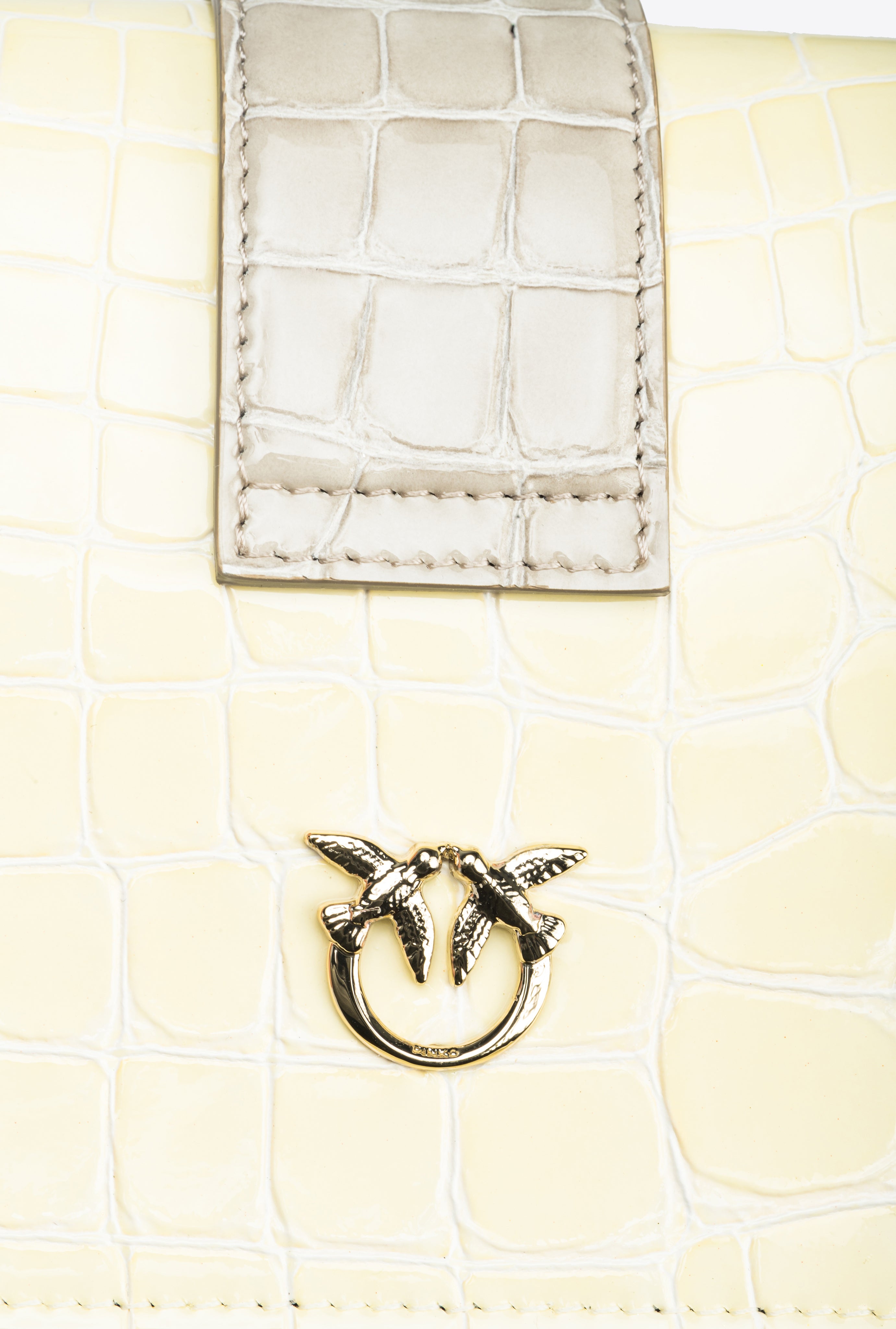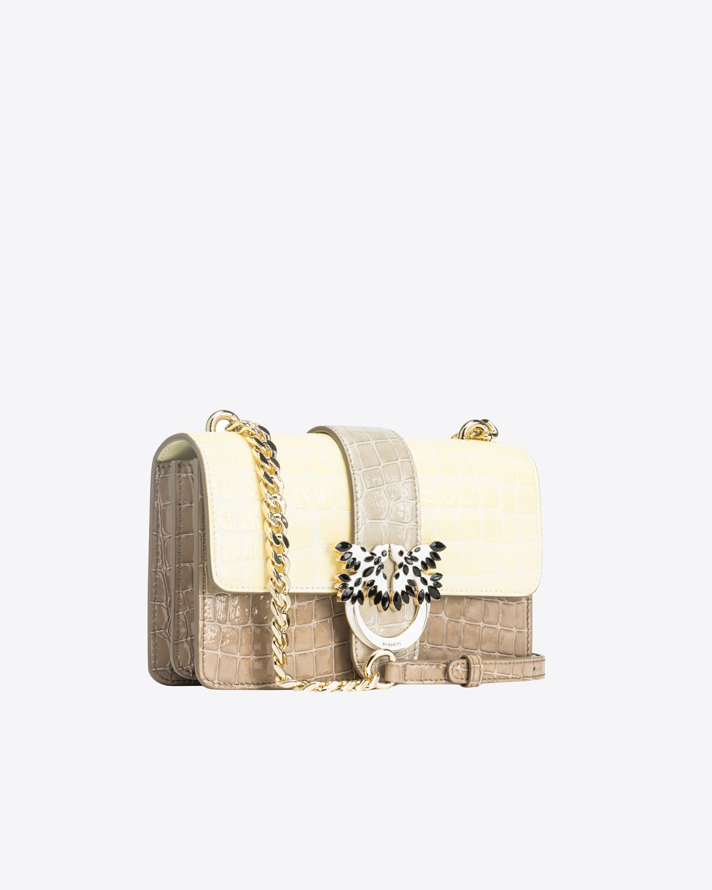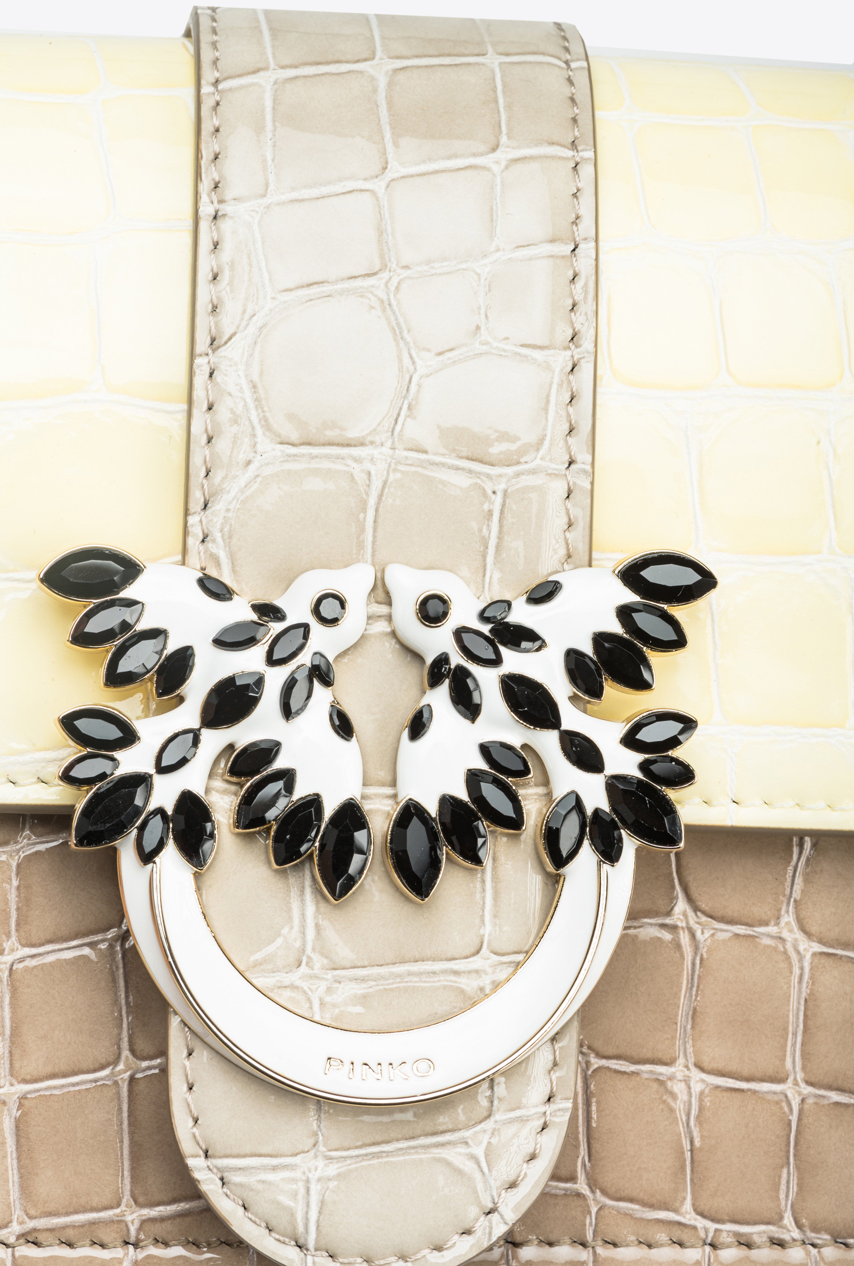Bolso Mini Love Bag One de piel con estampado cocodrilo efecto brillante y ligeramente repujada, en una combinación de dos variantes de color diferentes. El cierre con pasador se completa con la emblemática hebilla Love Birds Diamond Cut de metal bañado en dorado claro con esmalte blanco, adornada con pavé de pedrería negra. El interior está forrado en contraste de color e incluye bolsillo interno y panel divisorio con cierre de cremallera. La correa combina la clásica cadena redonda con una práctica hombrera ajustable de piel. El bolso forma parte de la colección cápsula especial de edición limitada creada en exclusiva para PINKO Galleria. ¡Utiliza el chip especial NFC para vivir una experiencia única y específica del bolso que has comprado!