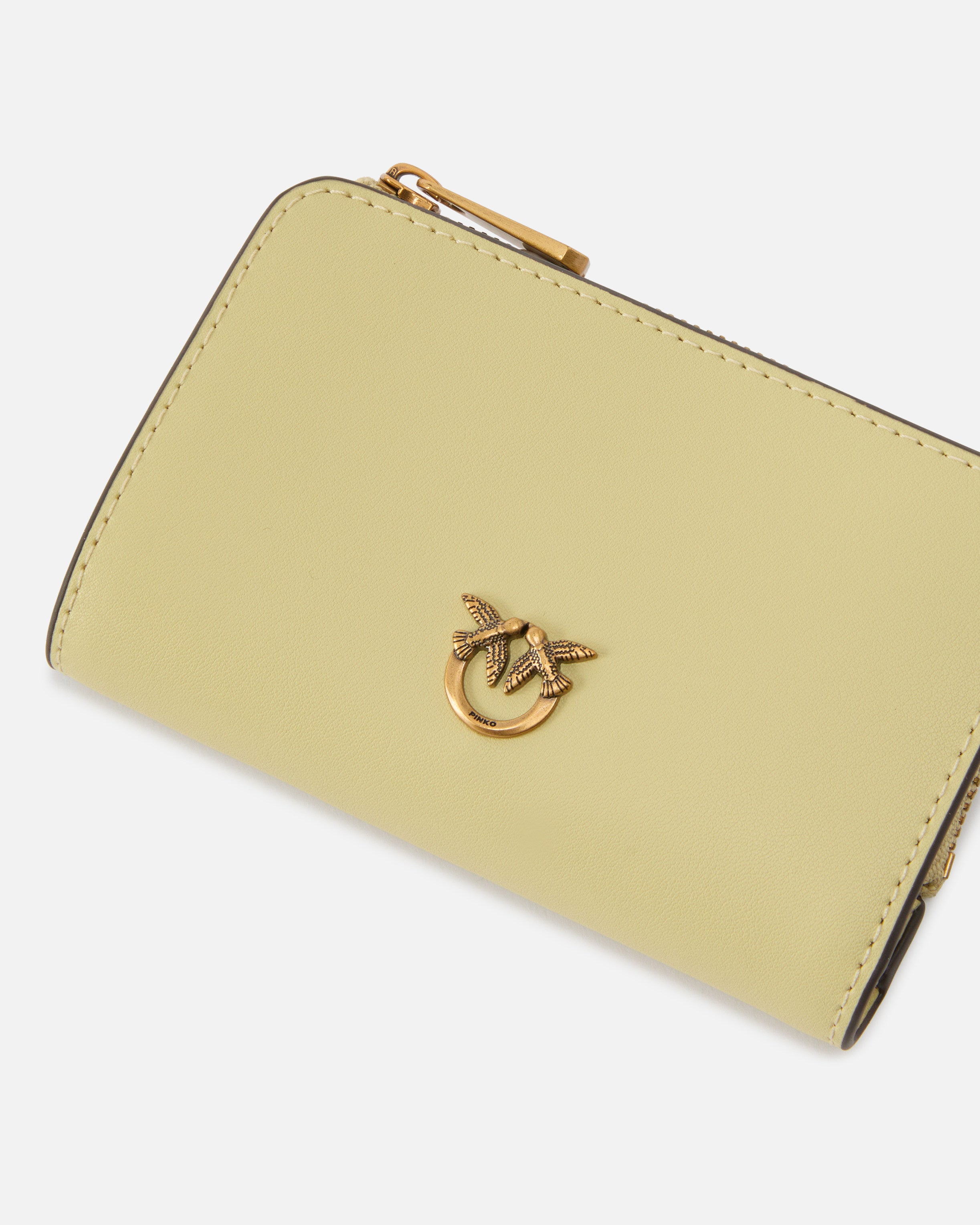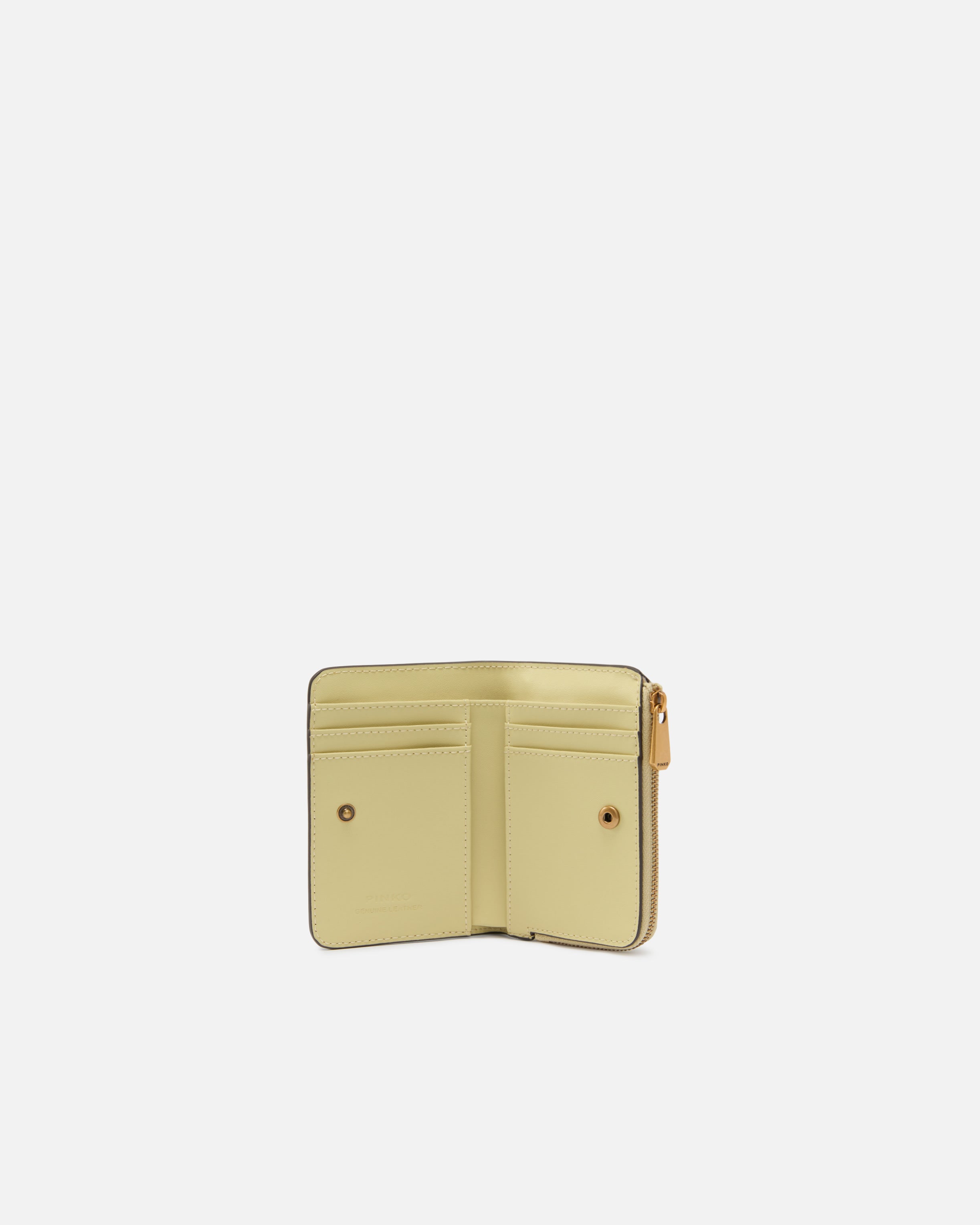 Cartera compacta y multifuncional de tamaño pequeño con forma rectangular realizada en piel suave al tacto con acabado liso. El interior está bien organizado con varios compartimentos para tarjetas y documentos, mientras que el exterior se completa con un compartimento monedero con cierre de cremallera, personalizado con una plaquita de metal que representa el icónico logotipo Love Birds Diamond Cut. La cartera se cierra con un botón interior para mantener su diseño compacto, perfecto incluso para los bolsos más pequeños. ¡Activa tu accesorio PINKO: verifica la autenticidad de tu producto y accede a la experiencia personalizada acercando tu smartphone al bordado Love Birds que encontrarás en la parte posterior! - MINI WALLET