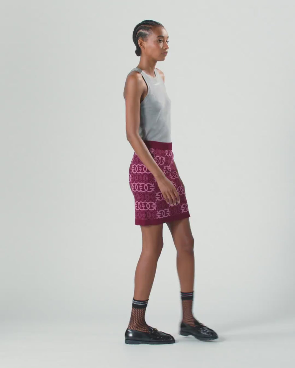 Minifalda de punto caracterizada por un corte ceñido que proporciona una sensación de suavidad agradable al tacto. El modelo presenta una confección de canalé en la cintura para mayor comodidad, mientras que el motivo del logotipo Love Birds en punto jacquard por toda la superficie es el elemento de impacto que enriquece el diseño. Combina esta prenda refinada y versátil con el cárdigan a juego de la misma colección, para lucir un look que no deja nada al azar. La prenda se ha sometido a pruebas de acabado para minimizar la posible formación de bolitas, garantizando una mayor suavidad y durabilidad del tejido.