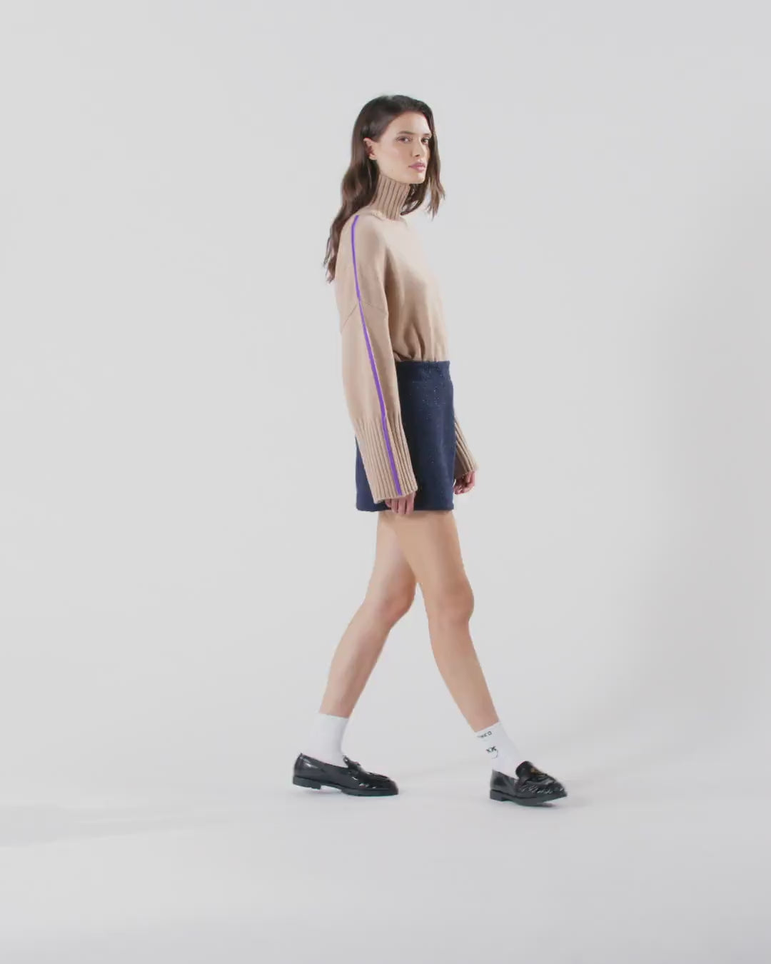 Minifalda de línea trapecio confeccionada en tejido bouclé de mezcla de algodón y lana. La prenda tiene un dobladillo recto, pinzas en la parte posterior para mejorar el diseño y un cierre cruzado adornado con tres botones de metal decorados con estrellas. Perfecta para combinar con la chaqueta trucker del mismo material o con un top ajustado.