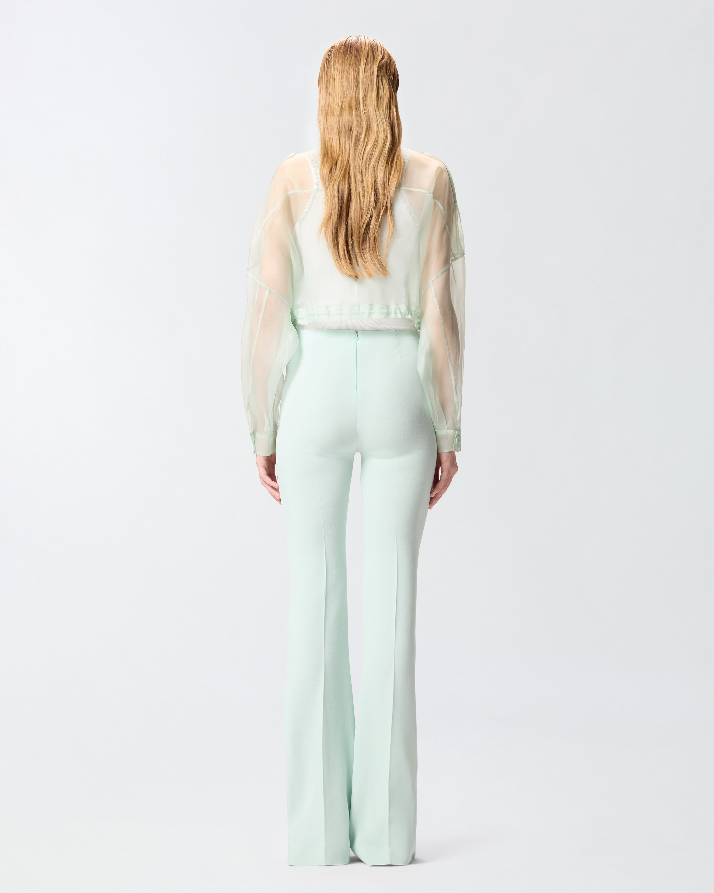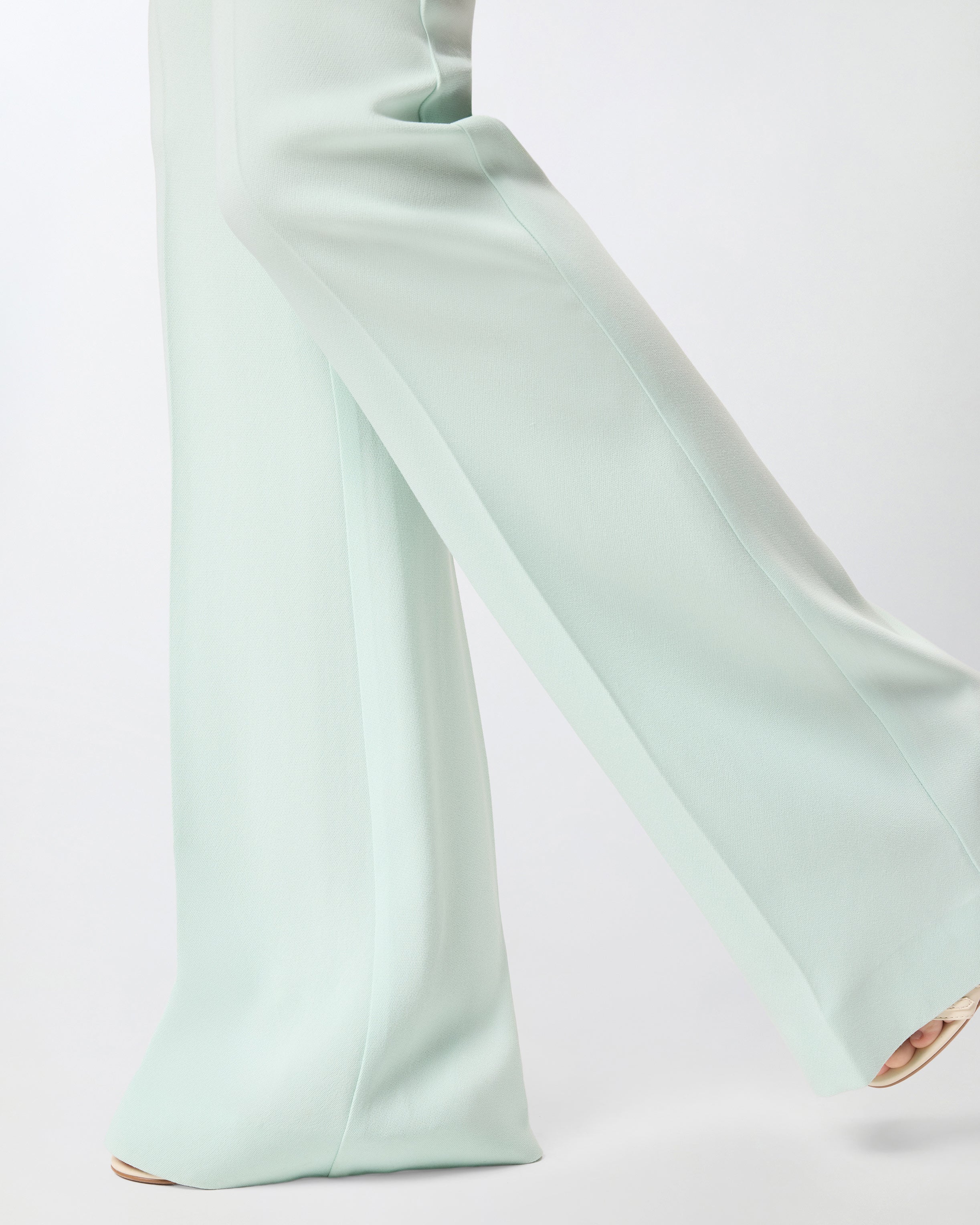 Pantalón confeccionado en viscosa elástica, un tejido icónico que recuerda al clásico cady, caracterizado por un tacto suave y envolvente que se desliza con naturalidad sobre el cuerpo, definiendo la silueta con elegancia y ofreciendo un ajuste impecable. El modelo, con una línea acampanada que realza la figura, presenta un elegante pliegue planchado central en la parte delantera y trasera y un cierre con cremallera en la parte trasera. Combina los pantalones con la chaqueta del mismo color para lucir un traje elegante en ceremonias y ocasiones especiales.