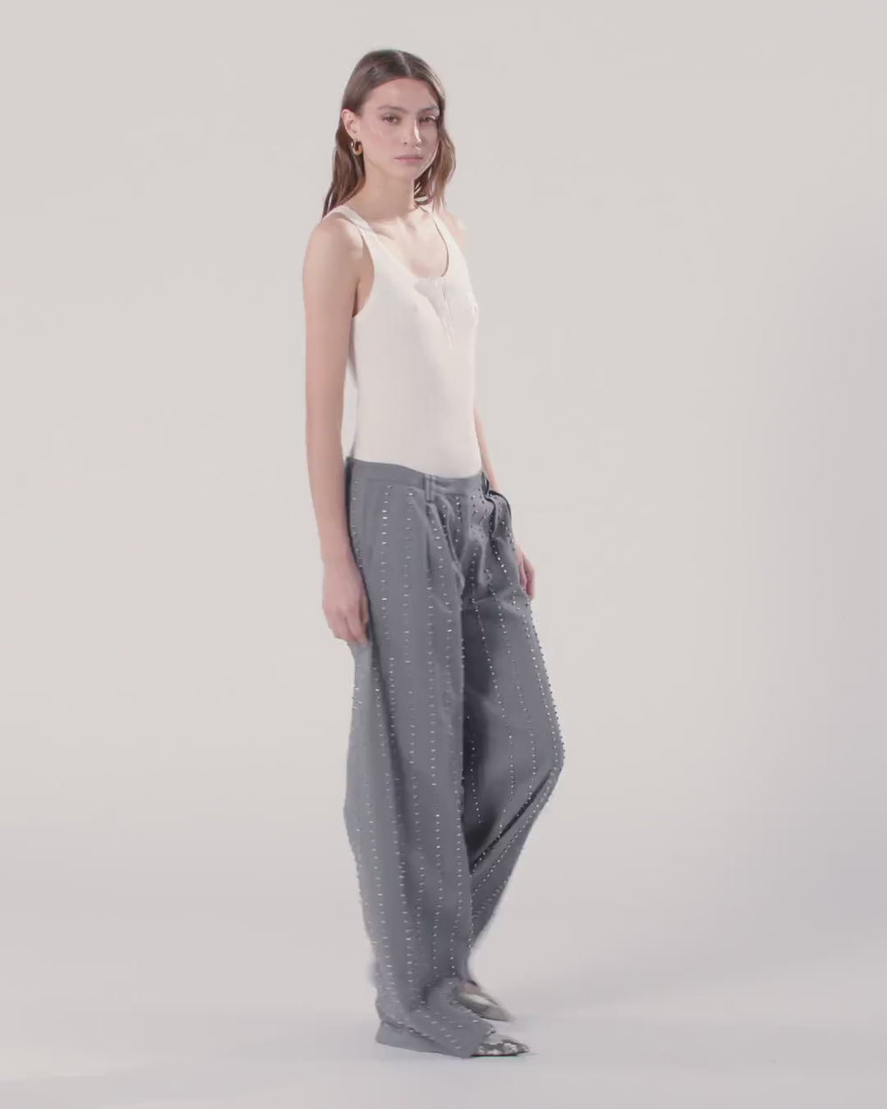Pantalón confeccionado en sarga de puro algodón de aspecto grueso y fluido, con bolsillos laterales, bolsillos traseros ribeteados y refinadas pinzas en la parte delantera. La prenda se presenta como una verdadera joya gracias al original diseño de rayas inspirado en el motivo de rayas diplomáticas obtenido gracias a la alternancia de pequeños elementos metálicos en forma de cubo y cristales engastados bordados a mano. El modelo está forrado para garantizar una mayor comodidad al llevarlo. - PENNY TROUSERS