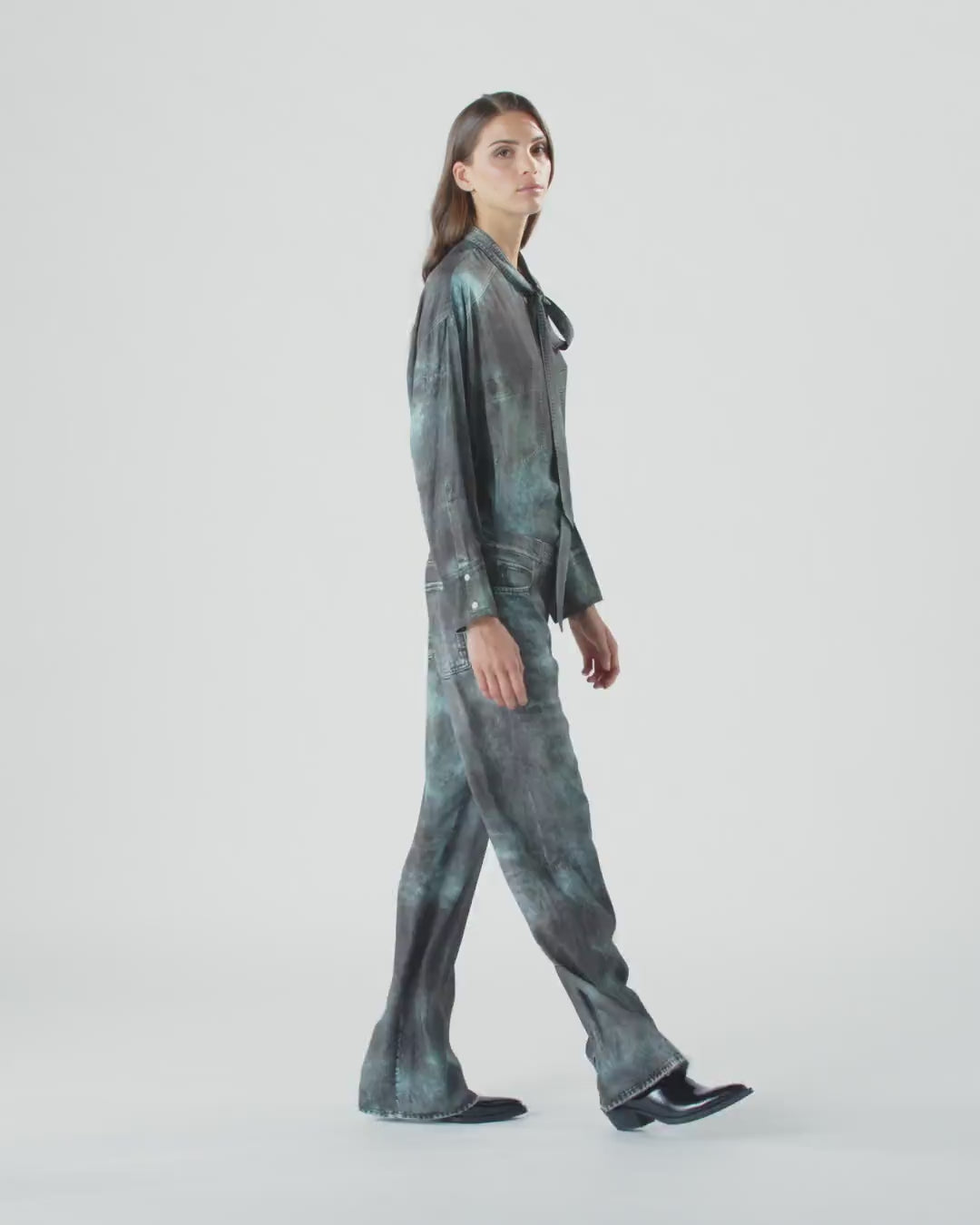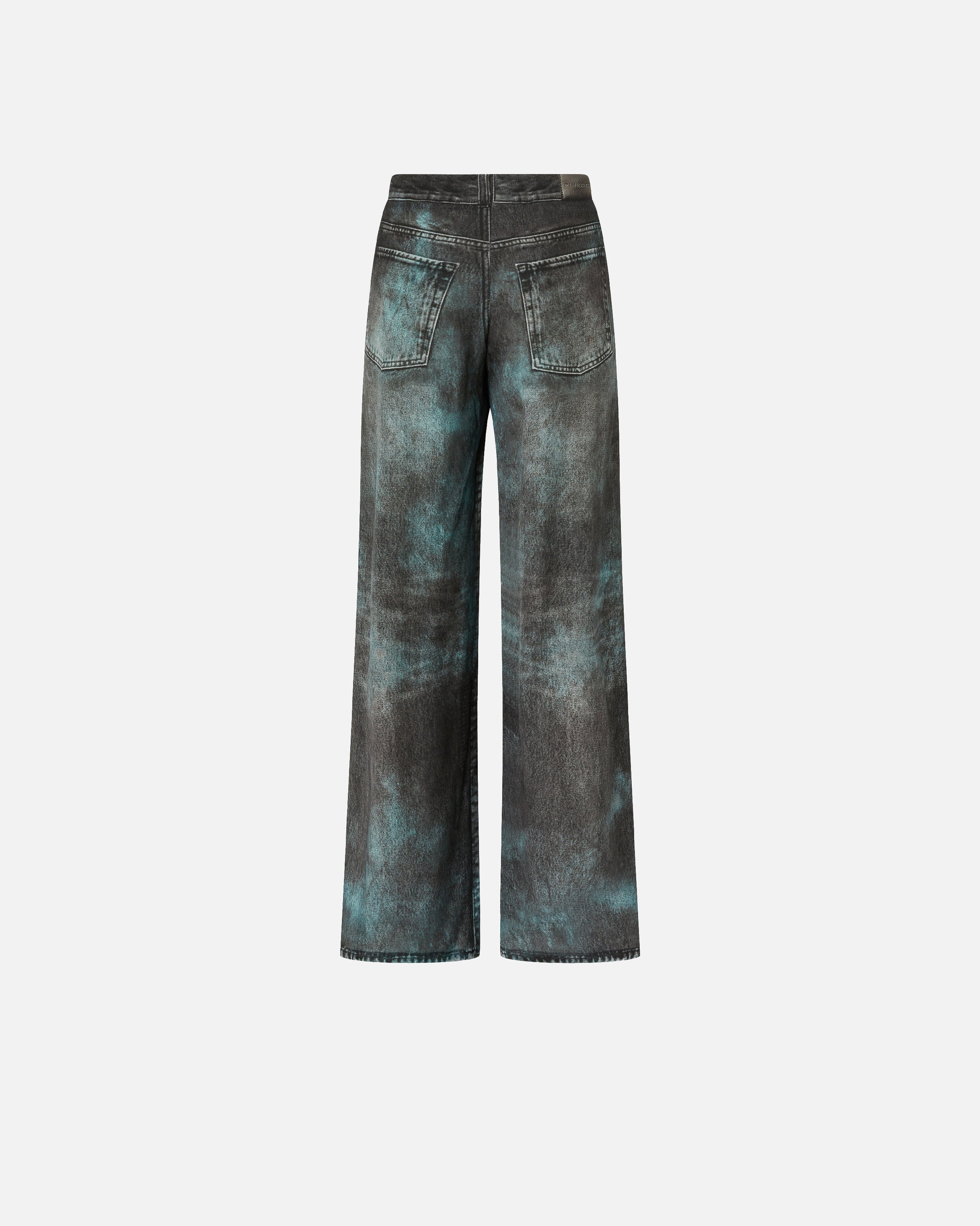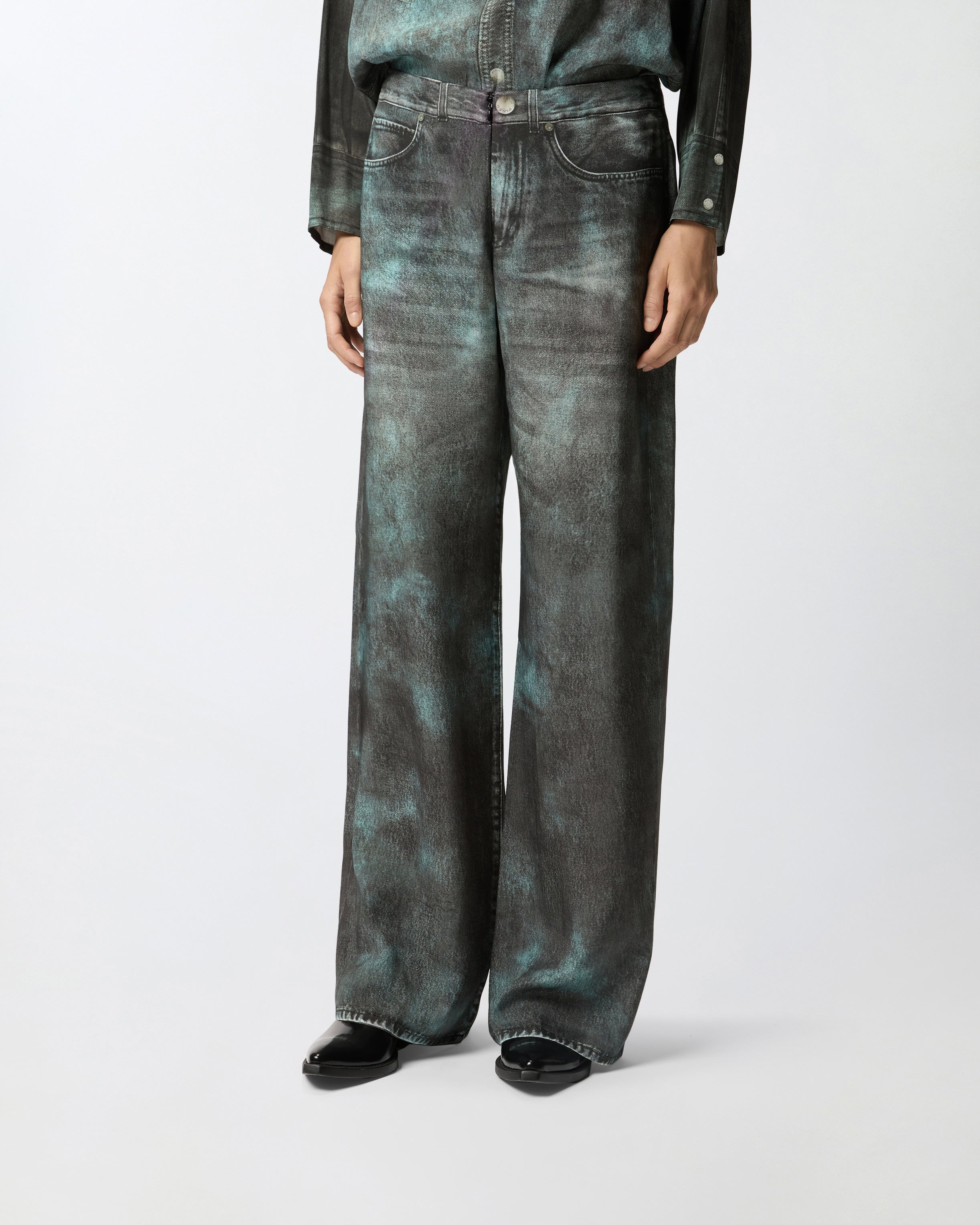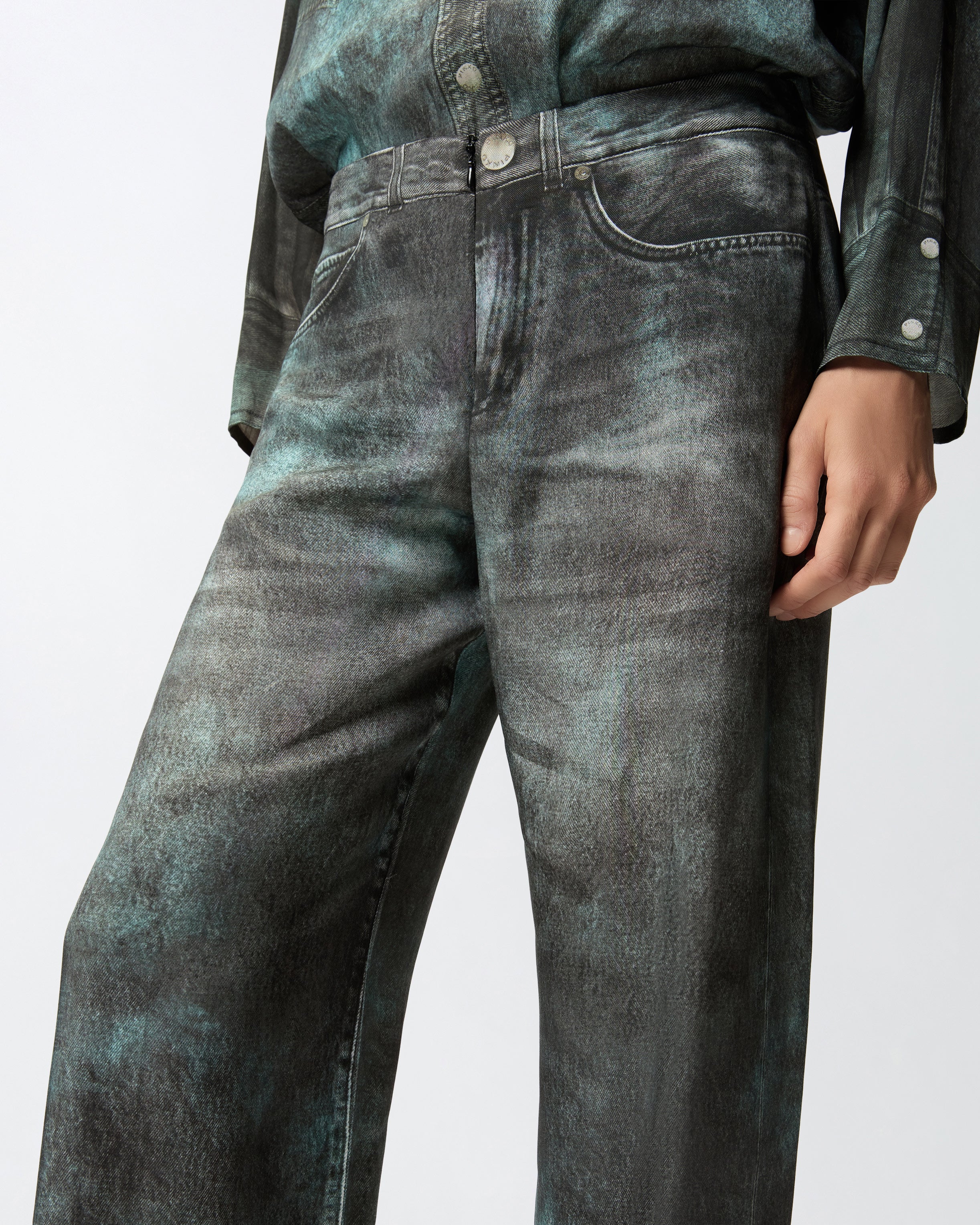 Pantalones largos de pernera ancha con cierre frontal discreto con corchete y cremallera. La prenda está confeccionada en sarga de viscosa de tacto fluido y adquiere tridimensionalidad gracias al sofisticado estampado con efecto óptico, que crea la ilusión de un tejido denim con efecto mal teñido y que reproduce los elementos típicos de los vaqueros. Convierte tu conjunto en una obra de arte y luce estos pantalones con la camisa a juego para crear un look coordinado original que no te dejará pasar desapercibida.