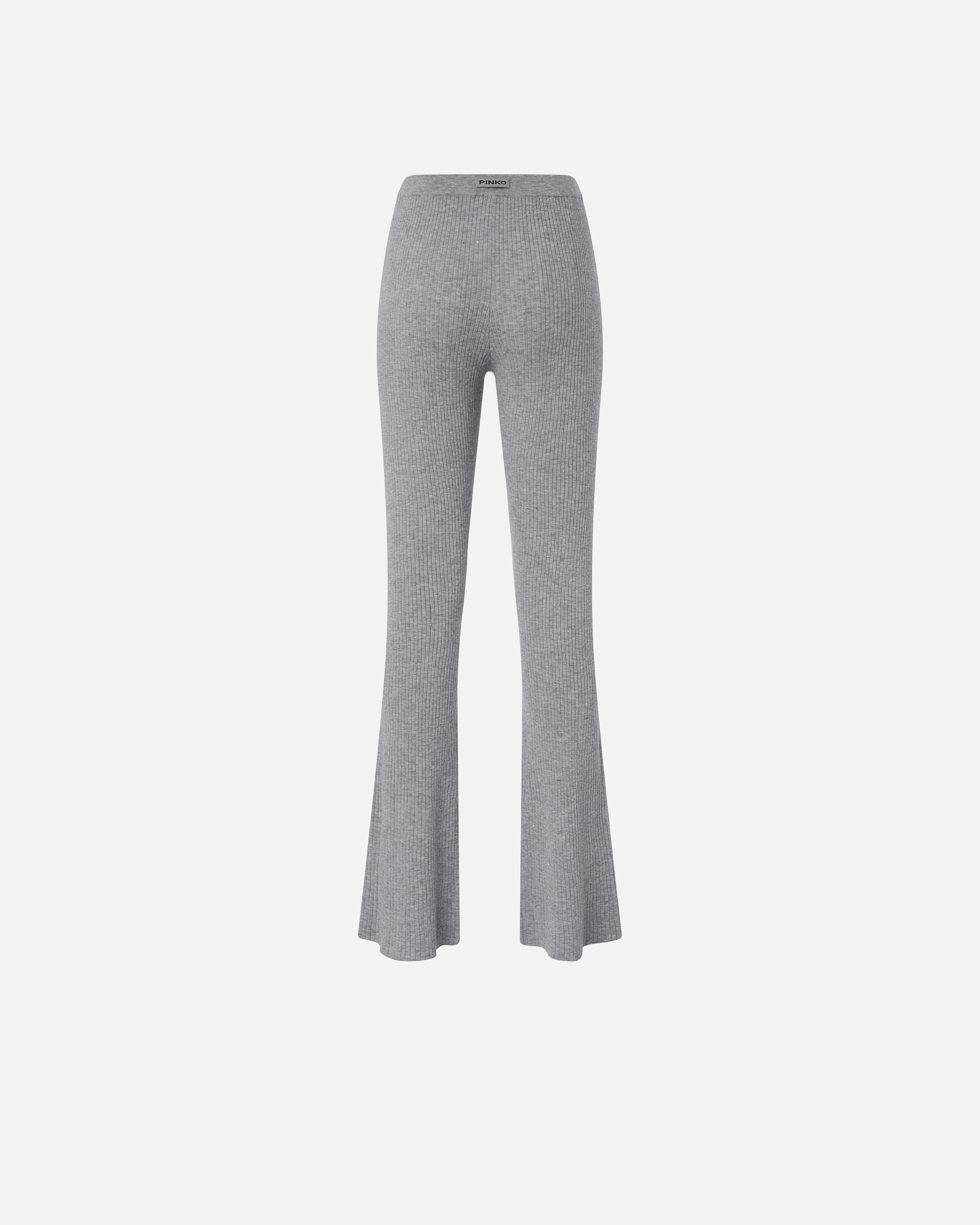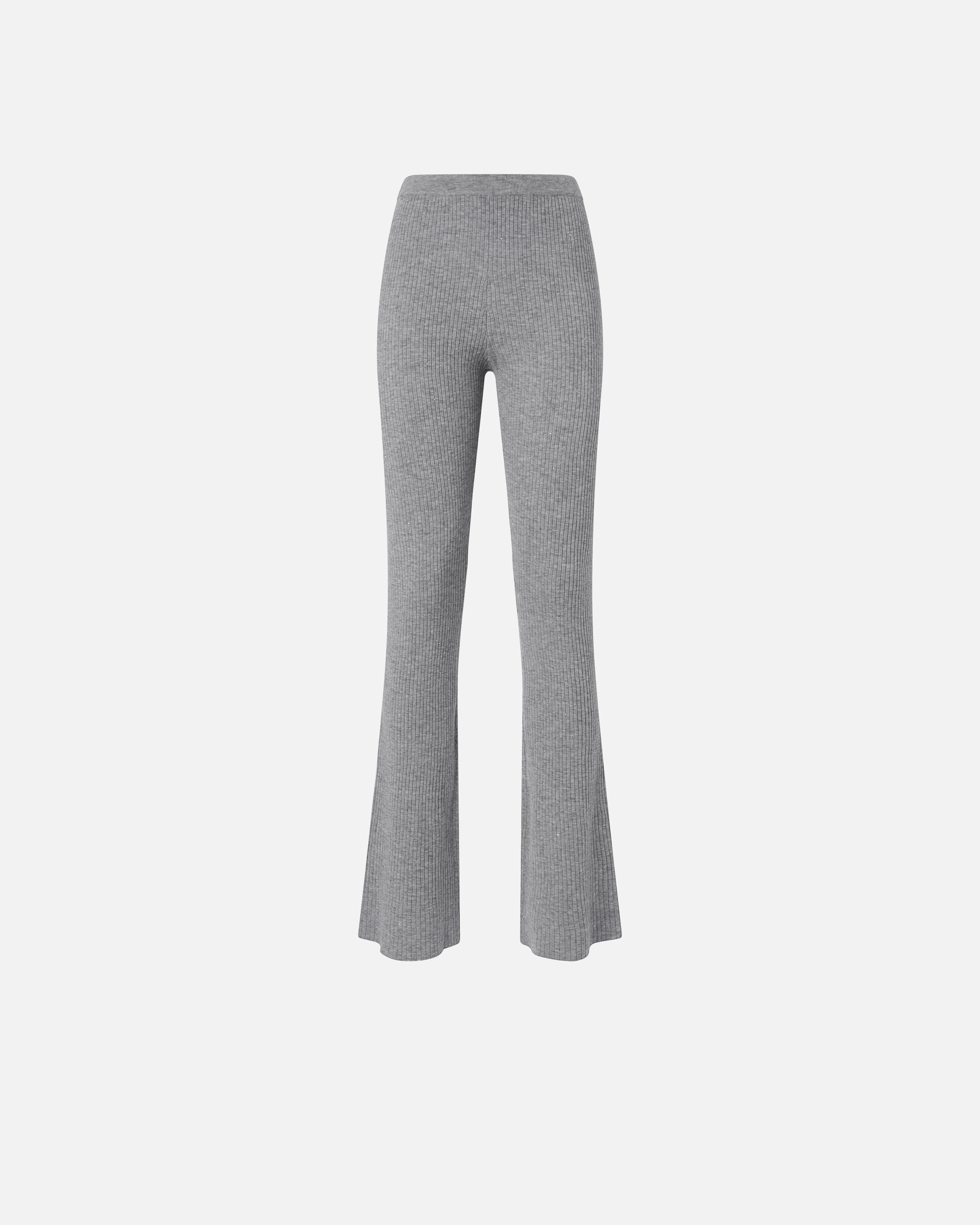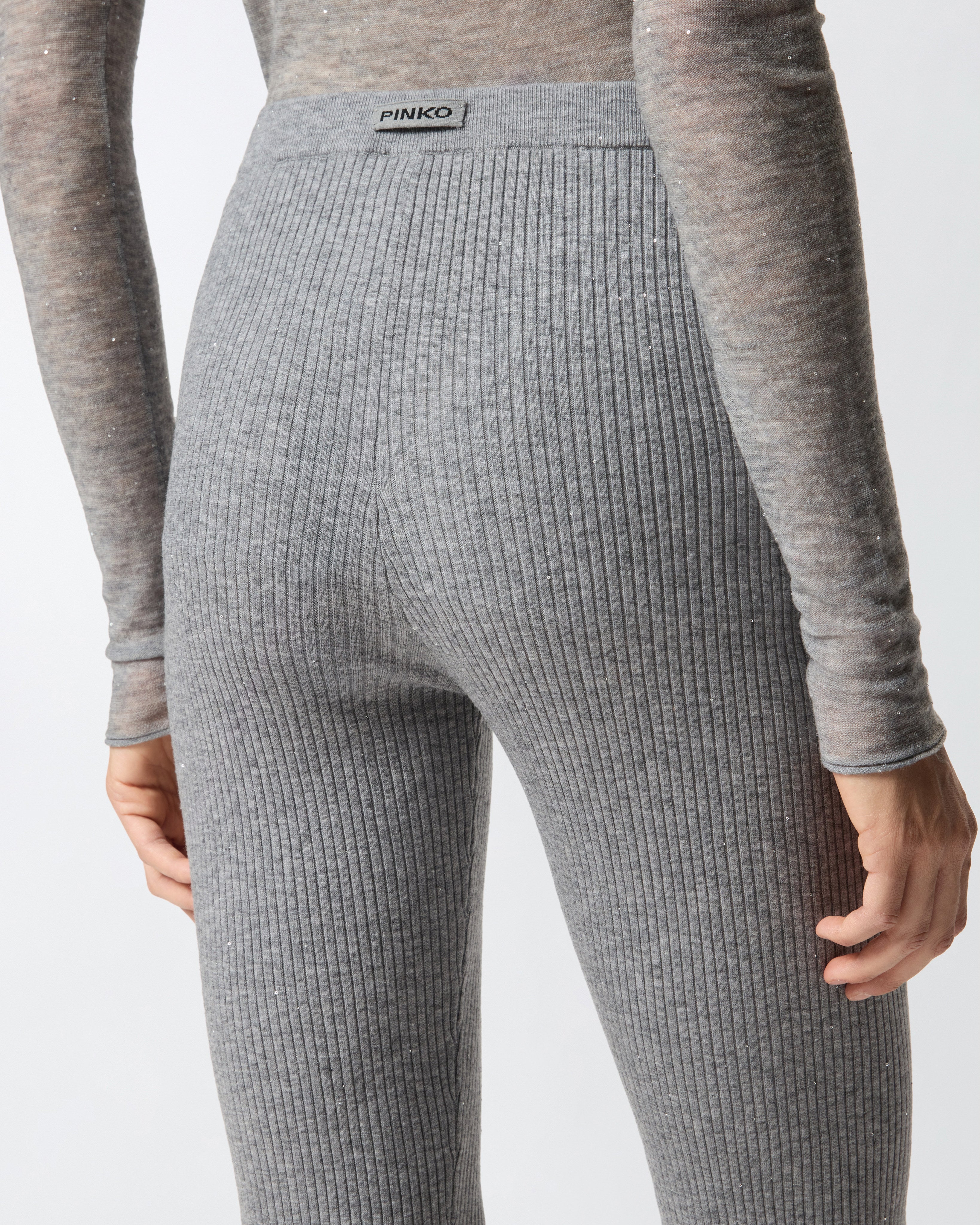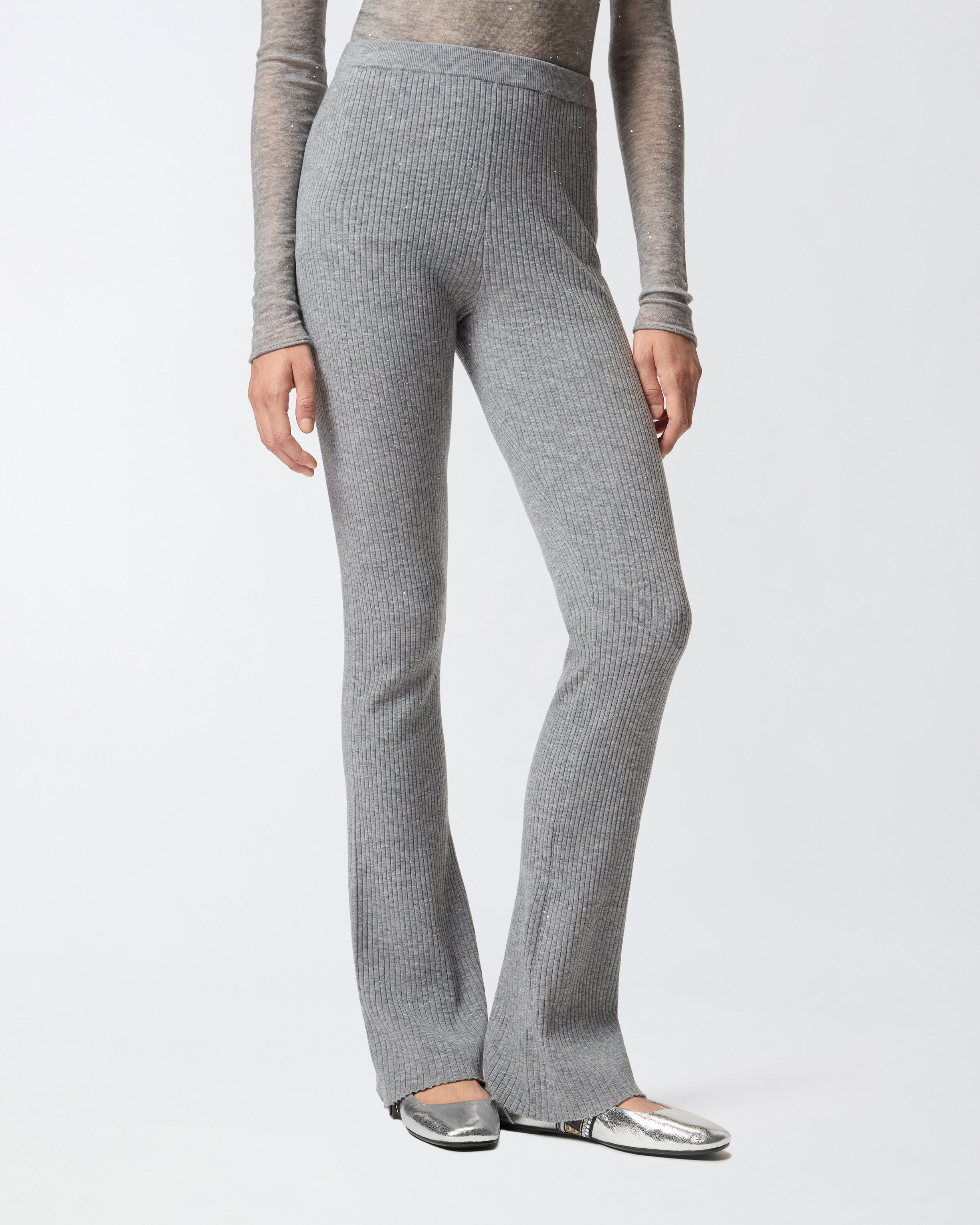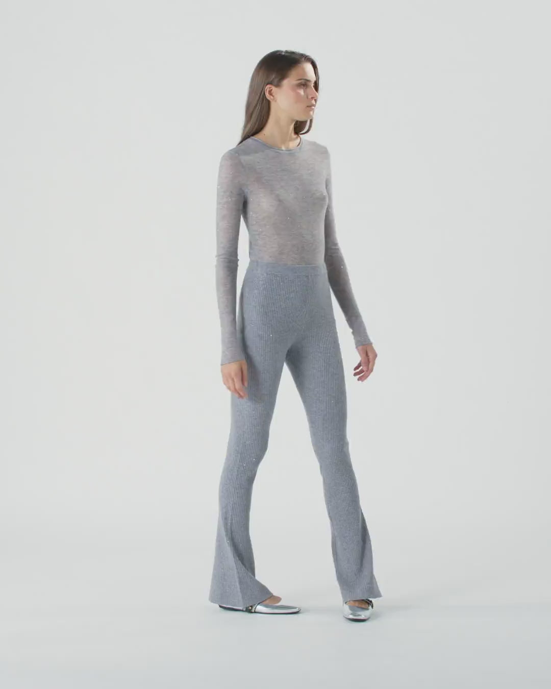 Pantalón largo confeccionado en suave punto de canalé vertical con cintura alta. El modelo de hilado de punto ultrafino brilla con las delicadas microlentejuelas que cubren la superficie y se completa con el corte acampanado en el bajo. La prenda se ha sometido a pruebas de acabado para minimizar la posible formación de bolitas, garantizando una mayor suavidad y durabilidad del tejido. La elección ideal para un look cómodo que no hace concesiones en términos de elegancia.